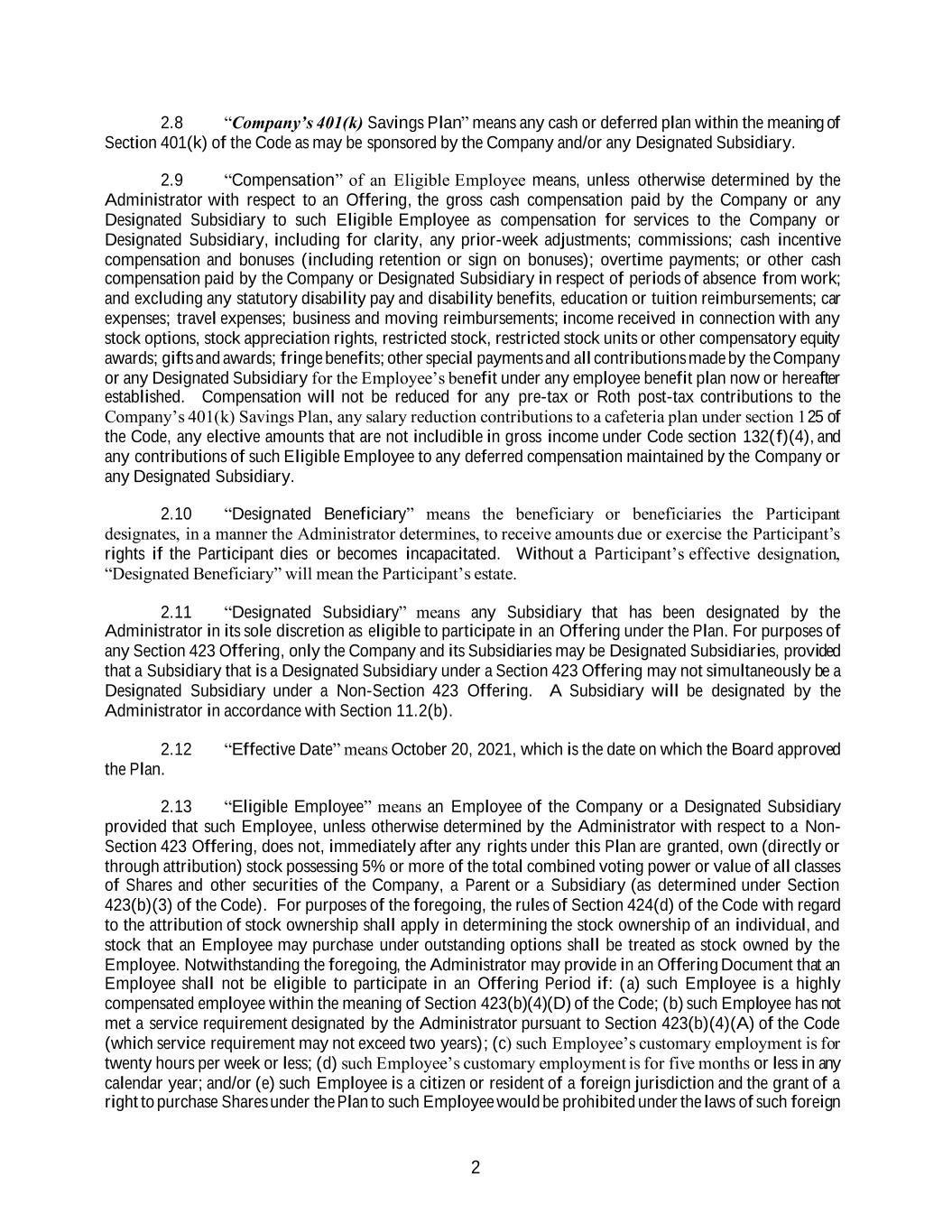 2 2.8 “Company’s 401(k) Savings Plan” means any cash or deferred plan within the meaning of Section 401(k) of the Code as may be sponsored by the Company and/or any Designated Subsidiary. 2.9 “Compensation” of an Eligible Employee means, unless otherwise determined by the Administrator with respect to an Offering, the gross cash compensation paid by the Company or any Designated Subsidiary to such Eligible Employee as compensation for services to the Company or Designated Subsidiary, including for clarity, any prior-week adjustments; commissions; cash incentive compensation and bonuses (including retention or sign on bonuses); overtime payments; or other cash compensation paid by the Company or Designated Subsidiary in respect of periods of absence from work; and excluding any statutory disability pay and disability benefits, education or tuition reimbursements; car expenses; travel expenses; business and moving reimbursements; income received in connection with any stock options, stock appreciation rights, restricted stock, restricted stock units or other compensatory equity awards; gifts and awards; fringe benefits; other special payments and all contributions made by the Company or any Designated Subsidiary for the Employee’s benefit under any employee benefit plan now or hereafter established. Compensation will not be reduced for any pre-tax or Roth post-tax contributions to the Company’s 401(k) Savings Plan, any salary reduction contributions to a cafeteria plan under section 125 of the Code, any elective amounts that are not includible in gross income under Code section 132(f)(4), and any contributions of such Eligible Employee to any deferred compensation maintained by the Company or any Designated Subsidiary. 2.10 “Designated Beneficiary” means the beneficiary or beneficiaries the Participant designates, in a manner the Administrator determines, to receive amounts due or exercise the Participant’s rights if the Participant dies or becomes incapacitated. Without a Participant’s effective designation, “Designated Beneficiary” will mean the Participant’s estate. 2.11 “Designated Subsidiary” means any Subsidiary that has been designated by the Administrator in its sole discretion as eligible to participate in an Offering under the Plan. For purposes of any Section 423 Offering, only the Company and its Subsidiaries may be Designated Subsidiaries, provided that a Subsidiary that is a Designated Subsidiary under a Section 423 Offering may not simultaneously be a Designated Subsidiary under a Non-Section 423 Offering. A Subsidiary will be designated by the Administrator in accordance with Section 11.2(b). 2.12 “Effective Date” means October 20, 2021, which is the date on which the Board approved the Plan. 2.13 “Eligible Employee” means an Employee of the Company or a Designated Subsidiary provided that such Employee, unless otherwise determined by the Administrator with respect to a Non- Section 423 Offering, does not, immediately after any rights under this Plan are granted, own (directly or through attribution) stock possessing 5% or more of the total combined voting power or value of all classes of Shares and other securities of the Company, a Parent or a Subsidiary (as determined under Section 423(b)(3) of the Code). For purposes of the foregoing, the rules of Section 424(d) of the Code with regard to the attribution of stock ownership shall apply in determining the stock ownership of an individual, and stock that an Employee may purchase under outstanding options shall be treated as stock owned by the Employee. Notwithstanding the foregoing, the Administrator may provide in an Offering Document that an Employee shall not be eligible to participate in an Offering Period if: (a) such Employee is a highly compensated employee within the meaning of Section 423(b)(4)(D) of the Code; (b) such Employee has not met a service requirement designated by the Administrator pursuant to Section 423(b)(4)(A) of the Code (which service requirement may not exceed two years); (c) such Employee’s customary employment is for twenty hours per week or less; (d) such Employee’s customary employment is for five months or less in any calendar year; and/or (e) such Employee is a citizen or resident of a foreign jurisdiction and the grant of a right to purchase Shares under the Plan to such Employee would be prohibited under the laws of such foreign