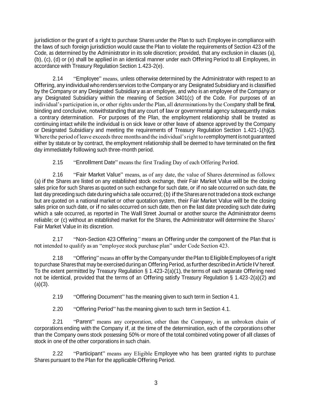 3 jurisdiction or the grant of a right to purchase Shares under the Plan to such Employee in compliance with the laws of such foreign jurisdiction would cause the Plan to violate the requirements of Section 423 of the Code, as determined by the Administrator in its sole discretion; provided, that any exclusion in clauses (a), (b), (c), (d) or (e) shall be applied in an identical manner under each Offering Period to all Employees, in accordance with Treasury Regulation Section 1.423-2(e). 2.14 “Employee” means, unless otherwise determined by the Administrator with respect to an Offering, any individual who renders services to the Company or any Designated Subsidiary and is classified by the Company or any Designated Subsidiary as an employee, and who is an employee of the Company or any Designated Subsidiary within the meaning of Section 3401(c) of the Code. For purposes of an individual’s participation in, or other rights under the Plan, all determinations by the Company shall be final, binding and conclusive, notwithstanding that any court of law or governmental agency subsequently makes a contrary determination. For purposes of the Plan, the employment relationship shall be treated as continuing intact while the individual is on sick leave or other leave of absence approved by the Company or Designated Subsidiary and meeting the requirements of Treasury Regulation Section 1.421-1(h)(2). Where the period of leave exceeds three months and the individual’s right to reemployment is not guaranteed either by statute or by contract, the employment relationship shall be deemed to have terminated on the first day immediately following such three-month period. 2.15 “Enrollment Date” means the first Trading Day of each Offering Period. 2.16 “Fair Market Value” means, as of any date, the value of Shares determined as follows: (a) if the Shares are listed on any established stock exchange, their Fair Market Value will be the closing sales price for such Shares as quoted on such exchange for such date, or if no sale occurred on such date, the last day preceding such date during which a sale occurred; (b) if the Shares are not traded on a stock exchange but are quoted on a national market or other quotation system, their Fair Market Value will be the closing sales price on such date, or if no sales occurred on such date, then on the last date preceding such date during which a sale occurred, as reported in The Wall Street Journal or another source the Administrator deems reliable; or (c) without an established market for the Shares, the Administrator will determine the Shares’ Fair Market Value in its discretion. 2.17 “Non-Section 423 Offering” means an Offering under the component of the Plan that is not intended to qualify as an “employee stock purchase plan” under Code Section 423. 2.18 “Offering” means an offer by the Company under the Plan to Eligible Employees of a right to purchase Shares that may be exercised during an Offering Period, as further described in Article IV hereof. To the extent permitted by Treasury Regulation § 1.423-2(a)(1), the terms of each separate Offering need not be identical, provided that the terms of an Offering satisfy Treasury Regulation § 1.423-2(a)(2) and (a)(3). 2.19 “Offering Document” has the meaning given to such term in Section 4.1. 2.20 “Offering Period” has the meaning given to such term in Section 4.1. 2.21 “Parent” means any corporation, other than the Company, in an unbroken chain of corporations ending with the Company if, at the time of the determination, each of the corporations other than the Company owns stock possessing 50% or more of the total combined voting power of all classes of stock in one of the other corporations in such chain. 2.22 “Participant” means any Eligible Employee who has been granted rights to purchase Shares pursuant to the Plan for the applicable Offering Period.