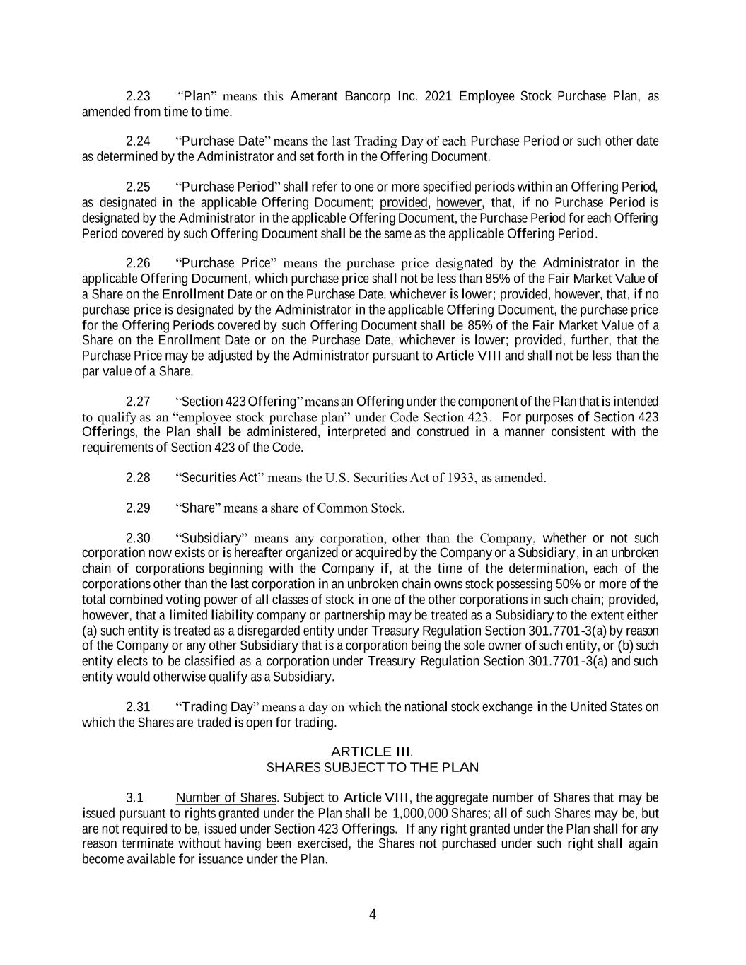 4 2.23 “Plan” means this Amerant Bancorp Inc. 2021 Employee Stock Purchase Plan, as amended from time to time. 2.24 “Purchase Date” means the last Trading Day of each Purchase Period or such other date as determined by the Administrator and set forth in the Offering Document. 2.25 “Purchase Period” shall refer to one or more specified periods within an Offering Period, as designated in the applicable Offering Document; provided, however, that, if no Purchase Period is designated by the Administrator in the applicable Offering Document, the Purchase Period for each Offering Period covered by such Offering Document shall be the same as the applicable Offering Period. 2.26 “Purchase Price” means the purchase price designated by the Administrator in the applicable Offering Document, which purchase price shall not be less than 85% of the Fair Market Value of a Share on the Enrollment Date or on the Purchase Date, whichever is lower; provided, however, that, if no purchase price is designated by the Administrator in the applicable Offering Document, the purchase price for the Offering Periods covered by such Offering Document shall be 85% of the Fair Market Value of a Share on the Enrollment Date or on the Purchase Date, whichever is lower; provided, further, that the Purchase Price may be adjusted by the Administrator pursuant to Article VIII and shall not be less than the par value of a Share. 2.27 “Section 423 Offering” means an Offering under the component of the Plan that is intended to qualify as an “employee stock purchase plan” under Code Section 423. For purposes of Section 423 Offerings, the Plan shall be administered, interpreted and construed in a manner consistent with the requirements of Section 423 of the Code. 2.28 “Securities Act” means the U.S. Securities Act of 1933, as amended. 2.29 “Share” means a share of Common Stock. 2.30 “Subsidiary” means any corporation, other than the Company, whether or not such corporation now exists or is hereafter organized or acquired by the Company or a Subsidiary, in an unbroken chain of corporations beginning with the Company if, at the time of the determination, each of the corporations other than the last corporation in an unbroken chain owns stock possessing 50% or more of the total combined voting power of all classes of stock in one of the other corporations in such chain; provided, however, that a limited liability company or partnership may be treated as a Subsidiary to the extent either (a) such entity is treated as a disregarded entity under Treasury Regulation Section 301.7701-3(a) by reason of the Company or any other Subsidiary that is a corporation being the sole owner of such entity, or (b) such entity elects to be classified as a corporation under Treasury Regulation Section 301.7701-3(a) and such entity would otherwise qualify as a Subsidiary. 2.31 “Trading Day” means a day on which the national stock exchange in the United States on which the Shares are traded is open for trading. ARTICLE III. SHARES SUBJECT TO THE PLAN 3.1 Number of Shares. Subject to Article VIII, the aggregate number of Shares that may be issued pursuant to rights granted under the Plan shall be 1,000,000 Shares; all of such Shares may be, but are not required to be, issued under Section 423 Offerings. If any right granted under the Plan shall for any reason terminate without having been exercised, the Shares not purchased under such right shall again become available for issuance under the Plan.
