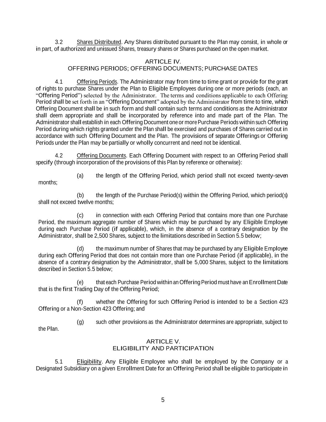5 3.2 Shares Distributed. Any Shares distributed pursuant to the Plan may consist, in whole or in part, of authorized and unissued Shares, treasury shares or Shares purchased on the open market. ARTICLE IV. OFFERING PERIODS; OFFERING DOCUMENTS; PURCHASE DATES 4.1 Offering Periods. The Administrator may from time to time grant or provide for the grant of rights to purchase Shares under the Plan to Eligible Employees during one or more periods (each, an “Offering Period”) selected by the Administrator. The terms and conditions applicable to each Offering Period shall be set forth in an “Offering Document” adopted by the Administrator from time to time, which Offering Document shall be in such form and shall contain such terms and conditions as the Administrator shall deem appropriate and shall be incorporated by reference into and made part of the Plan. The Administrator shall establish in each Offering Document one or more Purchase Periods within such Offering Period during which rights granted under the Plan shall be exercised and purchases of Shares carried out in accordance with such Offering Document and the Plan. The provisions of separate Offerings or Offering Periods under the Plan may be partially or wholly concurrent and need not be identical. 4.2 Offering Documents. Each Offering Document with respect to an Offering Period shall specify (through incorporation of the provisions of this Plan by reference or otherwise): (a) the length of the Offering Period, which period shall not exceed twenty-seven months; (b) the length of the Purchase Period(s) within the Offering Period, which period(s) shall not exceed twelve months; (c) in connection with each Offering Period that contains more than one Purchase Period, the maximum aggregate number of Shares which may be purchased by any Eligible Employee during each Purchase Period (if applicable), which, in the absence of a contrary designation by the Administrator, shall be 2,500 Shares, subject to the limitations described in Section 5.5 below; (d) the maximum number of Shares that may be purchased by any Eligible Employee during each Offering Period that does not contain more than one Purchase Period (if applicable), in the absence of a contrary designation by the Administrator, shall be 5,000 Shares, subject to the limitations described in Section 5.5 below; (e) that each Purchase Period within an Offering Period must have an Enrollment Date that is the first Trading Day of the Offering Period; (f) whether the Offering for such Offering Period is intended to be a Section 423 Offering or a Non-Section 423 Offering; and (g) such other provisions as the Administrator determines are appropriate, subject to the Plan. ARTICLE V. ELIGIBILITY AND PARTICIPATION 5.1 Eligibility. Any Eligible Employee who shall be employed by the Company or a Designated Subsidiary on a given Enrollment Date for an Offering Period shall be eligible to participate in
