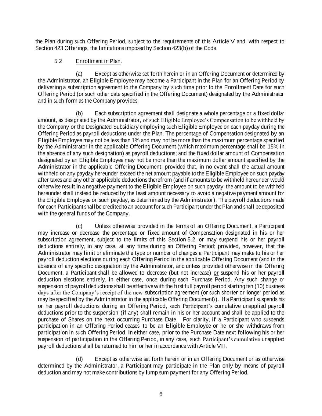 6 the Plan during such Offering Period, subject to the requirements of this Article V and, with respect to Section 423 Offerings, the limitations imposed by Section 423(b) of the Code. 5.2 Enrollment in Plan. (a) Except as otherwise set forth herein or in an Offering Document or determined by the Administrator, an Eligible Employee may become a Participant in the Plan for an Offering Period by delivering a subscription agreement to the Company by such time prior to the Enrollment Date for such Offering Period (or such other date specified in the Offering Document) designated by the Administrator and in such form as the Company provides. (b) Each subscription agreement shall designate a whole percentage or a fixed dollar amount, as designated by the Administrator, of such Eligible Employee’s Compensation to be withheld by the Company or the Designated Subsidiary employing such Eligible Employee on each payday during the Offering Period as payroll deductions under the Plan. The percentage of Compensation designated by an Eligible Employee may not be less than 1% and may not be more than the maximum percentage specified by the Administrator in the applicable Offering Document (which maximum percentage shall be 15% in the absence of any such designation) as payroll deductions; and the fixed dollar amount of Compensation designated by an Eligible Employee may not be more than the maximum dollar amount specified by the Administrator in the applicable Offering Document; provided that, in no event shall the actual amount withheld on any payday hereunder exceed the net amount payable to the Eligible Employee on such payday after taxes and any other applicable deductions therefrom (and if amounts to be withheld hereunder would otherwise result in a negative payment to the Eligible Employee on such payday, the amount to be withheld hereunder shall instead be reduced by the least amount necessary to avoid a negative payment amount for the Eligible Employee on such payday, as determined by the Administrator). The payroll deductions made for each Participant shall be credited to an account for such Participant under the Plan and shall be deposited with the general funds of the Company. (c) Unless otherwise provided in the terms of an Offering Document, a Participant may increase or decrease the percentage or fixed amount of Compensation designated in his or her subscription agreement, subject to the limits of this Section 5.2, or may suspend his or her payroll deductions entirely, in any case, at any time during an Offering Period; provided, however, that the Administrator may limit or eliminate the type or number of changes a Participant may make to his or her payroll deduction elections during each Offering Period in the applicable Offering Document (and in the absence of any specific designation by the Administrator, and unless provided otherwise in the Offering Document, a Participant shall be allowed to decrease (but not increase) or suspend his or her payroll deduction elections entirely, in either case, once during each Purchase Period. Any such change or suspension of payroll deductions shall be effective with the first full payroll period starting ten (10) business days after the Company’s receipt of the new subscription agreement (or such shorter or longer period as may be specified by the Administrator in the applicable Offering Document)). If a Participant suspends his or her payroll deductions during an Offering Period, such Participant’s cumulative unapplied payroll deductions prior to the suspension (if any) shall remain in his or her account and shall be applied to the purchase of Shares on the next occurring Purchase Date. For clarity, if a Participant who suspends participation in an Offering Period ceases to be an Eligible Employee or he or she withdraws from participation in such Offering Period, in either case, prior to the Purchase Date next following his or her suspension of participation in the Offering Period, in any case, such Participant’s cumulative unapplied payroll deductions shall be returned to him or her in accordance with Article VII. (d) Except as otherwise set forth herein or in an Offering Document or as otherwise determined by the Administrator, a Participant may participate in the Plan only by means of payroll deduction and may not make contributions by lump sum payment for any Offering Period.