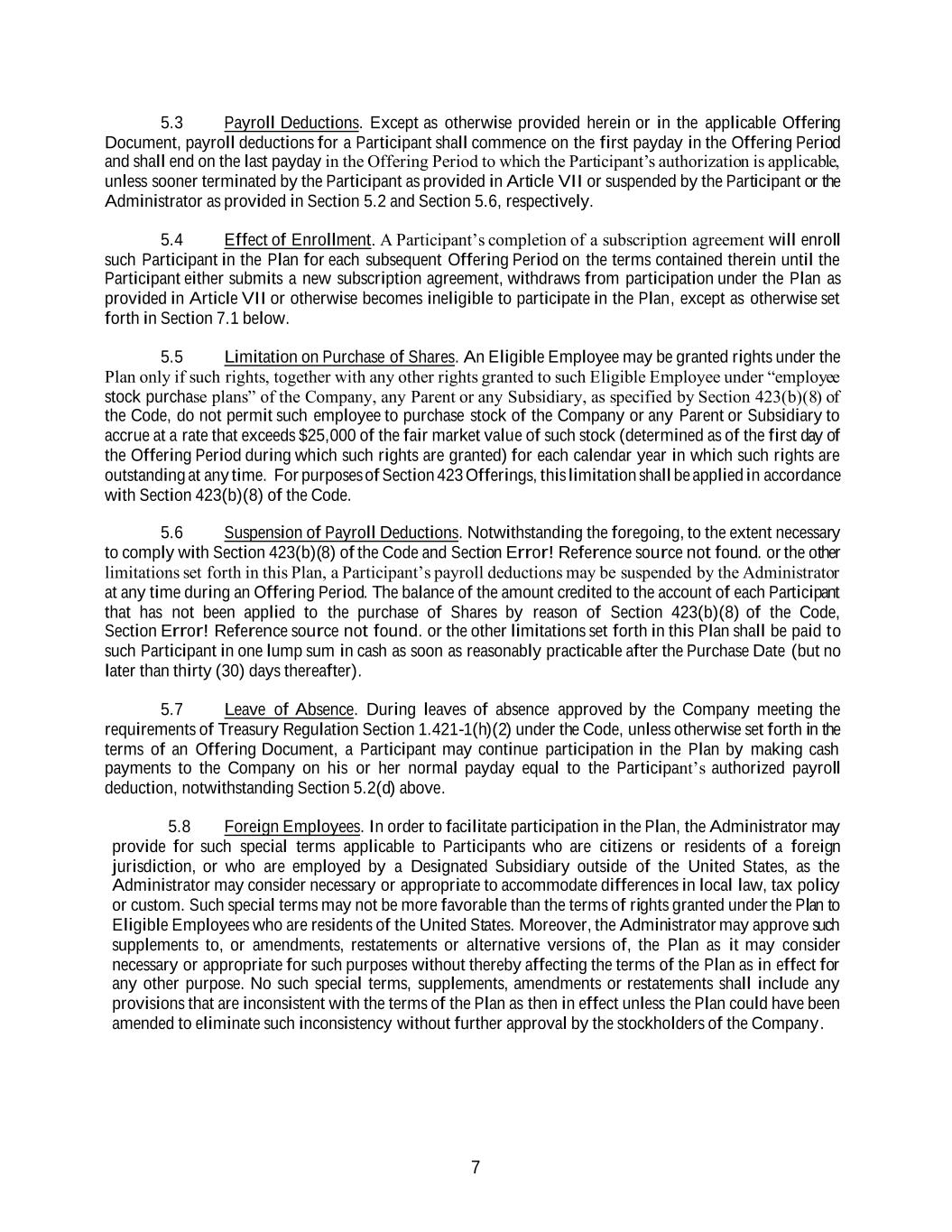 7 5.3 Payroll Deductions. Except as otherwise provided herein or in the applicable Offering Document, payroll deductions for a Participant shall commence on the first payday in the Offering Period and shall end on the last payday in the Offering Period to which the Participant’s authorization is applicable, unless sooner terminated by the Participant as provided in Article VII or suspended by the Participant or the Administrator as provided in Section 5.2 and Section 5.6, respectively. 5.4 Effect of Enrollment. A Participant’s completion of a subscription agreement will enroll such Participant in the Plan for each subsequent Offering Period on the terms contained therein until the Participant either submits a new subscription agreement, withdraws from participation under the Plan as provided in Article VII or otherwise becomes ineligible to participate in the Plan, except as otherwise set forth in Section 7.1 below. 5.5 Limitation on Purchase of Shares. An Eligible Employee may be granted rights under the Plan only if such rights, together with any other rights granted to such Eligible Employee under “employee stock purchase plans” of the Company, any Parent or any Subsidiary, as specified by Section 423(b)(8) of the Code, do not permit such employee to purchase stock of the Company or any Parent or Subsidiary to accrue at a rate that exceeds $25,000 of the fair market value of such stock (determined as of the first day of the Offering Period during which such rights are granted) for each calendar year in which such rights are outstanding at any time. For purposes of Section 423 Offerings, this limitation shall be applied in accordance with Section 423(b)(8) of the Code. 5.6 Suspension of Payroll Deductions. Notwithstanding the foregoing, to the extent necessary to comply with Section 423(b)(8) of the Code and Section Error! Reference source not found. or the other limitations set forth in this Plan, a Participant’s payroll deductions may be suspended by the Administrator at any time during an Offering Period. The balance of the amount credited to the account of each Participant that has not been applied to the purchase of Shares by reason of Section 423(b)(8) of the Code, Section Error! Reference source not found. or the other limitations set forth in this Plan shall be paid to such Participant in one lump sum in cash as soon as reasonably practicable after the Purchase Date (but no later than thirty (30) days thereafter). 5.7 Leave of Absence. During leaves of absence approved by the Company meeting the requirements of Treasury Regulation Section 1.421-1(h)(2) under the Code, unless otherwise set forth in the terms of an Offering Document, a Participant may continue participation in the Plan by making cash payments to the Company on his or her normal payday equal to the Participant’s authorized payroll deduction, notwithstanding Section 5.2(d) above. 5.8 Foreign Employees. In order to facilitate participation in the Plan, the Administrator may provide for such special terms applicable to Participants who are citizens or residents of a foreign jurisdiction, or who are employed by a Designated Subsidiary outside of the United States, as the Administrator may consider necessary or appropriate to accommodate differences in local law, tax policy or custom. Such special terms may not be more favorable than the terms of rights granted under the Plan to Eligible Employees who are residents of the United States. Moreover, the Administrator may approve such supplements to, or amendments, restatements or alternative versions of, the Plan as it may consider necessary or appropriate for such purposes without thereby affecting the terms of the Plan as in effect for any other purpose. No such special terms, supplements, amendments or restatements shall include any provisions that are inconsistent with the terms of the Plan as then in effect unless the Plan could have been amended to eliminate such inconsistency without further approval by the stockholders of the Company.