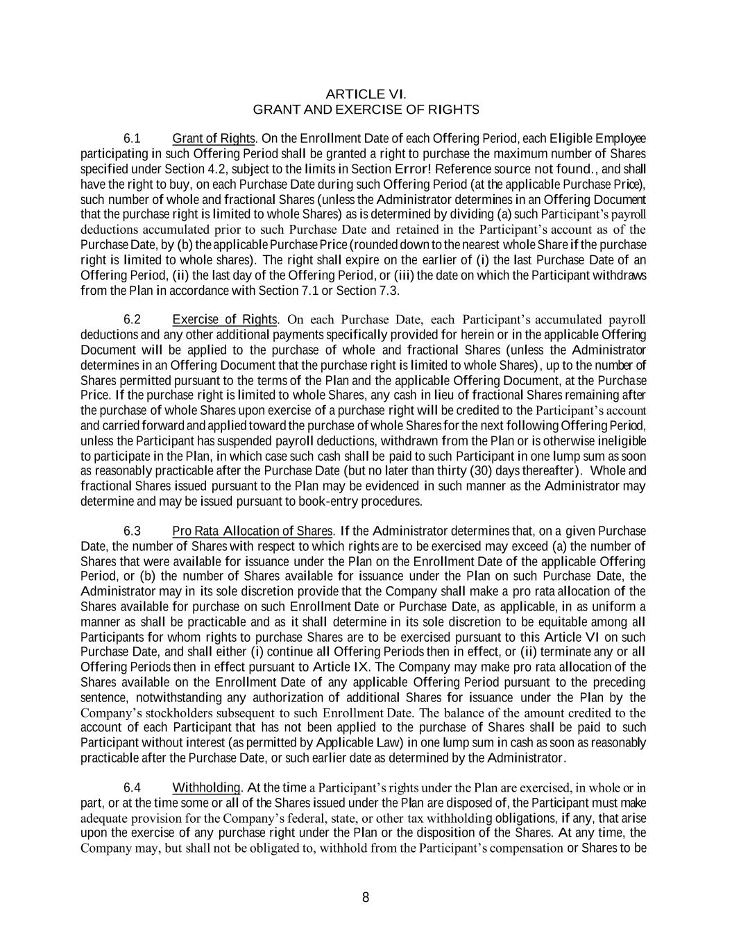 8 ARTICLE VI. GRANT AND EXERCISE OF RIGHTS 6.1 Grant of Rights. On the Enrollment Date of each Offering Period, each Eligible Employee participating in such Offering Period shall be granted a right to purchase the maximum number of Shares specified under Section 4.2, subject to the limits in Section Error! Reference source not found., and shall have the right to buy, on each Purchase Date during such Offering Period (at the applicable Purchase Price), such number of whole and fractional Shares (unless the Administrator determines in an Offering Document that the purchase right is limited to whole Shares) as is determined by dividing (a) such Participant’s payroll deductions accumulated prior to such Purchase Date and retained in the Participant’s account as of the Purchase Date, by (b) the applicable Purchase Price (rounded down to the nearest whole Share if the purchase right is limited to whole shares). The right shall expire on the earlier of (i) the last Purchase Date of an Offering Period, (ii) the last day of the Offering Period, or (iii) the date on which the Participant withdraws from the Plan in accordance with Section 7.1 or Section 7.3. 6.2 Exercise of Rights. On each Purchase Date, each Participant’s accumulated payroll deductions and any other additional payments specifically provided for herein or in the applicable Offering Document will be applied to the purchase of whole and fractional Shares (unless the Administrator determines in an Offering Document that the purchase right is limited to whole Shares), up to the number of Shares permitted pursuant to the terms of the Plan and the applicable Offering Document, at the Purchase Price. If the purchase right is limited to whole Shares, any cash in lieu of fractional Shares remaining after the purchase of whole Shares upon exercise of a purchase right will be credited to the Participant’s account and carried forward and applied toward the purchase of whole Shares for the next following Offering Period, unless the Participant has suspended payroll deductions, withdrawn from the Plan or is otherwise ineligible to participate in the Plan, in which case such cash shall be paid to such Participant in one lump sum as soon as reasonably practicable after the Purchase Date (but no later than thirty (30) days thereafter). Whole and fractional Shares issued pursuant to the Plan may be evidenced in such manner as the Administrator may determine and may be issued pursuant to book-entry procedures. 6.3 Pro Rata Allocation of Shares. If the Administrator determines that, on a given Purchase Date, the number of Shares with respect to which rights are to be exercised may exceed (a) the number of Shares that were available for issuance under the Plan on the Enrollment Date of the applicable Offering Period, or (b) the number of Shares available for issuance under the Plan on such Purchase Date, the Administrator may in its sole discretion provide that the Company shall make a pro rata allocation of the Shares available for purchase on such Enrollment Date or Purchase Date, as applicable, in as uniform a manner as shall be practicable and as it shall determine in its sole discretion to be equitable among all Participants for whom rights to purchase Shares are to be exercised pursuant to this Article VI on such Purchase Date, and shall either (i) continue all Offering Periods then in effect, or (ii) terminate any or all Offering Periods then in effect pursuant to Article IX. The Company may make pro rata allocation of the Shares available on the Enrollment Date of any applicable Offering Period pursuant to the preceding sentence, notwithstanding any authorization of additional Shares for issuance under the Plan by the Company’s stockholders subsequent to such Enrollment Date. The balance of the amount credited to the account of each Participant that has not been applied to the purchase of Shares shall be paid to such Participant without interest (as permitted by Applicable Law) in one lump sum in cash as soon as reasonably practicable after the Purchase Date, or such earlier date as determined by the Administrator. 6.4 Withholding. At the time a Participant’s rights under the Plan are exercised, in whole or in part, or at the time some or all of the Shares issued under the Plan are disposed of, the Participant must make adequate provision for the Company’s federal, state, or other tax withholding obligations, if any, that arise upon the exercise of any purchase right under the Plan or the disposition of the Shares. At any time, the Company may, but shall not be obligated to, withhold from the Participant’s compensation or Shares to be