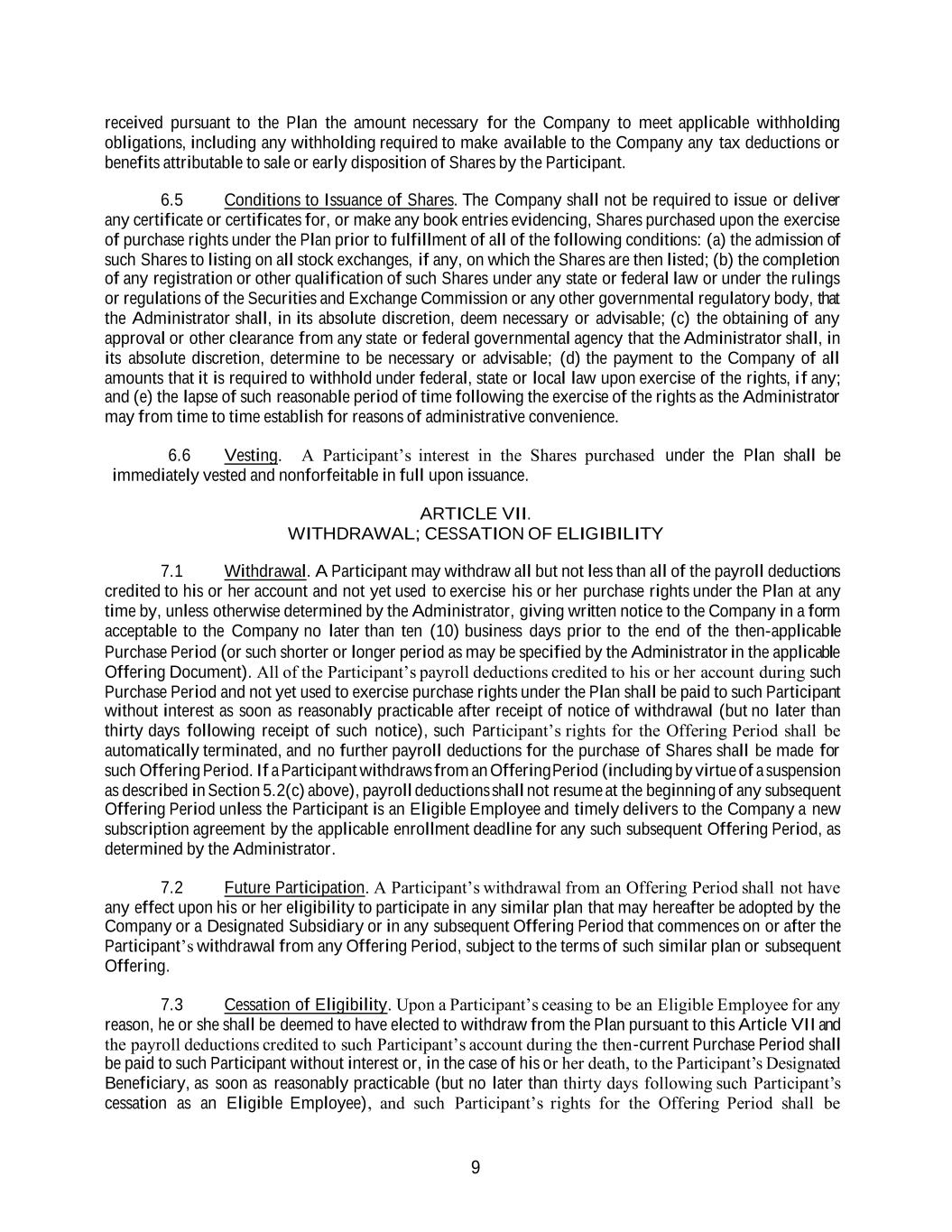 9 received pursuant to the Plan the amount necessary for the Company to meet applicable withholding obligations, including any withholding required to make available to the Company any tax deductions or benefits attributable to sale or early disposition of Shares by the Participant. 6.5 Conditions to Issuance of Shares. The Company shall not be required to issue or deliver any certificate or certificates for, or make any book entries evidencing, Shares purchased upon the exercise of purchase rights under the Plan prior to fulfillment of all of the following conditions: (a) the admission of such Shares to listing on all stock exchanges, if any, on which the Shares are then listed; (b) the completion of any registration or other qualification of such Shares under any state or federal law or under the rulings or regulations of the Securities and Exchange Commission or any other governmental regulatory body, that the Administrator shall, in its absolute discretion, deem necessary or advisable; (c) the obtaining of any approval or other clearance from any state or federal governmental agency that the Administrator shall, in its absolute discretion, determine to be necessary or advisable; (d) the payment to the Company of all amounts that it is required to withhold under federal, state or local law upon exercise of the rights, if any; and (e) the lapse of such reasonable period of time following the exercise of the rights as the Administrator may from time to time establish for reasons of administrative convenience. 6.6 Vesting. A Participant’s interest in the Shares purchased under the Plan shall be immediately vested and nonforfeitable in full upon issuance. ARTICLE VII. WITHDRAWAL; CESSATION OF ELIGIBILITY 7.1 Withdrawal. A Participant may withdraw all but not less than all of the payroll deductions credited to his or her account and not yet used to exercise his or her purchase rights under the Plan at any time by, unless otherwise determined by the Administrator, giving written notice to the Company in a form acceptable to the Company no later than ten (10) business days prior to the end of the then-applicable Purchase Period (or such shorter or longer period as may be specified by the Administrator in the applicable Offering Document). All of the Participant’s payroll deductions credited to his or her account during such Purchase Period and not yet used to exercise purchase rights under the Plan shall be paid to such Participant without interest as soon as reasonably practicable after receipt of notice of withdrawal (but no later than thirty days following receipt of such notice), such Participant’s rights for the Offering Period shall be automatically terminated, and no further payroll deductions for the purchase of Shares shall be made for such Offering Period. If a Participant withdraws from an Offering Period (including by virtue of a suspension as described in Section 5.2(c) above), payroll deductions shall not resume at the beginning of any subsequent Offering Period unless the Participant is an Eligible Employee and timely delivers to the Company a new subscription agreement by the applicable enrollment deadline for any such subsequent Offering Period, as determined by the Administrator. 7.2 Future Participation. A Participant’s withdrawal from an Offering Period shall not have any effect upon his or her eligibility to participate in any similar plan that may hereafter be adopted by the Company or a Designated Subsidiary or in any subsequent Offering Period that commences on or after the Participant’s withdrawal from any Offering Period, subject to the terms of such similar plan or subsequent Offering. 7.3 Cessation of Eligibility. Upon a Participant’s ceasing to be an Eligible Employee for any reason, he or she shall be deemed to have elected to withdraw from the Plan pursuant to this Article VII and the payroll deductions credited to such Participant’s account during the then-current Purchase Period shall be paid to such Participant without interest or, in the case of his or her death, to the Participant’s Designated Beneficiary, as soon as reasonably practicable (but no later than thirty days following such Participant’s cessation as an Eligible Employee), and such Participant’s rights for the Offering Period shall be
