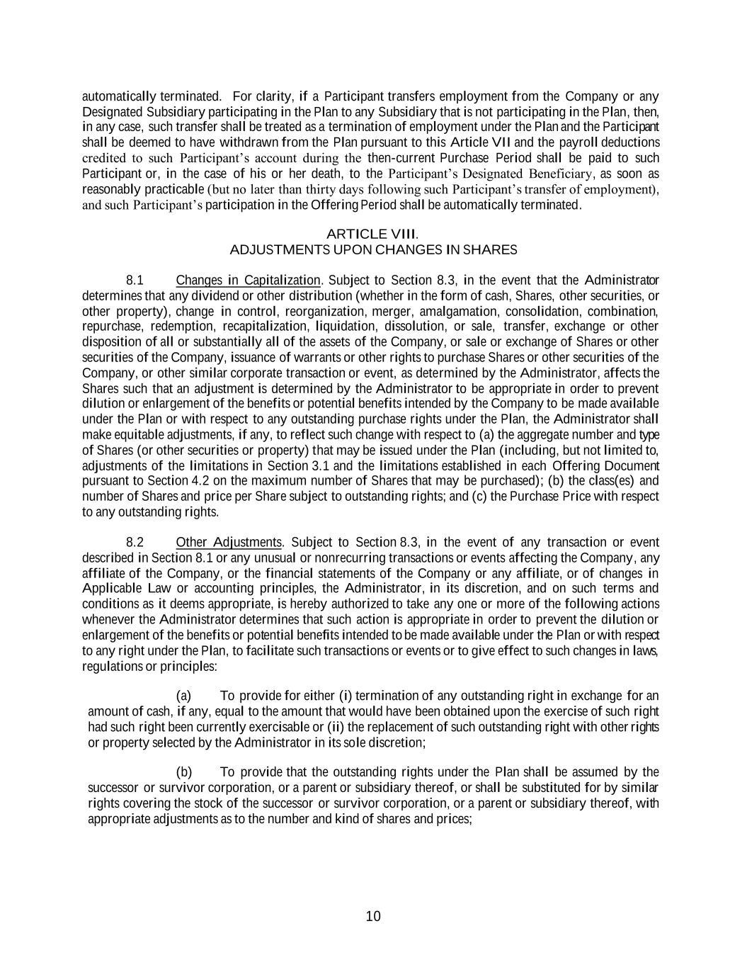 10 automatically terminated. For clarity, if a Participant transfers employment from the Company or any Designated Subsidiary participating in the Plan to any Subsidiary that is not participating in the Plan, then, in any case, such transfer shall be treated as a termination of employment under the Plan and the Participant shall be deemed to have withdrawn from the Plan pursuant to this Article VII and the payroll deductions credited to such Participant’s account during the then-current Purchase Period shall be paid to such Participant or, in the case of his or her death, to the Participant’s Designated Beneficiary, as soon as reasonably practicable (but no later than thirty days following such Participant’s transfer of employment), and such Participant’s participation in the Offering Period shall be automatically terminated. ARTICLE VIII. ADJUSTMENTS UPON CHANGES IN SHARES 8.1 Changes in Capitalization. Subject to Section 8.3, in the event that the Administrator determines that any dividend or other distribution (whether in the form of cash, Shares, other securities, or other property), change in control, reorganization, merger, amalgamation, consolidation, combination, repurchase, redemption, recapitalization, liquidation, dissolution, or sale, transfer, exchange or other disposition of all or substantially all of the assets of the Company, or sale or exchange of Shares or other securities of the Company, issuance of warrants or other rights to purchase Shares or other securities of the Company, or other similar corporate transaction or event, as determined by the Administrator, affects the Shares such that an adjustment is determined by the Administrator to be appropriate in order to prevent dilution or enlargement of the benefits or potential benefits intended by the Company to be made available under the Plan or with respect to any outstanding purchase rights under the Plan, the Administrator shall make equitable adjustments, if any, to reflect such change with respect to (a) the aggregate number and type of Shares (or other securities or property) that may be issued under the Plan (including, but not limited to, adjustments of the limitations in Section 3.1 and the limitations established in each Offering Document pursuant to Section 4.2 on the maximum number of Shares that may be purchased); (b) the class(es) and number of Shares and price per Share subject to outstanding rights; and (c) the Purchase Price with respect to any outstanding rights. 8.2 Other Adjustments. Subject to Section 8.3, in the event of any transaction or event described in Section 8.1 or any unusual or nonrecurring transactions or events affecting the Company, any affiliate of the Company, or the financial statements of the Company or any affiliate, or of changes in Applicable Law or accounting principles, the Administrator, in its discretion, and on such terms and conditions as it deems appropriate, is hereby authorized to take any one or more of the following actions whenever the Administrator determines that such action is appropriate in order to prevent the dilution or enlargement of the benefits or potential benefits intended to be made available under the Plan or with respect to any right under the Plan, to facilitate such transactions or events or to give effect to such changes in laws, regulations or principles: (a) To provide for either (i) termination of any outstanding right in exchange for an amount of cash, if any, equal to the amount that would have been obtained upon the exercise of such right had such right been currently exercisable or (ii) the replacement of such outstanding right with other rights or property selected by the Administrator in its sole discretion; (b) To provide that the outstanding rights under the Plan shall be assumed by the successor or survivor corporation, or a parent or subsidiary thereof, or shall be substituted for by similar rights covering the stock of the successor or survivor corporation, or a parent or subsidiary thereof, with appropriate adjustments as to the number and kind of shares and prices;