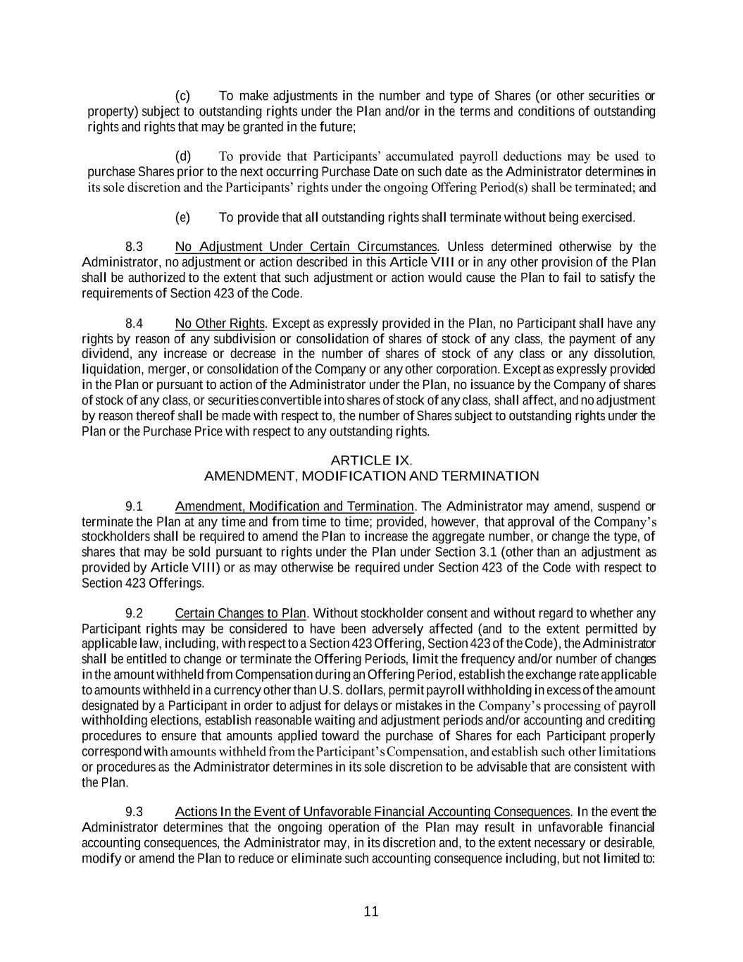 11 (c) To make adjustments in the number and type of Shares (or other securities or property) subject to outstanding rights under the Plan and/or in the terms and conditions of outstanding rights and rights that may be granted in the future; (d) To provide that Participants’ accumulated payroll deductions may be used to purchase Shares prior to the next occurring Purchase Date on such date as the Administrator determines in its sole discretion and the Participants’ rights under the ongoing Offering Period(s) shall be terminated; and (e) To provide that all outstanding rights shall terminate without being exercised. 8.3 No Adjustment Under Certain Circumstances. Unless determined otherwise by the Administrator, no adjustment or action described in this Article VIII or in any other provision of the Plan shall be authorized to the extent that such adjustment or action would cause the Plan to fail to satisfy the requirements of Section 423 of the Code. 8.4 No Other Rights. Except as expressly provided in the Plan, no Participant shall have any rights by reason of any subdivision or consolidation of shares of stock of any class, the payment of any dividend, any increase or decrease in the number of shares of stock of any class or any dissolution, liquidation, merger, or consolidation of the Company or any other corporation. Except as expressly provided in the Plan or pursuant to action of the Administrator under the Plan, no issuance by the Company of shares of stock of any class, or securities convertible into shares of stock of any class, shall affect, and no adjustment by reason thereof shall be made with respect to, the number of Shares subject to outstanding rights under the Plan or the Purchase Price with respect to any outstanding rights. ARTICLE IX. AMENDMENT, MODIFICATION AND TERMINATION 9.1 Amendment, Modification and Termination. The Administrator may amend, suspend or terminate the Plan at any time and from time to time; provided, however, that approval of the Company’s stockholders shall be required to amend the Plan to increase the aggregate number, or change the type, of shares that may be sold pursuant to rights under the Plan under Section 3.1 (other than an adjustment as provided by Article VIII) or as may otherwise be required under Section 423 of the Code with respect to Section 423 Offerings. 9.2 Certain Changes to Plan. Without stockholder consent and without regard to whether any Participant rights may be considered to have been adversely affected (and to the extent permitted by applicable law, including, with respect to a Section 423 Offering, Section 423 of the Code), the Administrator shall be entitled to change or terminate the Offering Periods, limit the frequency and/or number of changes in the amount withheld from Compensation during an Offering Period, establish the exchange rate applicable to amounts withheld in a currency other than U.S. dollars, permit payroll withholding in excess of the amount designated by a Participant in order to adjust for delays or mistakes in the Company’s processing of payroll withholding elections, establish reasonable waiting and adjustment periods and/or accounting and crediting procedures to ensure that amounts applied toward the purchase of Shares for each Participant properly correspond with amounts withheld from the Participant’s Compensation, and establish such other limitations or procedures as the Administrator determines in its sole discretion to be advisable that are consistent with the Plan. 9.3 Actions In the Event of Unfavorable Financial Accounting Consequences. In the event the Administrator determines that the ongoing operation of the Plan may result in unfavorable financial accounting consequences, the Administrator may, in its discretion and, to the extent necessary or desirable, modify or amend the Plan to reduce or eliminate such accounting consequence including, but not limited to: