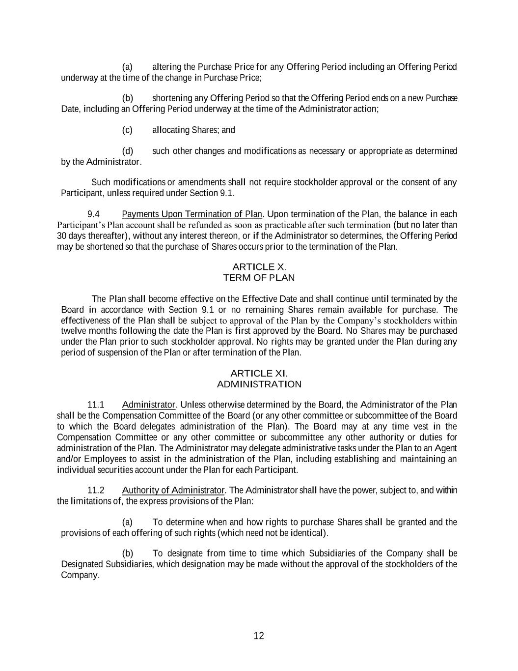 12 (a) altering the Purchase Price for any Offering Period including an Offering Period underway at the time of the change in Purchase Price; (b) shortening any Offering Period so that the Offering Period ends on a new Purchase Date, including an Offering Period underway at the time of the Administrator action; (c) allocating Shares; and (d) such other changes and modifications as necessary or appropriate as determined by the Administrator. Such modifications or amendments shall not require stockholder approval or the consent of any Participant, unless required under Section 9.1. 9.4 Payments Upon Termination of Plan. Upon termination of the Plan, the balance in each Participant’s Plan account shall be refunded as soon as practicable after such termination (but no later than 30 days thereafter), without any interest thereon, or if the Administrator so determines, the Offering Period may be shortened so that the purchase of Shares occurs prior to the termination of the Plan. ARTICLE X. TERM OF PLAN The Plan shall become effective on the Effective Date and shall continue until terminated by the Board in accordance with Section 9.1 or no remaining Shares remain available for purchase. The effectiveness of the Plan shall be subject to approval of the Plan by the Company’s stockholders within twelve months following the date the Plan is first approved by the Board. No Shares may be purchased under the Plan prior to such stockholder approval. No rights may be granted under the Plan during any period of suspension of the Plan or after termination of the Plan. ARTICLE XI. ADMINISTRATION 11.1 Administrator. Unless otherwise determined by the Board, the Administrator of the Plan shall be the Compensation Committee of the Board (or any other committee or subcommittee of the Board to which the Board delegates administration of the Plan). The Board may at any time vest in the Compensation Committee or any other committee or subcommittee any other authority or duties for administration of the Plan. The Administrator may delegate administrative tasks under the Plan to an Agent and/or Employees to assist in the administration of the Plan, including establishing and maintaining an individual securities account under the Plan for each Participant. 11.2 Authority of Administrator. The Administrator shall have the power, subject to, and within the limitations of, the express provisions of the Plan: (a) To determine when and how rights to purchase Shares shall be granted and the provisions of each offering of such rights (which need not be identical). (b) To designate from time to time which Subsidiaries of the Company shall be Designated Subsidiaries, which designation may be made without the approval of the stockholders of the Company.