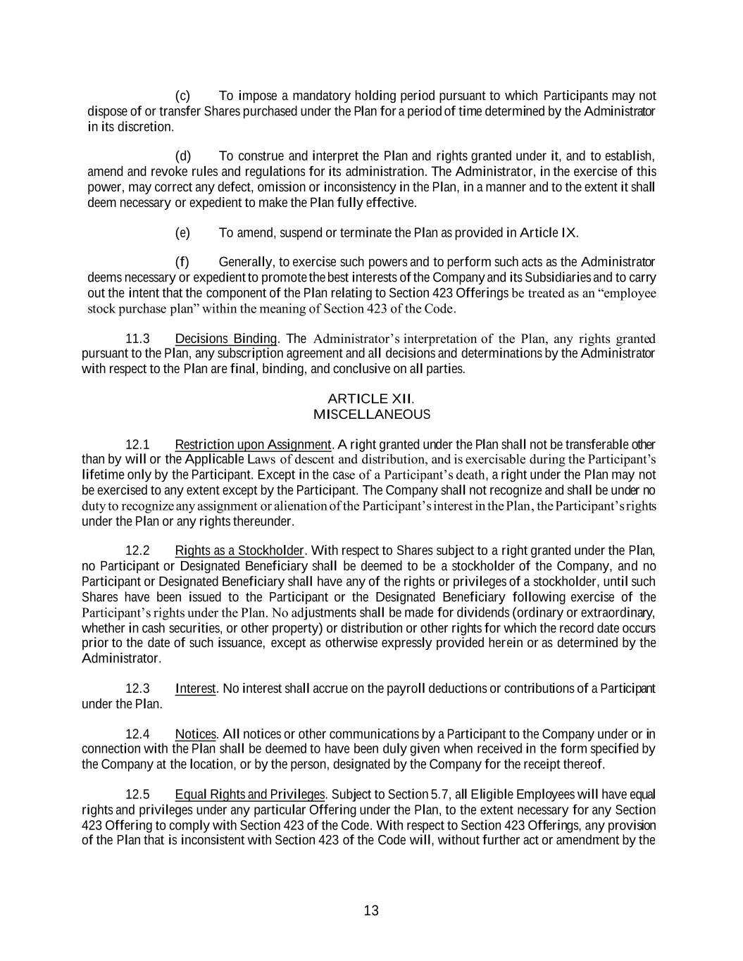 13 (c) To impose a mandatory holding period pursuant to which Participants may not dispose of or transfer Shares purchased under the Plan for a period of time determined by the Administrator in its discretion. (d) To construe and interpret the Plan and rights granted under it, and to establish, amend and revoke rules and regulations for its administration. The Administrator, in the exercise of this power, may correct any defect, omission or inconsistency in the Plan, in a manner and to the extent it shall deem necessary or expedient to make the Plan fully effective. (e) To amend, suspend or terminate the Plan as provided in Article IX. (f) Generally, to exercise such powers and to perform such acts as the Administrator deems necessary or expedient to promote the best interests of the Company and its Subsidiaries and to carry out the intent that the component of the Plan relating to Section 423 Offerings be treated as an “employee stock purchase plan” within the meaning of Section 423 of the Code. 11.3 Decisions Binding. The Administrator’s interpretation of the Plan, any rights granted pursuant to the Plan, any subscription agreement and all decisions and determinations by the Administrator with respect to the Plan are final, binding, and conclusive on all parties. ARTICLE XII. MISCELLANEOUS 12.1 Restriction upon Assignment. A right granted under the Plan shall not be transferable other than by will or the Applicable Laws of descent and distribution, and is exercisable during the Participant’s lifetime only by the Participant. Except in the case of a Participant’s death, a right under the Plan may not be exercised to any extent except by the Participant. The Company shall not recognize and shall be under no duty to recognize any assignment or alienation of the Participant’s interest in the Plan, the Participant’s rights under the Plan or any rights thereunder. 12.2 Rights as a Stockholder. With respect to Shares subject to a right granted under the Plan, no Participant or Designated Beneficiary shall be deemed to be a stockholder of the Company, and no Participant or Designated Beneficiary shall have any of the rights or privileges of a stockholder, until such Shares have been issued to the Participant or the Designated Beneficiary following exercise of the Participant’s rights under the Plan. No adjustments shall be made for dividends (ordinary or extraordinary, whether in cash securities, or other property) or distribution or other rights for which the record date occurs prior to the date of such issuance, except as otherwise expressly provided herein or as determined by the Administrator. 12.3 Interest. No interest shall accrue on the payroll deductions or contributions of a Participant under the Plan. 12.4 Notices. All notices or other communications by a Participant to the Company under or in connection with the Plan shall be deemed to have been duly given when received in the form specified by the Company at the location, or by the person, designated by the Company for the receipt thereof. 12.5 Equal Rights and Privileges. Subject to Section 5.7, all Eligible Employees will have equal rights and privileges under any particular Offering under the Plan, to the extent necessary for any Section 423 Offering to comply with Section 423 of the Code. With respect to Section 423 Offerings, any provision of the Plan that is inconsistent with Section 423 of the Code will, without further act or amendment by the