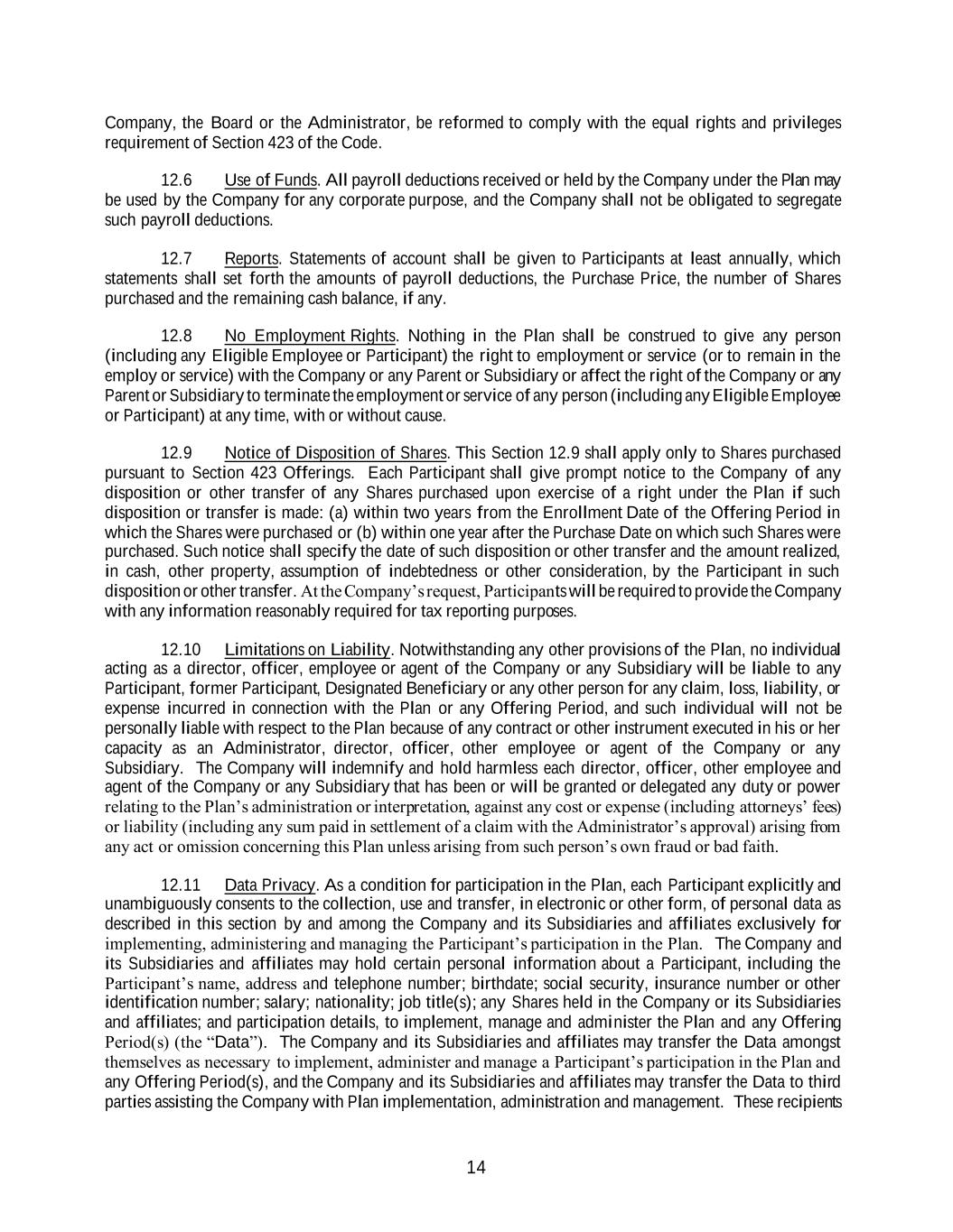 14 Company, the Board or the Administrator, be reformed to comply with the equal rights and privileges requirement of Section 423 of the Code. 12.6 Use of Funds. All payroll deductions received or held by the Company under the Plan may be used by the Company for any corporate purpose, and the Company shall not be obligated to segregate such payroll deductions. 12.7 Reports. Statements of account shall be given to Participants at least annually, which statements shall set forth the amounts of payroll deductions, the Purchase Price, the number of Shares purchased and the remaining cash balance, if any. 12.8 No Employment Rights. Nothing in the Plan shall be construed to give any person (including any Eligible Employee or Participant) the right to employment or service (or to remain in the employ or service) with the Company or any Parent or Subsidiary or affect the right of the Company or any Parent or Subsidiary to terminate the employment or service of any person (including any Eligible Employee or Participant) at any time, with or without cause. 12.9 Notice of Disposition of Shares. This Section 12.9 shall apply only to Shares purchased pursuant to Section 423 Offerings. Each Participant shall give prompt notice to the Company of any disposition or other transfer of any Shares purchased upon exercise of a right under the Plan if such disposition or transfer is made: (a) within two years from the Enrollment Date of the Offering Period in which the Shares were purchased or (b) within one year after the Purchase Date on which such Shares were purchased. Such notice shall specify the date of such disposition or other transfer and the amount realized, in cash, other property, assumption of indebtedness or other consideration, by the Participant in such disposition or other transfer. At the Company’s request, Participants will be required to provide the Company with any information reasonably required for tax reporting purposes. 12.10 Limitations on Liability. Notwithstanding any other provisions of the Plan, no individual acting as a director, officer, employee or agent of the Company or any Subsidiary will be liable to any Participant, former Participant, Designated Beneficiary or any other person for any claim, loss, liability, or expense incurred in connection with the Plan or any Offering Period, and such individual will not be personally liable with respect to the Plan because of any contract or other instrument executed in his or her capacity as an Administrator, director, officer, other employee or agent of the Company or any Subsidiary. The Company will indemnify and hold harmless each director, officer, other employee and agent of the Company or any Subsidiary that has been or will be granted or delegated any duty or power relating to the Plan’s administration or interpretation, against any cost or expense (including attorneys’ fees) or liability (including any sum paid in settlement of a claim with the Administrator’s approval) arising from any act or omission concerning this Plan unless arising from such person’s own fraud or bad faith. 12.11 Data Privacy. As a condition for participation in the Plan, each Participant explicitly and unambiguously consents to the collection, use and transfer, in electronic or other form, of personal data as described in this section by and among the Company and its Subsidiaries and affiliates exclusively for implementing, administering and managing the Participant’s participation in the Plan. The Company and its Subsidiaries and affiliates may hold certain personal information about a Participant, including the Participant’s name, address and telephone number; birthdate; social security, insurance number or other identification number; salary; nationality; job title(s); any Shares held in the Company or its Subsidiaries and affiliates; and participation details, to implement, manage and administer the Plan and any Offering Period(s) (the “Data”). The Company and its Subsidiaries and affiliates may transfer the Data amongst themselves as necessary to implement, administer and manage a Participant’s participation in the Plan and any Offering Period(s), and the Company and its Subsidiaries and affiliates may transfer the Data to third parties assisting the Company with Plan implementation, administration and management. These recipients