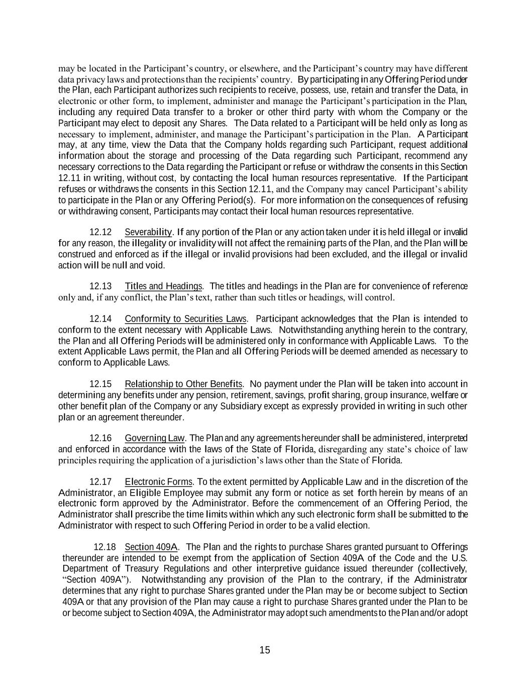 15 may be located in the Participant’s country, or elsewhere, and the Participant’s country may have different data privacy laws and protections than the recipients’ country. By participating in any Offering Period under the Plan, each Participant authorizes such recipients to receive, possess, use, retain and transfer the Data, in electronic or other form, to implement, administer and manage the Participant’s participation in the Plan, including any required Data transfer to a broker or other third party with whom the Company or the Participant may elect to deposit any Shares. The Data related to a Participant will be held only as long as necessary to implement, administer, and manage the Participant’s participation in the Plan. A Participant may, at any time, view the Data that the Company holds regarding such Participant, request additional information about the storage and processing of the Data regarding such Participant, recommend any necessary corrections to the Data regarding the Participant or refuse or withdraw the consents in this Section 12.11 in writing, without cost, by contacting the local human resources representative. If the Participant refuses or withdraws the consents in this Section 12.11, and the Company may cancel Participant’s ability to participate in the Plan or any Offering Period(s). For more information on the consequences of refusing or withdrawing consent, Participants may contact their local human resources representative. 12.12 Severability. If any portion of the Plan or any action taken under it is held illegal or invalid for any reason, the illegality or invalidity will not affect the remaining parts of the Plan, and the Plan will be construed and enforced as if the illegal or invalid provisions had been excluded, and the illegal or invalid action will be null and void. 12.13 Titles and Headings. The titles and headings in the Plan are for convenience of reference only and, if any conflict, the Plan’s text, rather than such titles or headings, will control. 12.14 Conformity to Securities Laws. Participant acknowledges that the Plan is intended to conform to the extent necessary with Applicable Laws. Notwithstanding anything herein to the contrary, the Plan and all Offering Periods will be administered only in conformance with Applicable Laws. To the extent Applicable Laws permit, the Plan and all Offering Periods will be deemed amended as necessary to conform to Applicable Laws. 12.15 Relationship to Other Benefits. No payment under the Plan will be taken into account in determining any benefits under any pension, retirement, savings, profit sharing, group insurance, welfare or other benefit plan of the Company or any Subsidiary except as expressly provided in writing in such other plan or an agreement thereunder. 12.16 Governing Law. The Plan and any agreements hereunder shall be administered, interpreted and enforced in accordance with the laws of the State of Florida, disregarding any state’s choice of law principles requiring the application of a jurisdiction’s laws other than the State of Florida. 12.17 Electronic Forms. To the extent permitted by Applicable Law and in the discretion of the Administrator, an Eligible Employee may submit any form or notice as set forth herein by means of an electronic form approved by the Administrator. Before the commencement of an Offering Period, the Administrator shall prescribe the time limits within which any such electronic form shall be submitted to the Administrator with respect to such Offering Period in order to be a valid election. 12.18 Section 409A. The Plan and the rights to purchase Shares granted pursuant to Offerings thereunder are intended to be exempt from the application of Section 409A of the Code and the U.S. Department of Treasury Regulations and other interpretive guidance issued thereunder (collectively, “Section 409A”). Notwithstanding any provision of the Plan to the contrary, if the Administrator determines that any right to purchase Shares granted under the Plan may be or become subject to Section 409A or that any provision of the Plan may cause a right to purchase Shares granted under the Plan to be or become subject to Section 409A, the Administrator may adopt such amendments to the Plan and/or adopt