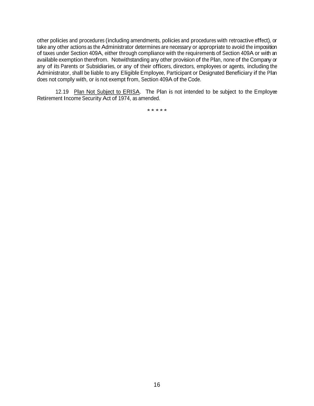 16 other policies and procedures (including amendments, policies and procedures with retroactive effect), or take any other actions as the Administrator determines are necessary or appropriate to avoid the imposition of taxes under Section 409A, either through compliance with the requirements of Section 409A or with an available exemption therefrom. Notwithstanding any other provision of the Plan, none of the Company or any of its Parents or Subsidiaries, or any of their officers, directors, employees or agents, including the Administrator, shall be liable to any Eligible Employee, Participant or Designated Beneficiary if the Plan does not comply with, or is not exempt from, Section 409A of the Code. 12.19 Plan Not Subject to ERISA. The Plan is not intended to be subject to the Employee Retirement Income Security Act of 1974, as amended. * * * * *