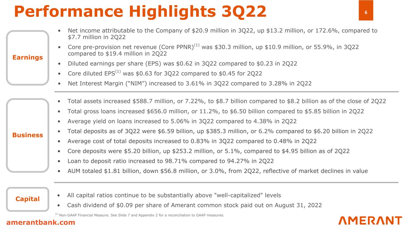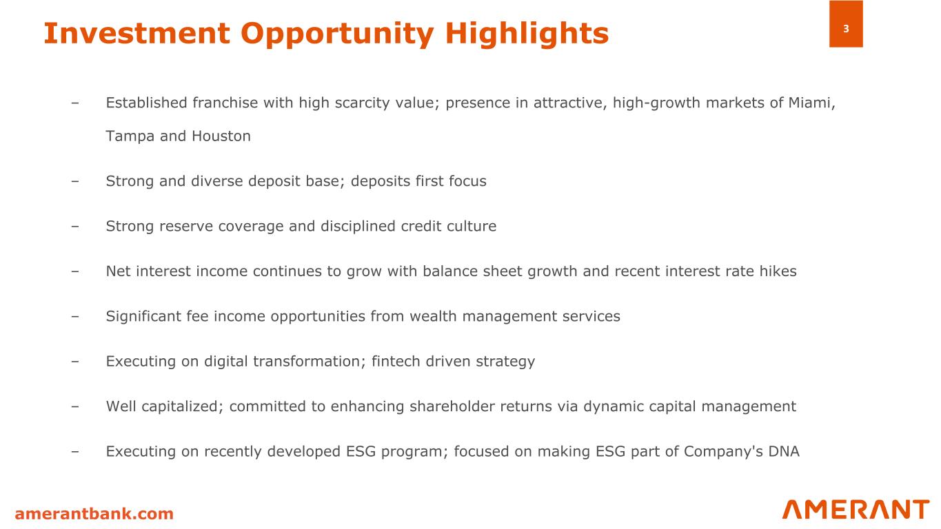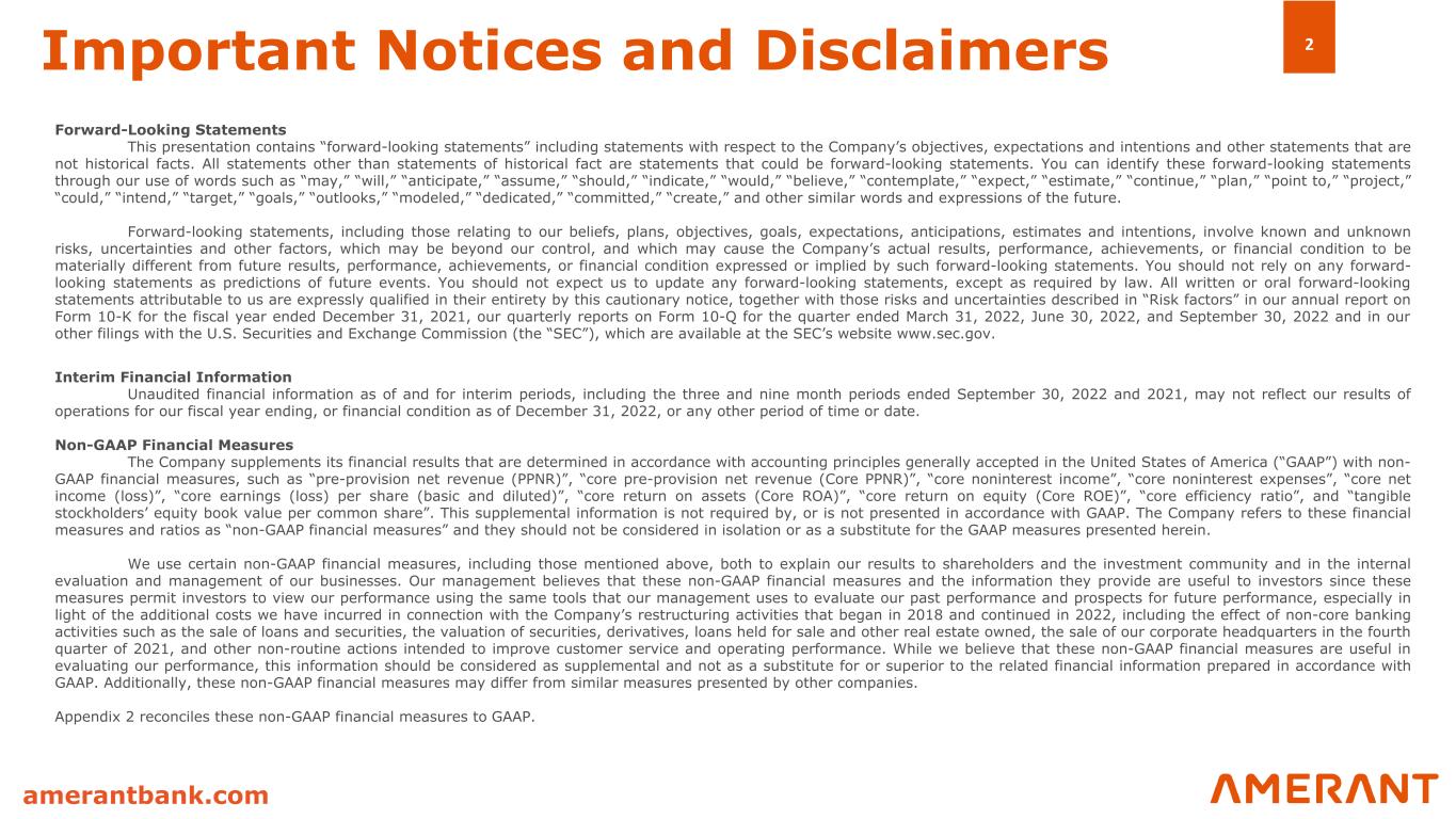 2 amerantbank.com Forward-Looking Statements This presentation contains “forward-looking statements” including statements with respect to the Company’s objectives, expectations and intentions and other statements that are not historical facts. All statements other than statements of historical fact are statements that could be forward-looking statements. You can identify these forward-looking statements through our use of words such as “may,” “will,” “anticipate,” “assume,” “should,” “indicate,” “would,” “believe,” “contemplate,” “expect,” “estimate,” “continue,” “plan,” “point to,” “project,” “could,” “intend,” “target,” “goals,” “outlooks,” “modeled,” “dedicated,” “committed,” “create,” and other similar words and expressions of the future. Forward-looking statements, including those relating to our beliefs, plans, objectives, goals, expectations, anticipations, estimates and intentions, involve known and unknown risks, uncertainties and other factors, which may be beyond our control, and which may cause the Company’s actual results, performance, achievements, or financial condition to be materially different from future results, performance, achievements, or financial condition expressed or implied by such forward-looking statements. You should not rely on any forward- looking statements as predictions of future events. You should not expect us to update any forward-looking statements, except as required by law. All written or oral forward-looking statements attributable to us are expressly qualified in their entirety by this cautionary notice, together with those risks and uncertainties described in “Risk factors” in our annual report on Form 10-K for the fiscal year ended December 31, 2021, our quarterly reports on Form 10-Q for the quarter ended March 31, 2022, June 30, 2022, and September 30, 2022 and in our other filings with the U.S. Securities and Exchange Commission (the “SEC”), which are available at the SEC’s website www.sec.gov. Interim Financial Information Unaudited financial information as of and for interim periods, including the three and nine month periods ended September 30, 2022 and 2021, may not reflect our results of operations for our fiscal year ending, or financial condition as of December 31, 2022, or any other period of time or date. Non-GAAP Financial Measures The Company supplements its financial results that are determined in accordance with accounting principles generally accepted in the United States of America (“GAAP”) with non- GAAP financial measures, such as “pre-provision net revenue (PPNR)”, “core pre-provision net revenue (Core PPNR)”, “core noninterest income”, “core noninterest expenses”, “core net income (loss)”, “core earnings (loss) per share (basic and diluted)”, “core return on assets (Core ROA)”, “core return on equity (Core ROE)”, “core efficiency ratio”, and “tangible stockholders’ equity book value per common share”. This supplemental information is not required by, or is not presented in accordance with GAAP. The Company refers to these financial measures and ratios as “non-GAAP financial measures” and they should not be considered in isolation or as a substitute for the GAAP measures presented herein. We use certain non-GAAP financial measures, including those mentioned above, both to explain our results to shareholders and the investment community and in the internal evaluation and management of our businesses. Our management believes that these non-GAAP financial measures and the information they provide are useful to investors since these measures permit investors to view our performance using the same tools that our management uses to evaluate our past performance and prospects for future performance, especially in light of the additional costs we have incurred in connection with the Company’s restructuring activities that began in 2018 and continued in 2022, including the effect of non-core banking activities such as the sale of loans and securities, the valuation of securities, derivatives, loans held for sale and other real estate owned, the sale of our corporate headquarters in the fourth quarter of 2021, and other non-routine actions intended to improve customer service and operating performance. While we believe that these non-GAAP financial measures are useful in evaluating our performance, this information should be considered as supplemental and not as a substitute for or superior to the related financial information prepared in accordance with GAAP. Additionally, these non-GAAP financial measures may differ from similar measures presented by other companies. Appendix 2 reconciles these non-GAAP financial measures to GAAP. Important Notices and Disclaimers