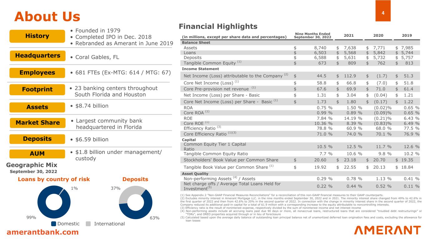 3 amerantbank.com Investment Opportunity Highlights – Established franchise with high scarcity value; presence in attractive, high-growth markets of Miami, Tampa and Houston – Strong and diverse deposit base; deposits first focus – Strong reserve coverage and disciplined credit culture – Net interest income continues to grow with balance sheet growth and recent interest rate hikes – Significant fee income opportunities from wealth management services – Executing on digital transformation; fintech driven strategy – Well capitalized; committed to enhancing shareholder returns via dynamic capital management – Executing on recently developed ESG program; focused on making ESG part of Company's DNA