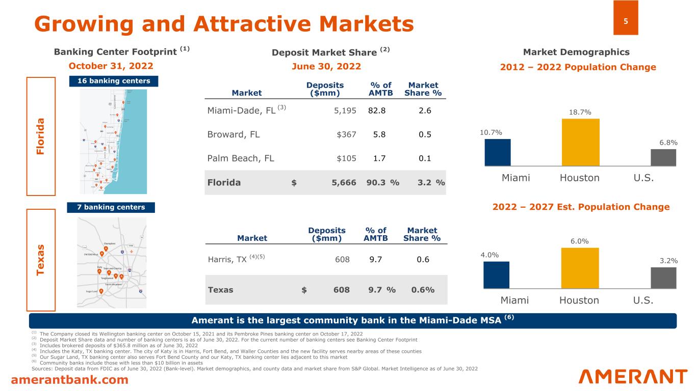 4 amerantbank.com 99% 1% 63% 37% Domestic • Largest community bank headquartered in Florida About Us • 23 banking centers throughout South Florida and Houston • $6.59 billion • $8.74 billion • Coral Gables, FL • 681 FTEs (Ex-MTG: 614 / MTG: 67) • $1.8 billion under management/ custody • Founded in 1979 • Completed IPO in Dec. 2018 • Rebranded as Amerant in June 2019 Footprint Assets Headquarters Employees Loans by country of risk Deposits Geographic Mix Financial Highlights AUM (1) See Appendix 2 ”Non-GAAP Financial Measures Reconciliations" for a reconciliation of this non-GAAP financial measures to their GAAP counterparts. (2) Excludes minority interest in Amerant Mortgage LLC. in the nine months ended September 30, 2022 and in 2021. The minority interest share changed from 49% to 42.6% in the first quarter of 2022 and then from 42.6% to 20% in the second quarter of 2022. In connection with the change in minority interest share in the second quarter of 2022, the Company reduced its additional paid-in capital for a total of $1.9 million with a corresponding increase to the equity attributable to noncontrolling interests. (3) Efficiency ratio is the result of noninterest expense, respectively divided by the sum of noninterest income and net interest income (4) Non-performing assets include all accruing loans past due 90 days or more, all nonaccrual loans, restructured loans that are considered “troubled debt restructurings” or “TDRs”, and OREO properties acquired through or in lieu of foreclosure (5) Calculated based upon the average daily balance of outstanding loan principal balance net of unamortized deferred loan origination fees and costs, excluding the allowance for loan losses Market Share History Deposits September 30, 2022 (in millions, except per share data and percentages) Nine Months Ended September 30, 2022 2021 2020 2019 Balance Sheet Assets $ 8,740 $ 7,638 $ 7,771 $ 7,985 Loans $ 6,503 $ 5,568 $ 5,842 $ 5,744 Deposits $ 6,588 $ 5,631 $ 5,732 $ 5,757 Tangible Common Equity (1) $ 673 $ 809 $ 762 $ 813 Income Statement Net Income (Loss) attributable to the Company (2) $ 44.5 $ 112.9 $ (1.7) $ 51.3 Core Net Income (Loss) (1) $ 58.8 $ 66.8 $ (7.0) $ 51.8 Core Pre-provision net revenue (1) $ 67.6 $ 69.9 $ 71.0 $ 61.4 Net Income (Loss) per Share - Basic $ 1.31 $ 3.04 $ (0.04) $ 1.21 Core Net Income (Loss) per Share - Basic (1) $ 1.73 $ 1.80 $ (0.17) $ 1.22 ROA 0.75 % 1.50 % (0.02) % 0.65 % Core ROA (1) 0.99 % 0.89 % (0.09) % 0.65 % ROE 7.84 % 14.19 % (0.21) % 6.43 % Core ROE (1) 10.36 % 8.39 % (0.83) % 6.49 % Efficiency Ratio (3) 78.8 % 60.9 % 68.0 % 77.5 % Core Efficiency Ratio (1)(3) 71.0 % 74.0 % 70.1 % 76.9 % Capital Common Equity Tier 1 Capital Ratio 10.5 % 12.5 % 11.7 % 12.6 % Tangible Common Equity Ratio 7.7 % 10.6 % 9.8 % 10.2 % Stockholders' Book Value per Common Share $ 20.60 $ 23.18 $ 20.70 $ 19.35 Tangible Book Value per Common Share (1) $ 19.92 $ 22.55 $ 20.13 $ 18.84 Asset Quality Non-performing Assets (4) / Assets 0.29 % 0.78 % 1.13 % 0.41 % Net charge offs / Average Total Loans Held for Investment(5) 0.22 % 0.44 % 0.52 % 0.11 % International