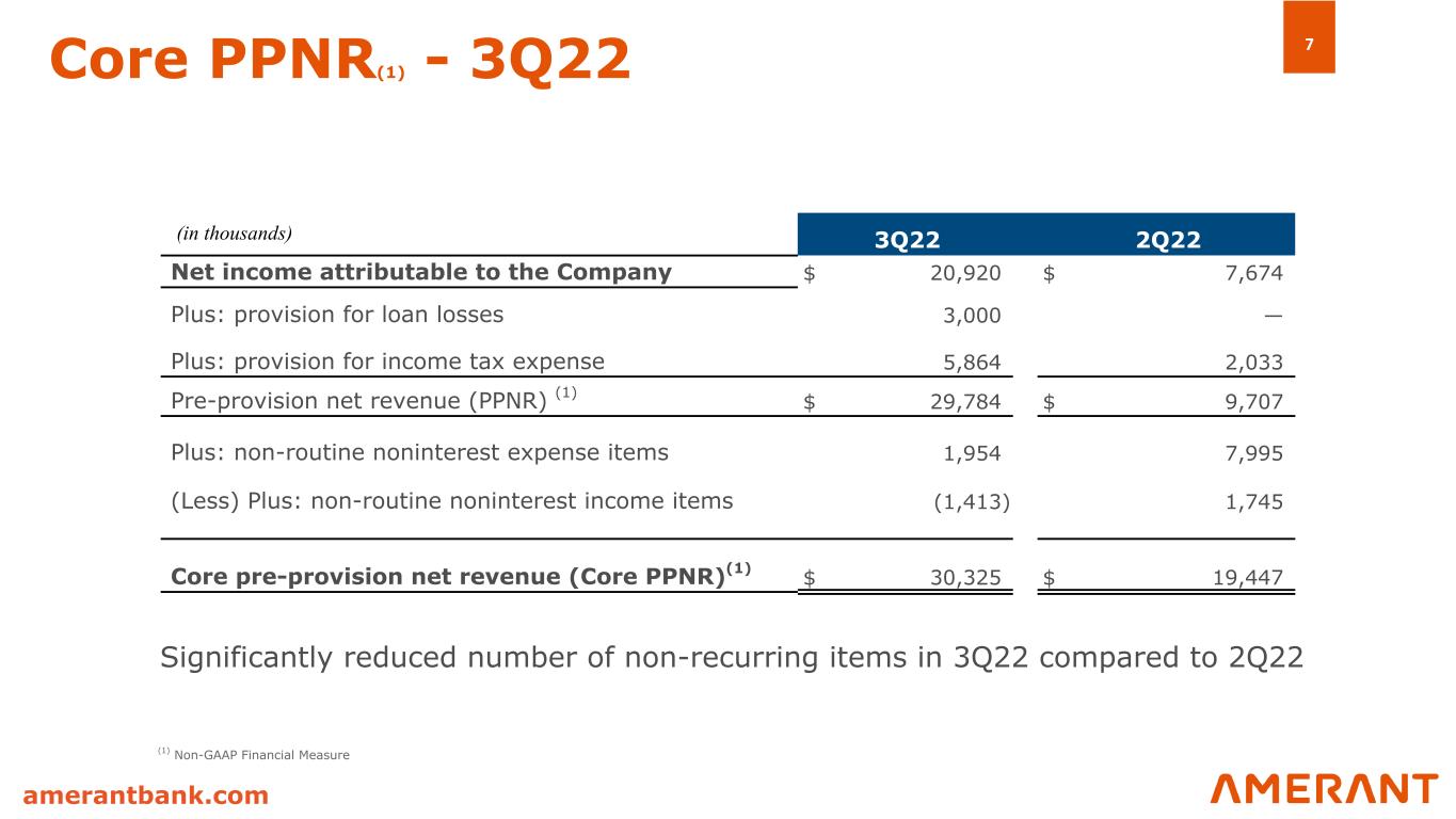 6 amerantbank.com Performance Highlights 3Q22 Business • Net income attributable to the Company of $20.9 million in 3Q22, up $13.2 million, or 172.6%, compared to $7.7 million in 2Q22 • Core pre-provision net revenue (Core PPNR)(1) was $30.3 million, up $10.9 million, or 55.9%, in 3Q22 compared to $19.4 million in 2Q22 • Diluted earnings per share (EPS) was $0.62 in 3Q22 compared to $0.23 in 2Q22 • Core diluted EPS(1) was $0.63 for 3Q22 compared to $0.45 for 2Q22 • Net Interest Margin (“NIM”) increased to 3.61% in 3Q22 compared to 3.28% in 2Q22 • Total assets increased $588.7 million, or 7.22%, to $8.7 billion compared to $8.2 billion as of the close of 2Q22 • Total gross loans increased $656.0 million, or 11.2%, to $6.50 billion compared to $5.85 billion in 2Q22 • Average yield on loans increased to 5.06% in 3Q22 compared to 4.38% in 2Q22 • Total deposits as of 3Q22 were $6.59 billion, up $385.3 million, or 6.2% compared to $6.20 billion in 2Q22 • Average cost of total deposits increased to 0.83% in 3Q22 compared to 0.48% in 2Q22 • Core deposits were $5.20 billion, up $253.2 million, or 5.1%, compared to $4.95 billion as of 2Q22 • Loan to deposit ratio increased to 98.71% compared to 94.27% in 2Q22 • AUM totaled $1.81 billion, down $56.8 million, or 3.0%, from 2Q22, reflective of market declines in value Earnings (1) Non-GAAP Financial Measure. See Slide 7 and Appendix 2 for a reconciliation to GAAP measures. Capital • All capital ratios continue to be substantially above "well-capitalized" levels • Cash dividend of $0.09 per share of Amerant common stock paid out on August 31, 2022