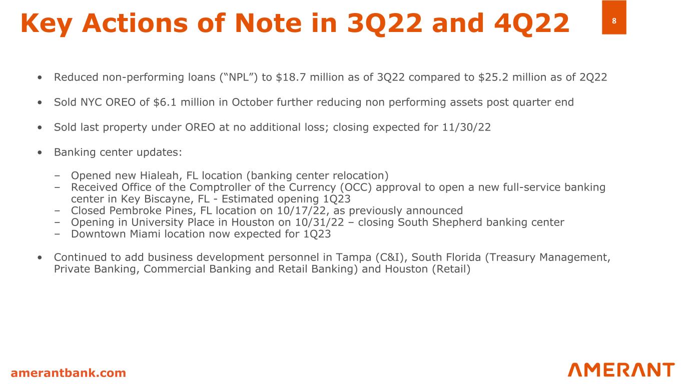 7 amerantbank.com Core PPNR(1) - 3Q22 (1) Non-GAAP Financial Measure ( 3Q22 2Q22 Net income attributable to the Company $ 20,920 $ 7,674 Plus: provision for loan losses 3,000 — Plus: provision for income tax expense 5,864 2,033 Pre-provision net revenue (PPNR) (1) $ 29,784 $ 9,707 Plus: non-routine noninterest expense items 1,954 7,995 (Less) Plus: non-routine noninterest income items (1,413) 1,745 Core pre-provision net revenue (Core PPNR)(1) $ 30,325 $ 19,447 (in thousands) Significantly reduced number of non-recurring items in 3Q22 compared to 2Q22