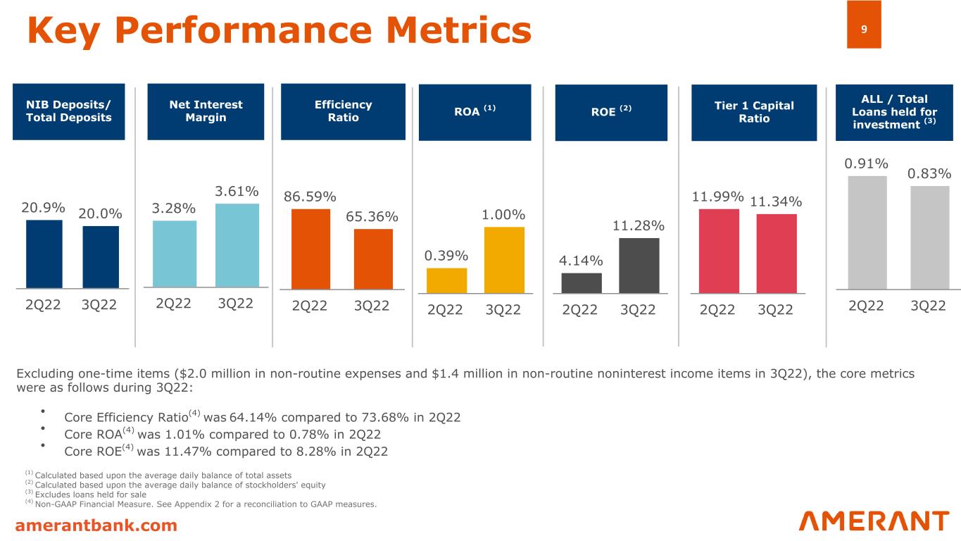 8 amerantbank.com Key Actions of Note in 3Q22 and 4Q22 • Reduced non-performing loans (“NPL”) to $18.7 million as of 3Q22 compared to $25.2 million as of 2Q22 • Sold NYC OREO of $6.1 million in October further reducing non performing assets post quarter end • Sold last property under OREO at no additional loss; closing expected for 11/30/22 • Banking center updates: – Opened new Hialeah, FL location (banking center relocation) – Received Office of the Comptroller of the Currency (OCC) approval to open a new full-service banking center in Key Biscayne, FL - Estimated opening 1Q23 – Closed Pembroke Pines, FL location on 10/17/22, as previously announced – Opening in University Place in Houston on 10/31/22 – closing South Shepherd banking center – Downtown Miami location now expected for 1Q23 • Continued to add business development personnel in Tampa (C&I), South Florida (Treasury Management, Private Banking, Commercial Banking and Retail Banking) and Houston (Retail)
