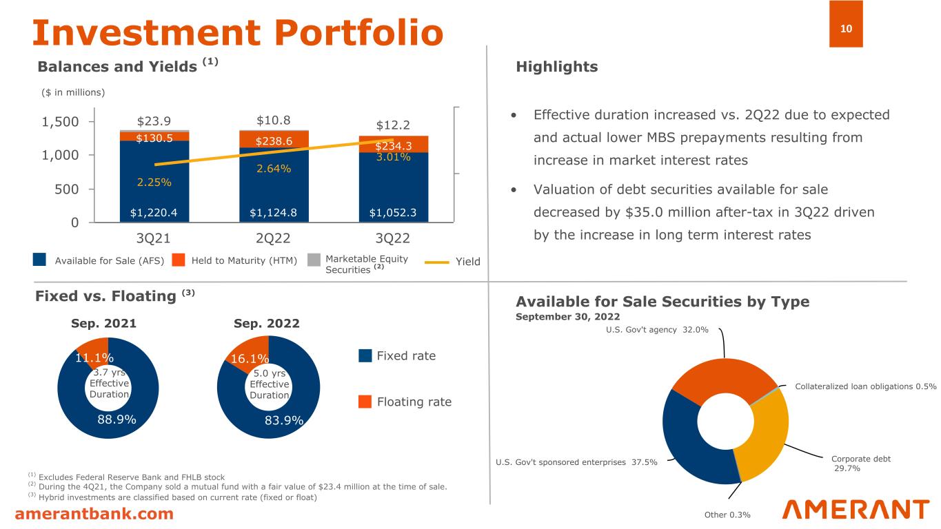 9 amerantbank.com 86.59% 65.36% 2Q22 3Q22 20.9% 20.0% 2Q22 3Q22 11.99% 11.34% 2Q22 3Q22 3.28% 3.61% 2Q22 3Q22 Key Performance Metrics NIB Deposits/ Total Deposits Tier 1 Capital Ratio Net Interest Margin Efficiency Ratio (1) Calculated based upon the average daily balance of total assets (2) Calculated based upon the average daily balance of stockholders' equity (3) Excludes loans held for sale (4) Non-GAAP Financial Measure. See Appendix 2 for a reconciliation to GAAP measures. 0.91% 0.83% 2Q22 3Q22 ALL / Total Loans held for investment (3) 0.39% 1.00% 2Q22 3Q22 ROA (1) 4.14% 11.28% 2Q22 3Q22 Excluding one-time items ($2.0 million in non-routine expenses and $1.4 million in non-routine noninterest income items in 3Q22), the core metrics were as follows during 3Q22: • Core Efficiency Ratio(4) was 64.14% compared to 73.68% in 2Q22 • Core ROA(4) was 1.01% compared to 0.78% in 2Q22 • Core ROE(4) was 11.47% compared to 8.28% in 2Q22 ROE (2)