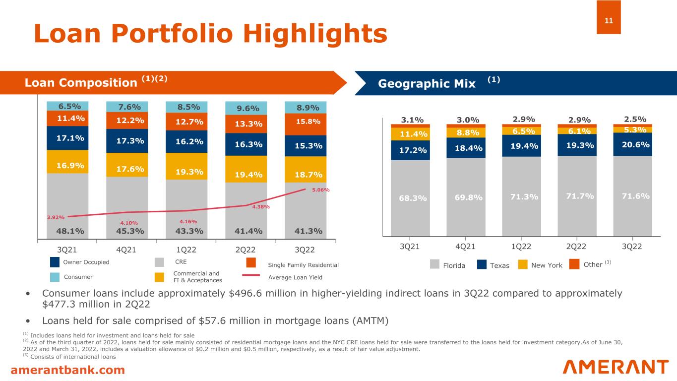 10 amerantbank.com 83.9% 16.1% U.S. Gov't sponsored enterprises 37.5% U.S. Gov't agency 32.0% Collateralized loan obligations 0.5% Corporate debt 29.7% Other 0.3% $1,220.4 $1,124.8 $1,052.3 $130.5 $238.6 $234.3 $23.9 $10.8 $12.2 2.25% 2.64% 3.01% 3Q21 2Q22 3Q22 0 500 1,000 1,500 88.9% 11.1% • Effective duration increased vs. 2Q22 due to expected and actual lower MBS prepayments resulting from increase in market interest rates • Valuation of debt securities available for sale decreased by $35.0 million after-tax in 3Q22 driven by the increase in long term interest rates Investment Portfolio Balances and Yields (1) Available for Sale (AFS) Held to Maturity (HTM) Highlights Fixed vs. Floating (3) Sep. 2021 Sep. 2022 Floating rate Fixed rate Available for Sale Securities by Type September 30, 2022 3.7 yrs Effective Duration ($ in millions) Marketable Equity Securities (2) (1) Excludes Federal Reserve Bank and FHLB stock (2) During the 4Q21, the Company sold a mutual fund with a fair value of $23.4 million at the time of sale. (3) Hybrid investments are classified based on current rate (fixed or float) Yield 5.0 yrs Effective Duration