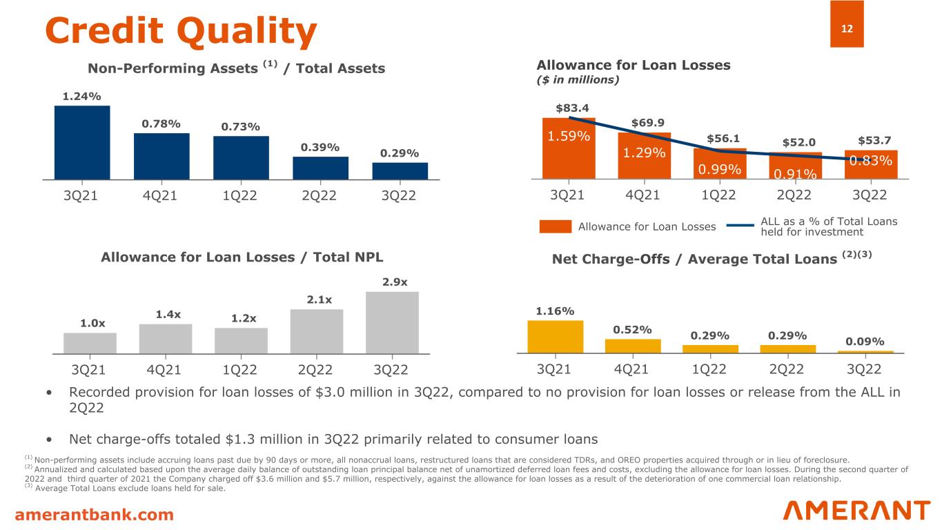 11 amerantbank.com 48.1% 45.3% 43.3% 41.4% 41.3% 16.9% 17.6% 19.3% 19.4% 18.7% 17.1% 17.3% 16.2% 16.3% 15.3% 11.4% 12.2% 12.7% 13.3% 15.8% 6.5% 7.6% 8.5% 9.6% 8.9% 3.92% 4.10% 4.16% 4.38% 5.06% 3Q21 4Q21 1Q22 2Q22 3Q22 68.3% 69.8% 71.3% 71.7% 71.6% 17.2% 18.4% 19.4% 19.3% 20.6% 11.4% 8.8% 6.5% 6.1% 5.3% 3.1% 3.0% 2.9% 2.9% 2.5% 3Q21 4Q21 1Q22 2Q22 3Q22 Consumer CRE Commercial and FI & Acceptances Owner Occupied Single Family Residential Loan Portfolio Highlights Loan Composition (1)(2) Geographic Mix (Domestic) • Consumer loans include approximately $496.6 million in higher-yielding indirect loans in 3Q22 compared to approximately $477.3 million in 2Q22 • Loans held for sale comprised of $57.6 million in mortgage loans (AMTM) (1) Florida Texas New York Average Loan Yield Other (3) (1) Includes loans held for investment and loans held for sale (2) As of the third quarter of 2022, loans held for sale mainly consisted of residential mortgage loans and the NYC CRE loans held for sale were transferred to the loans held for investment category.As of June 30, 2022 and March 31, 2022, includes a valuation allowance of $0.2 million and $0.5 million, respectively, as a result of fair value adjustment. (3) Consists of international loans
