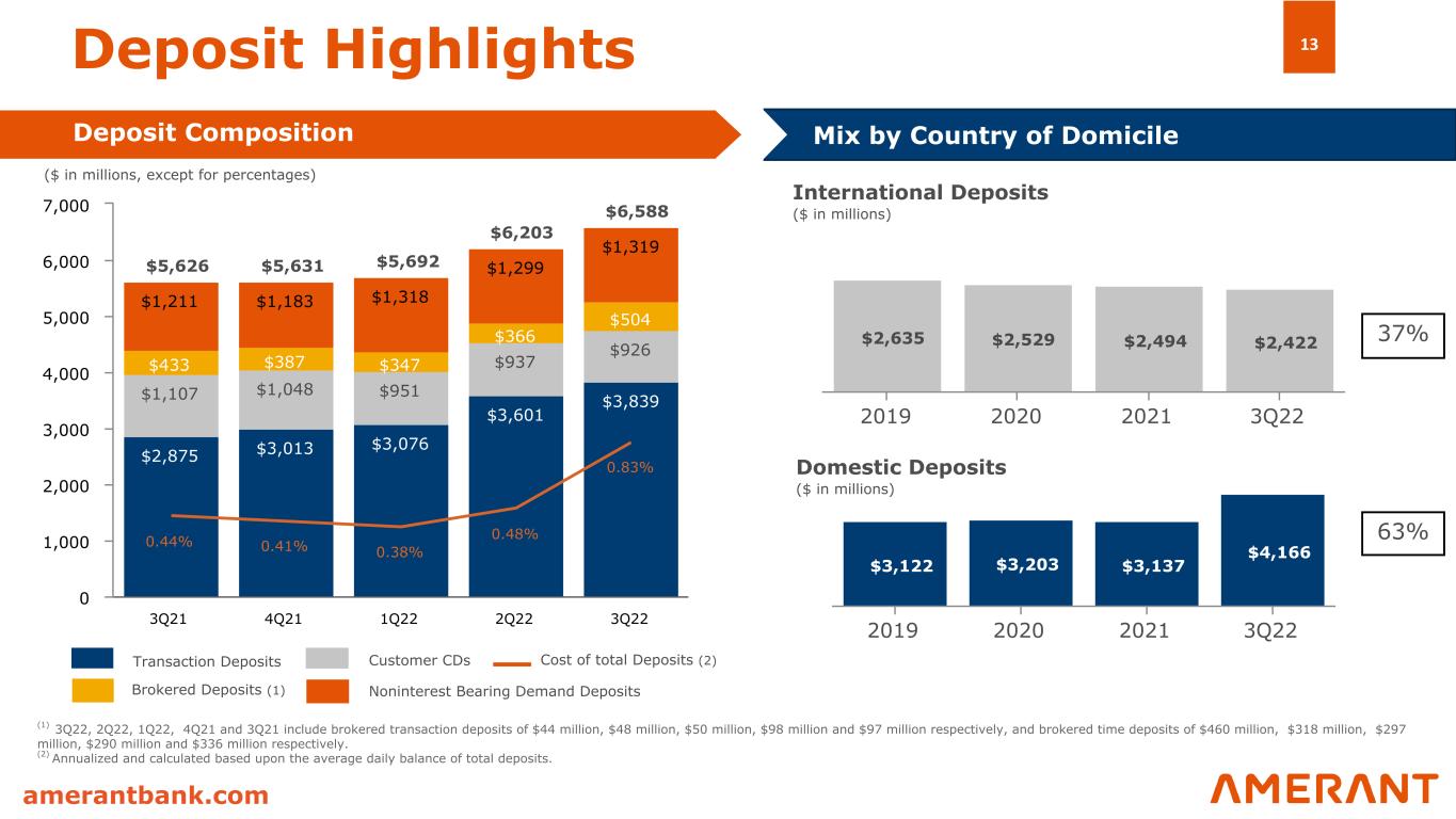 12 amerantbank.com $83.4 $69.9 $56.1 $52.0 $53.71.59% 1.29% 0.99% 0.91% 0.83% 3Q21 4Q21 1Q22 2Q22 3Q22 1.16% 0.52% 0.29% 0.29% 0.09% 3Q21 4Q21 1Q22 2Q22 3Q22 • Recorded provision for loan losses of $3.0 million in 3Q22, compared to no provision for loan losses or release from the ALL in 2Q22 • Net charge-offs totaled $1.3 million in 3Q22 primarily related to consumer loans Net Charge-Offs / Average Total Loans (2)(3) Credit Quality Allowance for Loan Losses ($ in millions) Non-Performing Assets (1) / Total Assets Allowance for Loan Losses / Total NPL Allowance for Loan Losses ALL as a % of Total Loans held for investment (1) Non-performing assets include accruing loans past due by 90 days or more, all nonaccrual loans, restructured loans that are considered TDRs, and OREO properties acquired through or in lieu of foreclosure. (2) Annualized and calculated based upon the average daily balance of outstanding loan principal balance net of unamortized deferred loan fees and costs, excluding the allowance for loan losses. During the second quarter of 2022 and third quarter of 2021 the Company charged off $3.6 million and $5.7 million, respectively, against the allowance for loan losses as a result of the deterioration of one commercial loan relationship. (3) Average Total Loans exclude loans held for sale. 1.24% 0.78% 0.73% 0.39% 0.29% 3Q21 4Q21 1Q22 2Q22 3Q22 1.0x 1.4x 1.2x 2.1x 2.9x 3Q21 4Q21 1Q22 2Q22 3Q22