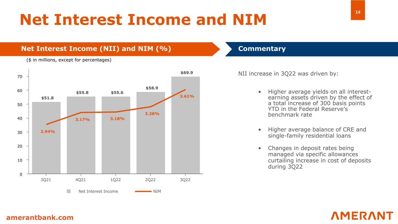 13 amerantbank.com $5,626 $5,631 $5,692 $6,203 $6,588 $2,875 $3,013 $3,076 $3,601 $3,839$1,107 $1,048 $951 $937 $926 $433 $387 $347 $366 $504 $1,211 $1,183 $1,318 $1,299 $1,319 0.44% 0.41% 0.38% 0.48% 0.83% 3Q21 4Q21 1Q22 2Q22 3Q22 0 1,000 2,000 3,000 4,000 5,000 6,000 7,000 $2,635 $2,529 $2,494 $2,422 2019 2020 2021 3Q22 $3,122 $3,203 $3,137 $4,166 2019 2020 2021 3Q22 Domestic Deposits ($ in millions) Deposit Highlights Deposit Composition 63% International Deposits ($ in millions) Mix by Country of Domicile Transaction Deposits Customer CDs Brokered Deposits (1) Cost of total Deposits (2) ($ in millions, except for percentages) 37% (1) 3Q22, 2Q22, 1Q22, 4Q21 and 3Q21 include brokered transaction deposits of $44 million, $48 million, $50 million, $98 million and $97 million respectively, and brokered time deposits of $460 million, $318 million, $297 million, $290 million and $336 million respectively. (2) Annualized and calculated based upon the average daily balance of total deposits. Noninterest Bearing Demand Deposits