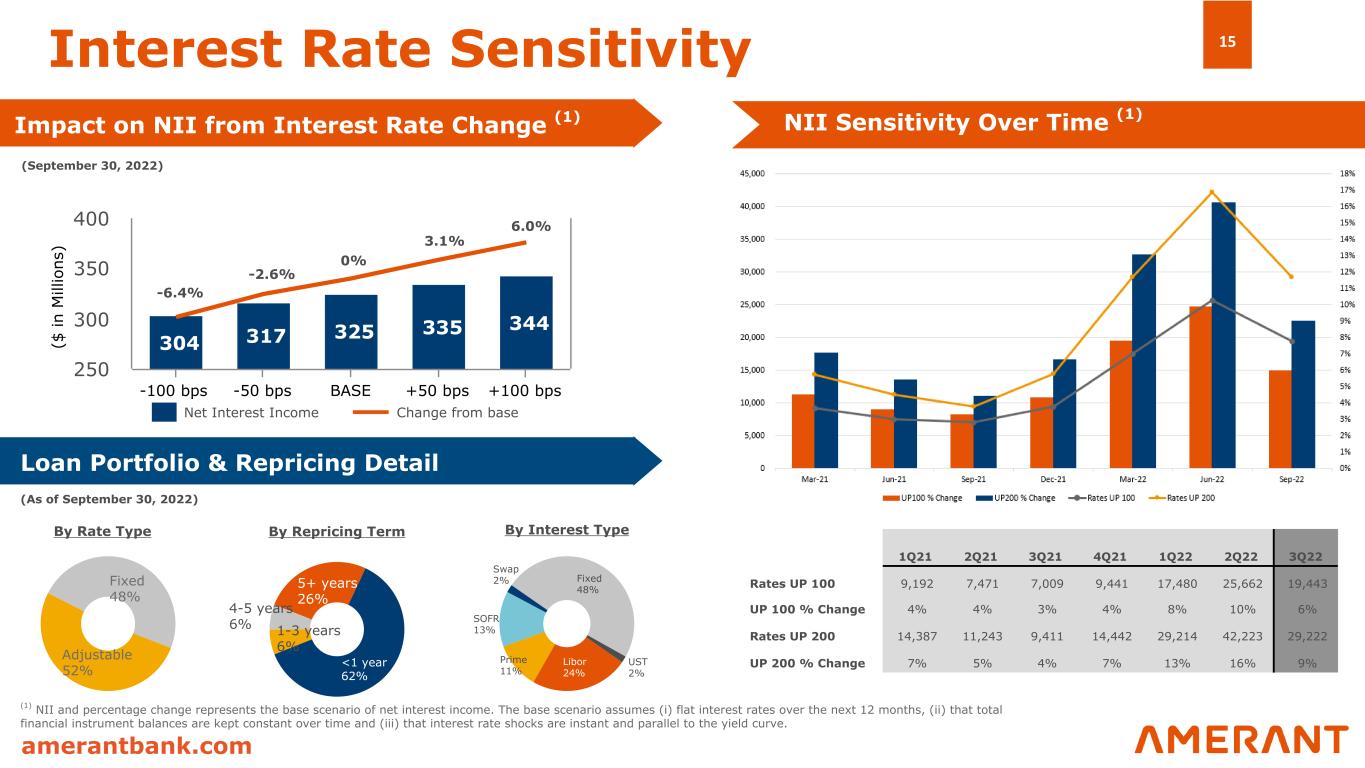 14 amerantbank.com $51.8 $55.8 $55.6 $58.9 $69.9 2.94% 3.17% 3.18% 3.28% 3.61% Net Interest Income NIM 3Q21 4Q21 1Q22 2Q22 3Q22 0 10 20 30 40 50 60 70 NII increase in 3Q22 was driven by: • Higher average yields on all interest- earning assets driven by the effect of a total increase of 300 basis points YTD in the Federal Reserve’s benchmark rate • Higher average balance of CRE and single-family residential loans • Changes in deposit rates being managed via specific allowances curtailing increase in cost of deposits during 3Q22 Net Interest Income and NIM Net Interest Income (NII) and NIM (%) Commentary ($ in millions, except for percentages)