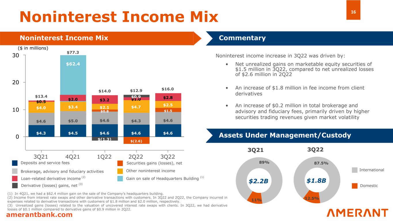 15 amerantbank.com 304 317 325 335 344 -100 bps -50 bps BASE +50 bps +100 bps 250 300 350 400 (September 30, 2022) Fixed 48% Adjustable 52% Interest Rate Sensitivity By Interest TypeBy Rate Type By Repricing Term (1) NII and percentage change represents the base scenario of net interest income. The base scenario assumes (i) flat interest rates over the next 12 months, (ii) that total financial instrument balances are kept constant over time and (iii) that interest rate shocks are instant and parallel to the yield curve. Loan Portfolio & Repricing Detail Impact on NII from Interest Rate Change (1) Net Interest Income Change from base <1 year 62% 1-3 years 6% 4-5 years 6% 5+ years 26% ($ in M ill io ns ) (As of September 30, 2022) Swap 2% Fixed 48% UST 2% Libor 24% Prime 11% SOFR 13% NII Sensitivity Over Time (1) -6.4% -2.6% 0% 6.0% 3.1% 1Q21 2Q21 3Q21 4Q21 1Q22 2Q22 3Q22 Rates UP 100 9,192 7,471 7,009 9,441 17,480 25,662 19,443 UP 100 % Change 4% 4% 3% 4% 8% 10% 6% Rates UP 200 14,387 11,243 9,411 14,442 29,214 42,223 29,222 UP 200 % Change 7% 5% 4% 7% 13% 16% 9%