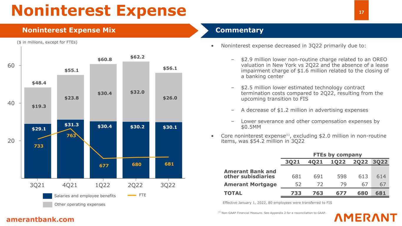 16 amerantbank.com $14.0 $16.0 $13.4 $12.9 $4.3 $4.5 $4.6 $4.6 $4.6 $4.6 $5.0 $4.6 $4.3 $4.6 $0.8 $(2.6) $1.5 $4.0 $3.4 $2.1 $4.7 $2.5 $0.5 $3.2 $1.0 $2.8 $(1.3) $0.9 3Q21 4Q21 1Q22 2Q22 3Q22 0 10 20 30 11% 89% 12.5% 87.5% Noninterest Income Mix Noninterest Income Mix Commentary Noninterest income increase in 3Q22 was driven by: • Net unrealized gains on marketable equity securities of $1.5 million in 3Q22, compared to net unrealized losses of $2.6 million in 2Q22 • An increase of $1.8 million in fee income from client derivatives • An increase of $0.2 million in total brokerage and advisory and fiduciary fees, primarily driven by higher securities trading revenues given market volatility Assets Under Management/Custody Deposits and service fees Brokerage, advisory and fiduciary activities Other noninterest income $1.8B Domestic International 3Q223Q21 $2.2B ($ in millions) Securities gains (losses), net (1) In 4Q21, we had a $62.4 million gain on the sale of the Company’s headquarters building. (2) Income from interest rate swaps and other derivative transactions with customers. In 3Q22 and 2Q22, the Company incurred in expenses related to derivative transactions with customers of $1.8 million and $2.0 million, respectively. (3) Unrealized gains (losses) related to the valuation of uncovered interest rate swaps with clients. In 3Q22, we had derivative losses of $0.1 million compared to derivative gains of $0.9 million in 2Q22. Gain on sale of Headquarters Building (1)Loan-related derivative income (2) Derivative (losses) gains, net (3) $77.3 $2.0 $62.4