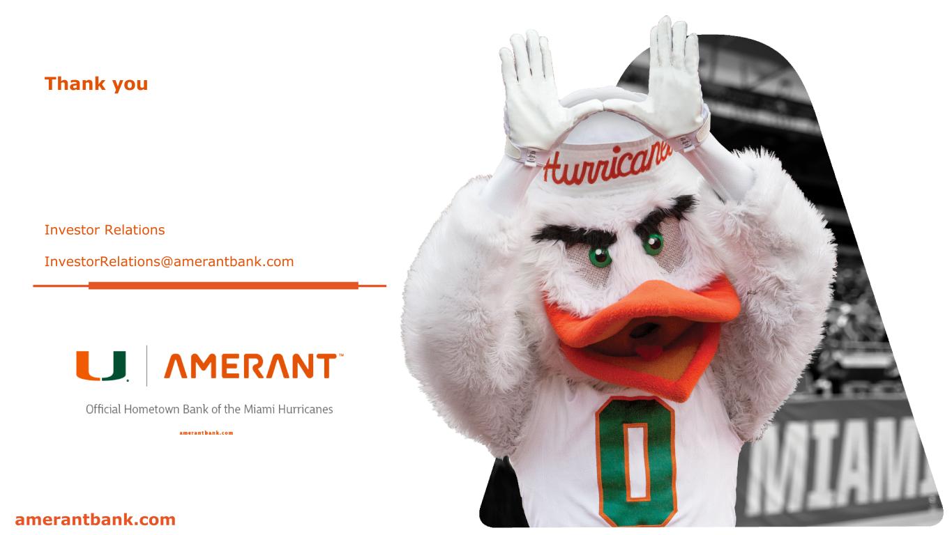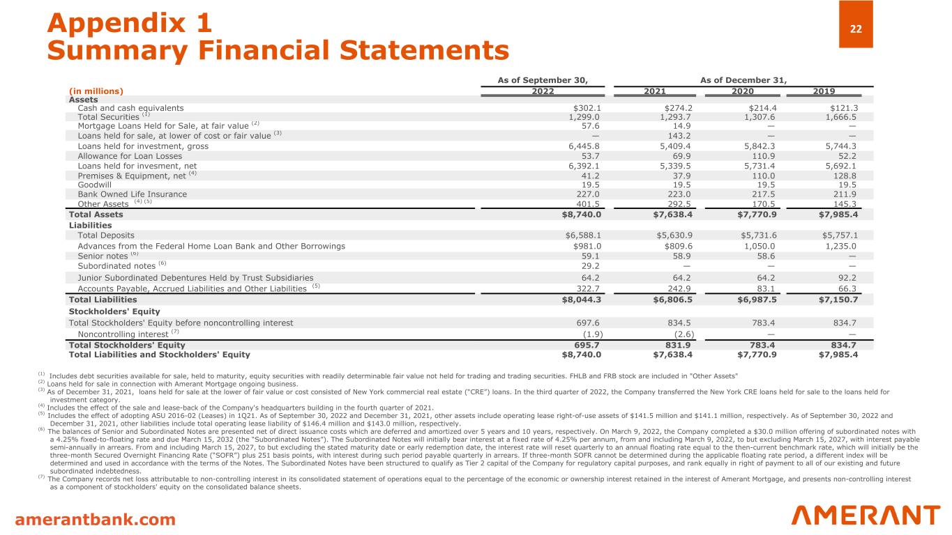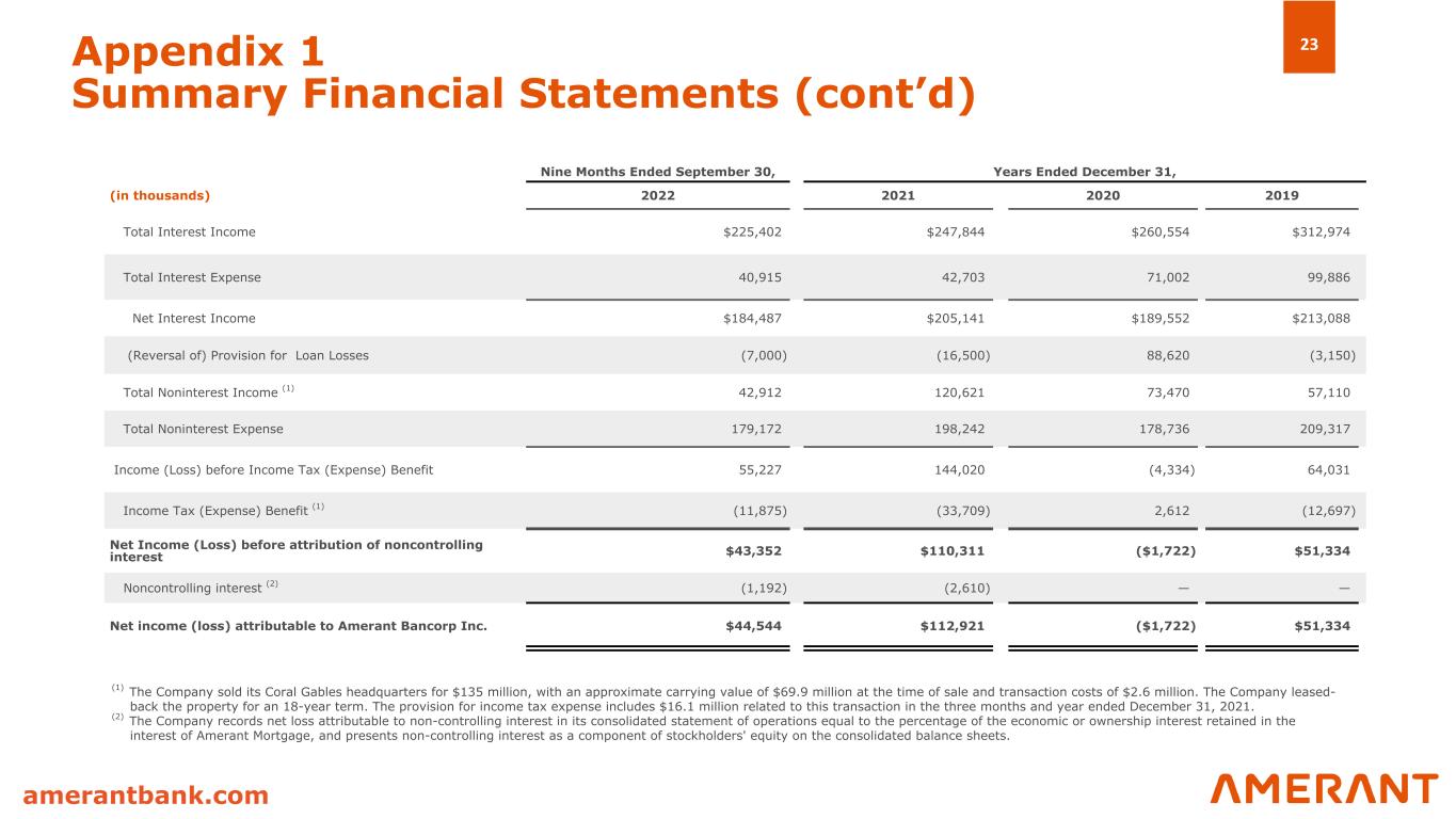 22 amerantbank.com Appendix 1 Summary Financial Statements (1) Includes debt securities available for sale, held to maturity, equity securities with readily determinable fair value not held for trading and trading securities. FHLB and FRB stock are included in "Other Assets" (2) Loans held for sale in connection with Amerant Mortgage ongoing business. (3) As of December 31, 2021, loans held for sale at the lower of fair value or cost consisted of New York commercial real estate (“CRE”) loans. In the third quarter of 2022, the Company transferred the New York CRE loans held for sale to the loans held for investment category. (4) Includes the effect of the sale and lease-back of the Company's headquarters building in the fourth quarter of 2021. (5) Includes the effect of adopting ASU 2016-02 (Leases) in 1Q21. As of September 30, 2022 and December 31, 2021, other assets include operating lease right-of-use assets of $141.5 million and $141.1 million, respectively. As of September 30, 2022 and December 31, 2021, other liabilities include total operating lease liability of $146.4 million and $143.0 million, respectively. (6) The balances of Senior and Subordinated Notes are presented net of direct issuance costs which are deferred and amortized over 5 years and 10 years, respectively. On March 9, 2022, the Company completed a $30.0 million offering of subordinated notes with a 4.25% fixed-to-floating rate and due March 15, 2032 (the “Subordinated Notes”). The Subordinated Notes will initially bear interest at a fixed rate of 4.25% per annum, from and including March 9, 2022, to but excluding March 15, 2027, with interest payable semi-annually in arrears. From and including March 15, 2027, to but excluding the stated maturity date or early redemption date, the interest rate will reset quarterly to an annual floating rate equal to the then-current benchmark rate, which will initially be the three-month Secured Overnight Financing Rate (“SOFR”) plus 251 basis points, with interest during such period payable quarterly in arrears. If three-month SOFR cannot be determined during the applicable floating rate period, a different index will be determined and used in accordance with the terms of the Notes. The Subordinated Notes have been structured to qualify as Tier 2 capital of the Company for regulatory capital purposes, and rank equally in right of payment to all of our existing and future subordinated indebtedness. (7) The Company records net loss attributable to non-controlling interest in its consolidated statement of operations equal to the percentage of the economic or ownership interest retained in the interest of Amerant Mortgage, and presents non-controlling interest as a component of stockholders' equity on the consolidated balance sheets. As of September 30, As of December 31, (in millions) 2022 2021 2020 2019 Assets Cash and cash equivalents $302.1 $274.2 $214.4 $121.3 Total Securities (1) 1,299.0 1,293.7 1,307.6 1,666.5 Mortgage Loans Held for Sale, at fair value (2) 57.6 14.9 — — Loans held for sale, at lower of cost or fair value (3) — 143.2 — — Loans held for investment, gross 6,445.8 5,409.4 5,842.3 5,744.3 Allowance for Loan Losses 53.7 69.9 110.9 52.2 Loans held for invesment, net 6,392.1 5,339.5 5,731.4 5,692.1 Premises & Equipment, net (4) 41.2 37.9 110.0 128.8 Goodwill 19.5 19.5 19.5 19.5 Bank Owned Life Insurance 227.0 223.0 217.5 211.9 Other Assets (4) (5) 401.5 292.5 170.5 145.3 Total Assets $8,740.0 $7,638.4 $7,770.9 $7,985.4 Liabilities Total Deposits $6,588.1 $5,630.9 $5,731.6 $5,757.1 Advances from the Federal Home Loan Bank and Other Borrowings $981.0 $809.6 1,050.0 1,235.0 Senior notes (6) 59.1 58.9 58.6 — Subordinated notes (6) 29.2 — — — Junior Subordinated Debentures Held by Trust Subsidiaries 64.2 64.2 64.2 92.2 Accounts Payable, Accrued Liabilities and Other Liabilities (5) 322.7 242.9 83.1 66.3 Total Liabilities $8,044.3 $6,806.5 $6,987.5 $7,150.7 Stockholders' Equity Total Stockholders' Equity before noncontrolling interest 697.6 834.5 783.4 834.7 Noncontrolling interest (7) (1.9) (2.6) — — Total Stockholders' Equity 695.7 831.9 783.4 834.7 Total Liabilities and Stockholders' Equity $8,740.0 $7,638.4 $7,770.9 $7,985.4