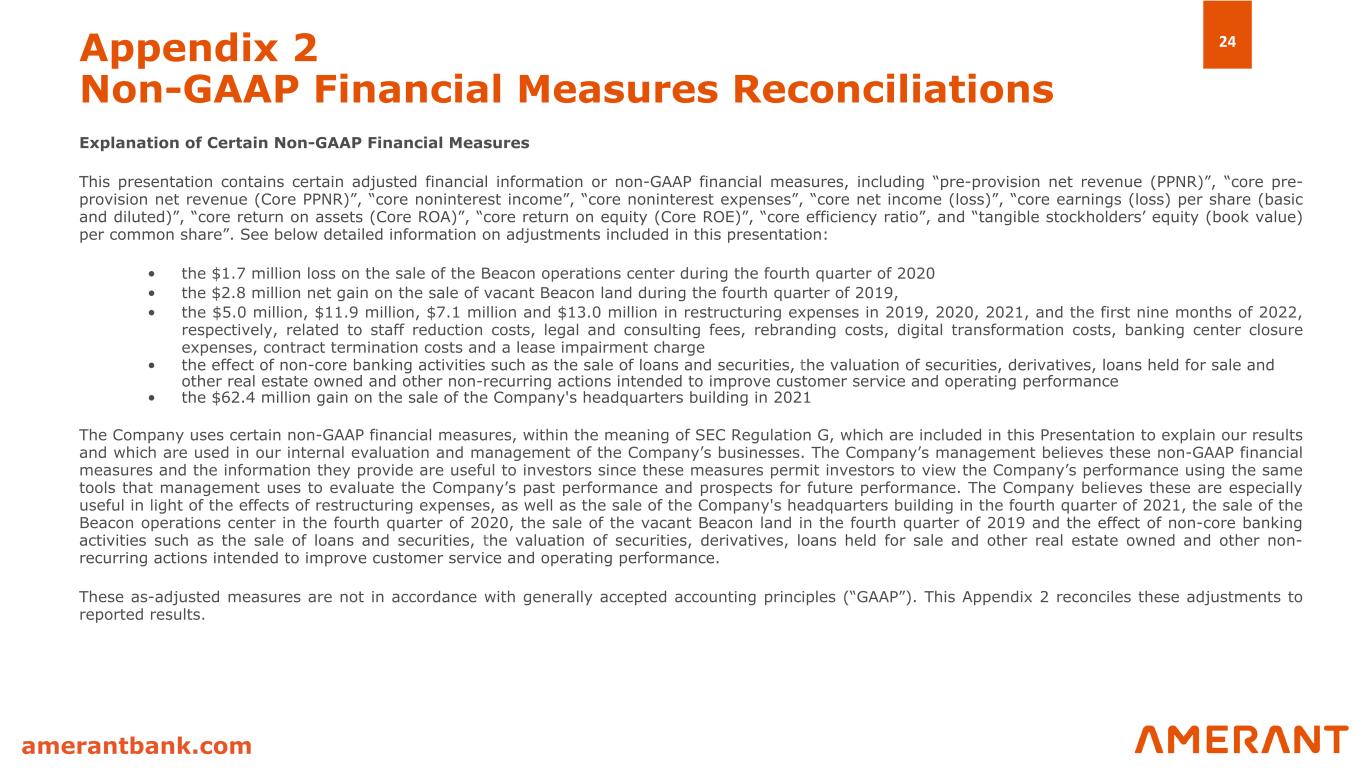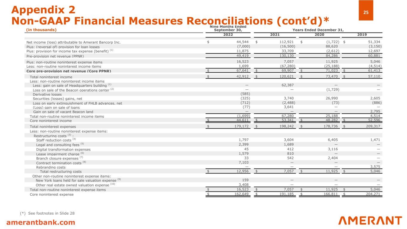 24 amerantbank.com Explanation of Certain Non-GAAP Financial Measures This presentation contains certain adjusted financial information or non-GAAP financial measures, including “pre-provision net revenue (PPNR)”, “core pre- provision net revenue (Core PPNR)”, “core noninterest income”, “core noninterest expenses”, “core net income (loss)”, “core earnings (loss) per share (basic and diluted)”, “core return on assets (Core ROA)”, “core return on equity (Core ROE)”, “core efficiency ratio”, and “tangible stockholders’ equity (book value) per common share”. See below detailed information on adjustments included in this presentation: • the $1.7 million loss on the sale of the Beacon operations center during the fourth quarter of 2020 • the $2.8 million net gain on the sale of vacant Beacon land during the fourth quarter of 2019, • the $5.0 million, $11.9 million, $7.1 million and $13.0 million in restructuring expenses in 2019, 2020, 2021, and the first nine months of 2022, respectively, related to staff reduction costs, legal and consulting fees, rebranding costs, digital transformation costs, banking center closure expenses, contract termination costs and a lease impairment charge • the effect of non-core banking activities such as the sale of loans and securities, the valuation of securities, derivatives, loans held for sale and other real estate owned and other non-recurring actions intended to improve customer service and operating performance • the $62.4 million gain on the sale of the Company's headquarters building in 2021 The Company uses certain non-GAAP financial measures, within the meaning of SEC Regulation G, which are included in this Presentation to explain our results and which are used in our internal evaluation and management of the Company’s businesses. The Company’s management believes these non-GAAP financial measures and the information they provide are useful to investors since these measures permit investors to view the Company’s performance using the same tools that management uses to evaluate the Company’s past performance and prospects for future performance. The Company believes these are especially useful in light of the effects of restructuring expenses, as well as the sale of the Company's headquarters building in the fourth quarter of 2021, the sale of the Beacon operations center in the fourth quarter of 2020, the sale of the vacant Beacon land in the fourth quarter of 2019 and the effect of non-core banking activities such as the sale of loans and securities, the valuation of securities, derivatives, loans held for sale and other real estate owned and other non- recurring actions intended to improve customer service and operating performance. These as-adjusted measures are not in accordance with generally accepted accounting principles (“GAAP”). This Appendix 2 reconciles these adjustments to reported results. Appendix 2 Non-GAAP Financial Measures Reconciliations