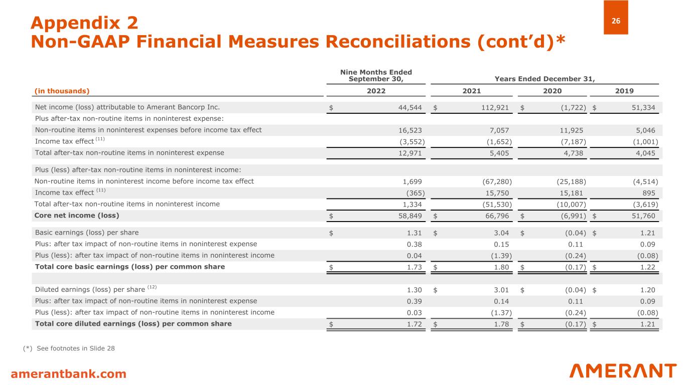 25 amerantbank.com (in thousands) Nine Months Ended September 30, Years Ended December 31, 2022 2021 2020 2019 Net income (loss) attributable to Amerant Bancorp Inc. $ 44,544 $ 112,921 $ (1,722) $ 51,334 Plus: (reversal of) provision for loan losses (7,000) (16,500) 88,620 (3,150) Plus: provision for income tax expense (benefit) (1) 11,875 33,709 (2,612) 12,697 Pre-provision net revenue (PPNR) 49,419 130,130 84,286 60,881 Plus: non-routine noninterest expense items 16,523 7,057 11,925 5,046 Less: non-routine noninterest income items 1,699 (67,280) (25,188) (4,514) Core pre-provision net revenue (Core PPNR) $ 67,641 $ 69,907 $ 71,023 $ 61,413 Total noninterest income $ 42,912 $ 120,621 $ 73,470 $ 57,110 Less: non-routine noninterest income items Less: gain on sale of Headquarters building (1) — 62,387 — — Loss on sale of the Beacon operations center (2) — — (1,729) — Derivative losses (585) Securities (losses) gains, net (325) 3,740 26,990 2,605 Loss on early extinguishment of FHLB advances, net (712) (2,488) (73) (886) (Loss) gain on sale of loans (77) 3,641 — — Gain on sale of vacant Beacon land — — — 2,795 Total non-routine noninterest income items (1,699) 67,280 25,188 4,514 Core noninterest income $ 44,611 $ 53,341 $ 48,282 $ 52,596 Total noninterest expenses $ 179,172 $ 198,242 $ 178,736 $ 209,317 Less: non-routine noninterest expense items: Restructuring costs (3) : Staff reduction costs (4) 1,797 3,604 6,405 1,471 Legal and consulting fees (5) 2,399 1,689 — — Digital transformation expenses 45 412 3,116 — Lease impairment charge (6) 1,579 810 — — Branch closure expenses (7) 33 542 2,404 — Contract termination costs (8) 7,103 — — — Rebranding costs — — — 3,575 Total restructuring costs $ 12,956 $ 7,057 $ 11,925 $ 5,046 Other non-routine noninterest expense items: New York loans held for sale valuation expense (9) 159 — — — Other real estate owned valuation expense (10) 3,408 — — — Total non-routine noninterest expense items $ 16,523 $ 7,057 $ 11,925 $ 5,046 Core noninterest expense $ 162,649 $ 191,185 $ 166,811 $ 204,271 Appendix 2 Non-GAAP Financial Measures Reconciliations (cont’d)* (*) See footnotes in Slide 28