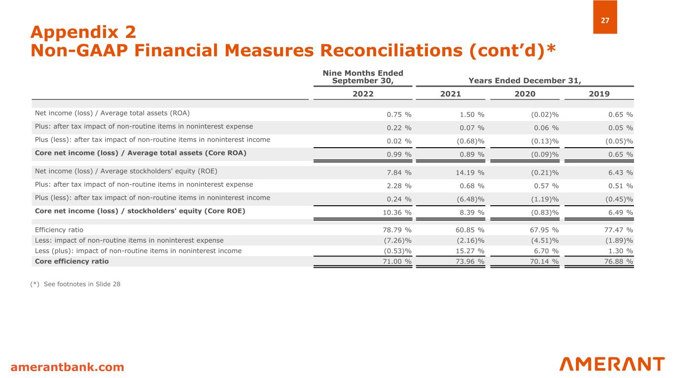 26 amerantbank.com Nine Months Ended September 30, Years Ended December 31, (in thousands) 2022 2021 2020 2019 Net income (loss) attributable to Amerant Bancorp Inc. $ 44,544 $ 112,921 $ (1,722) $ 51,334 Plus after-tax non-routine items in noninterest expense: Non-routine items in noninterest expenses before income tax effect 16,523 7,057 11,925 5,046 Income tax effect (11) (3,552) (1,652) (7,187) (1,001) Total after-tax non-routine items in noninterest expense 12,971 5,405 4,738 4,045 Plus (less) after-tax non-routine items in noninterest income: Non-routine items in noninterest income before income tax effect 1,699 (67,280) (25,188) (4,514) Income tax effect (11) (365) 15,750 15,181 895 Total after-tax non-routine items in noninterest income 1,334 (51,530) (10,007) (3,619) Core net income (loss) $ 58,849 $ 66,796 $ (6,991) $ 51,760 Basic earnings (loss) per share $ 1.31 $ 3.04 $ (0.04) $ 1.21 Plus: after tax impact of non-routine items in noninterest expense 0.38 0.15 0.11 0.09 Plus (less): after tax impact of non-routine items in noninterest income 0.04 (1.39) (0.24) (0.08) Total core basic earnings (loss) per common share $ 1.73 $ 1.80 $ (0.17) $ 1.22 Diluted earnings (loss) per share (12) 1.30 $ 3.01 $ (0.04) $ 1.20 Plus: after tax impact of non-routine items in noninterest expense 0.39 0.14 0.11 0.09 Plus (less): after tax impact of non-routine items in noninterest income 0.03 (1.37) (0.24) (0.08) Total core diluted earnings (loss) per common share $ 1.72 $ 1.78 $ (0.17) $ 1.21 Appendix 2 Non-GAAP Financial Measures Reconciliations (cont’d)* (*) See footnotes in Slide 28