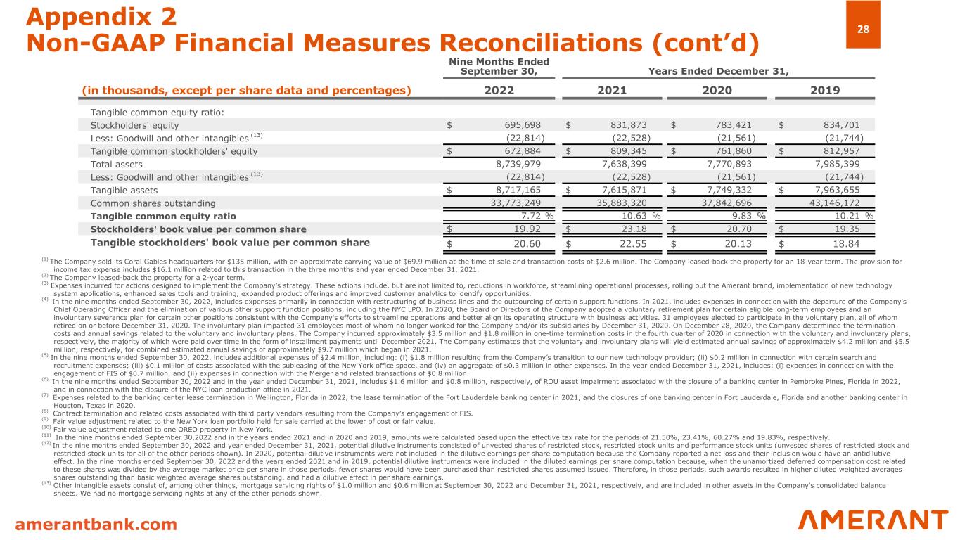 28 amerantbank.com Appendix 2 Non-GAAP Financial Measures Reconciliations (cont’d) Nine Months Ended September 30, Years Ended December 31, (in thousands, except per share data and percentages) 2022 2021 2020 2019 Tangible common equity ratio: Stockholders' equity $ 695,698 $ 831,873 $ 783,421 $ 834,701 Less: Goodwill and other intangibles (13) (22,814) (22,528) (21,561) (21,744) Tangible common stockholders' equity $ 672,884 $ 809,345 $ 761,860 $ 812,957 Total assets 8,739,979 7,638,399 7,770,893 7,985,399 Less: Goodwill and other intangibles (13) (22,814) (22,528) (21,561) (21,744) Tangible assets $ 8,717,165 $ 7,615,871 $ 7,749,332 $ 7,963,655 Common shares outstanding 33,773,249 35,883,320 37,842,696 43,146,172 Tangible common equity ratio 7.72 % 10.63 % 9.83 % 10.21 % Stockholders' book value per common share $ 19.92 $ 23.18 $ 20.70 $ 19.35 Tangible stockholders' book value per common share $ 20.60 $ 22.55 $ 20.13 $ 18.84 (1) The Company sold its Coral Gables headquarters for $135 million, with an approximate carrying value of $69.9 million at the time of sale and transaction costs of $2.6 million. The Company leased-back the property for an 18-year term. The provision for income tax expense includes $16.1 million related to this transaction in the three months and year ended December 31, 2021. (2) The Company leased-back the property for a 2-year term. (3) Expenses incurred for actions designed to implement the Company’s strategy. These actions include, but are not limited to, reductions in workforce, streamlining operational processes, rolling out the Amerant brand, implementation of new technology system applications, enhanced sales tools and training, expanded product offerings and improved customer analytics to identify opportunities. (4) In the nine months ended September 30, 2022, includes expenses primarily in connection with restructuring of business lines and the outsourcing of certain support functions. In 2021, includes expenses in connection with the departure of the Company's Chief Operating Officer and the elimination of various other support function positions, including the NYC LPO. In 2020, the Board of Directors of the Company adopted a voluntary retirement plan for certain eligible long-term employees and an involuntary severance plan for certain other positions consistent with the Company's efforts to streamline operations and better align its operating structure with business activities. 31 employees elected to participate in the voluntary plan, all of whom retired on or before December 31, 2020. The involuntary plan impacted 31 employees most of whom no longer worked for the Company and/or its subsidiaries by December 31, 2020. On December 28, 2020, the Company determined the termination costs and annual savings related to the voluntary and involuntary plans. The Company incurred approximately $3.5 million and $1.8 million in one-time termination costs in the fourth quarter of 2020 in connection with the voluntary and involuntary plans, respectively, the majority of which were paid over time in the form of installment payments until December 2021. The Company estimates that the voluntary and involuntary plans will yield estimated annual savings of approximately $4.2 million and $5.5 million, respectively, for combined estimated annual savings of approximately $9.7 million which began in 2021. (5) In the nine months ended September 30, 2022, includes additional expenses of $2.4 million, including: (i) $1.8 million resulting from the Company’s transition to our new technology provider; (ii) $0.2 million in connection with certain search and recruitment expenses; (iii) $0.1 million of costs associated with the subleasing of the New York office space, and (iv) an aggregate of $0.3 million in other expenses. In the year ended December 31, 2021, includes: (i) expenses in connection with the engagement of FIS of $0.7 million, and (ii) expenses in connection with the Merger and related transactions of $0.8 million. (6) In the nine months ended September 30, 2022 and in the year ended December 31, 2021, includes $1.6 million and $0.8 million, respectively, of ROU asset impairment associated with the closure of a banking center in Pembroke Pines, Florida in 2022, and in connection with the closure of the NYC loan production office in 2021. (7) Expenses related to the banking center lease termination in Wellington, Florida in 2022, the lease termination of the Fort Lauderdale banking center in 2021, and the closures of one banking center in Fort Lauderdale, Florida and another banking center in Houston, Texas in 2020. (8) Contract termination and related costs associated with third party vendors resulting from the Company’s engagement of FIS. (9) Fair value adjustment related to the New York loan portfolio held for sale carried at the lower of cost or fair value. (10) Fair value adjustment related to one OREO property in New York. (11) In the nine months ended September 30,2022 and in the years ended 2021 and in 2020 and 2019, amounts were calculated based upon the effective tax rate for the periods of 21.50%, 23.41%, 60.27% and 19.83%, respectively. (12) In the nine months ended September 30, 2022 and year ended December 31, 2021, potential dilutive instruments consisted of unvested shares of restricted stock, restricted stock units and performance stock units (unvested shares of restricted stock and restricted stock units for all of the other periods shown). In 2020, potential dilutive instruments were not included in the dilutive earnings per share computation because the Company reported a net loss and their inclusion would have an antidilutive effect. In the nine months ended September 30, 2022 and the years ended 2021 and in 2019, potential dilutive instruments were included in the diluted earnings per share computation because, when the unamortized deferred compensation cost related to these shares was divided by the average market price per share in those