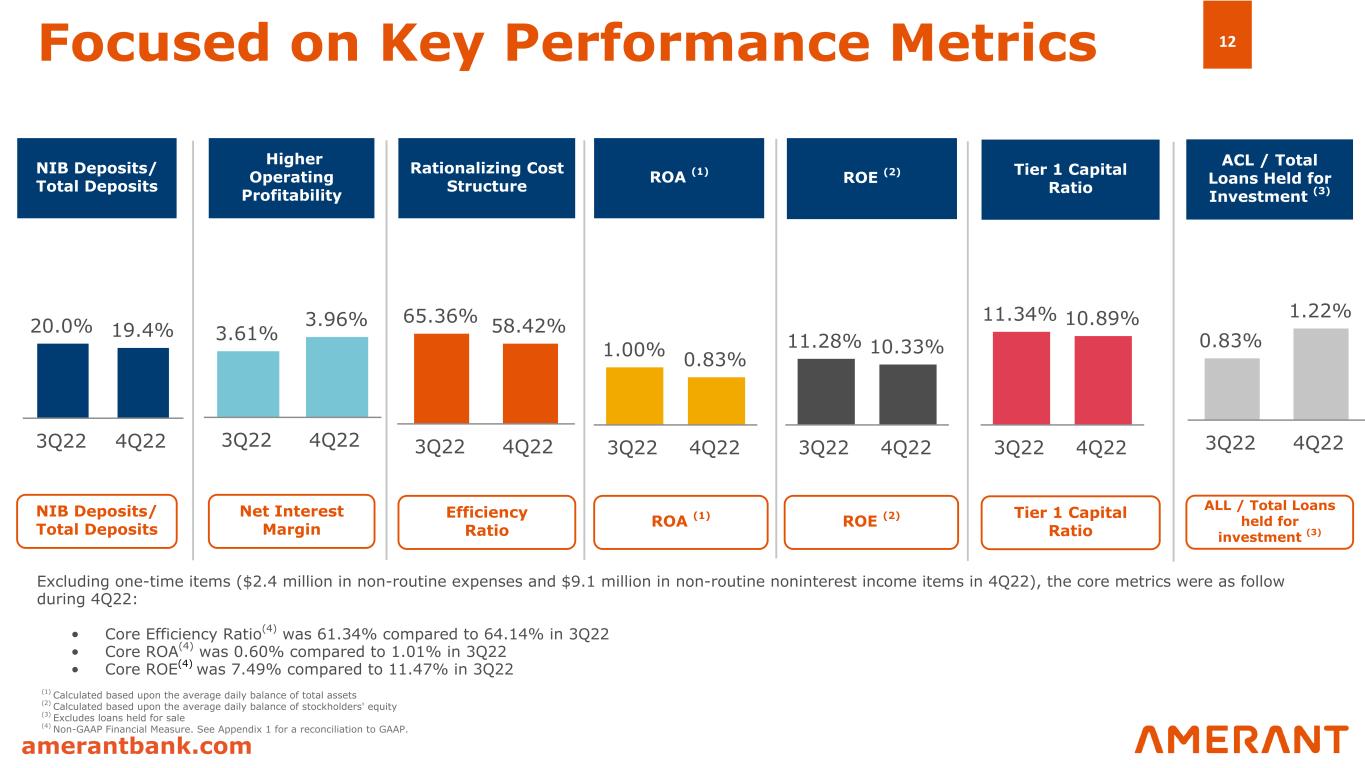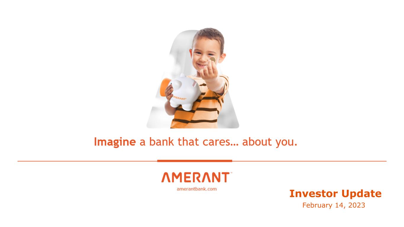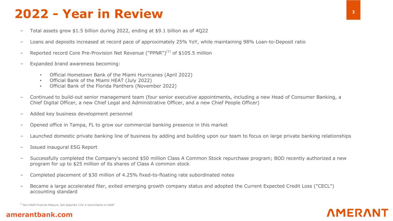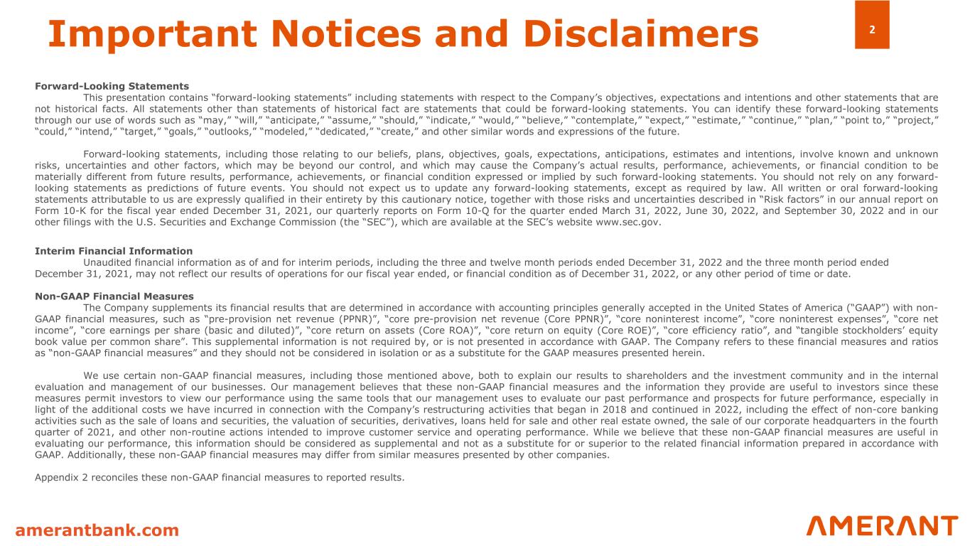 2 amerantbank.com Important Notices and Disclaimers Forward-Looking Statements This presentation contains “forward-looking statements” including statements with respect to the Company’s objectives, expectations and intentions and other statements that are not historical facts. All statements other than statements of historical fact are statements that could be forward-looking statements. You can identify these forward-looking statements through our use of words such as “may,” “will,” “anticipate,” “assume,” “should,” “indicate,” “would,” “believe,” “contemplate,” “expect,” “estimate,” “continue,” “plan,” “point to,” “project,” “could,” “intend,” “target,” “goals,” “outlooks,” “modeled,” “dedicated,” “create,” and other similar words and expressions of the future. Forward-looking statements, including those relating to our beliefs, plans, objectives, goals, expectations, anticipations, estimates and intentions, involve known and unknown risks, uncertainties and other factors, which may be beyond our control, and which may cause the Company’s actual results, performance, achievements, or financial condition to be materially different from future results, performance, achievements, or financial condition expressed or implied by such forward-looking statements. You should not rely on any forward- looking statements as predictions of future events. You should not expect us to update any forward-looking statements, except as required by law. All written or oral forward-looking statements attributable to us are expressly qualified in their entirety by this cautionary notice, together with those risks and uncertainties described in “Risk factors” in our annual report on Form 10-K for the fiscal year ended December 31, 2021, our quarterly reports on Form 10-Q for the quarter ended March 31, 2022, June 30, 2022, and September 30, 2022 and in our other filings with the U.S. Securities and Exchange Commission (the “SEC”), which are available at the SEC’s website www.sec.gov. Interim Financial Information Unaudited financial information as of and for interim periods, including the three and twelve month periods ended December 31, 2022 and the three month period ended December 31, 2021, may not reflect our results of operations for our fiscal year ended, or financial condition as of December 31, 2022, or any other period of time or date. Non-GAAP Financial Measures The Company supplements its financial results that are determined in accordance with accounting principles generally accepted in the United States of America (“GAAP”) with non- GAAP financial measures, such as “pre-provision net revenue (PPNR)”, “core pre-provision net revenue (Core PPNR)”, “core noninterest income”, “core noninterest expenses”, “core net income”, “core earnings per share (basic and diluted)”, “core return on assets (Core ROA)”, “core return on equity (Core ROE)”, “core efficiency ratio”, and “tangible stockholders’ equity book value per common share”. This supplemental information is not required by, or is not presented in accordance with GAAP. The Company refers to these financial measures and ratios as “non-GAAP financial measures” and they should not be considered in isolation or as a substitute for the GAAP measures presented herein. We use certain non-GAAP financial measures, including those mentioned above, both to explain our results to shareholders and the investment community and in the internal evaluation and management of our businesses. Our management believes that these non-GAAP financial measures and the information they provide are useful to investors since these measures permit investors to view our performance using the same tools that our management uses to evaluate our past performance and prospects for future performance, especially in light of the additional costs we have incurred in connection with the Company’s restructuring activities that began in 2018 and continued in 2022, including the effect of non-core banking activities such as the sale of loans and securities, the valuation of securities, derivatives, loans held for sale and other real estate owned, the sale of our corporate headquarters in the fourth quarter of 2021, and other non-routine actions intended to improve customer service and operating performance. While we believe that these non-GAAP financial measures are useful in evaluating our performance, this information should be considered as supplemental and not as a substitute for or superior to the related financial information prepared in accordance with GAAP. Additionally, these non-GAAP financial measures may differ from similar measures presented by other companies. Appendix 2 reconciles these non-GAAP financial measures to reported results.