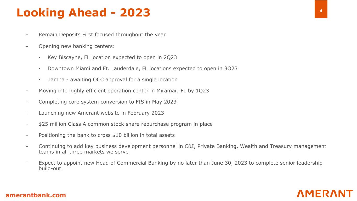 3 amerantbank.com 2022 - Year in Review – Total assets grew $1.5 billion during 2022, ending at $9.1 billion as of 4Q22 – Loans and deposits increased at record pace of approximately 25% YoY, while maintaining 98% Loan-to-Deposit ratio – Reported record Core Pre-Provision Net Revenue ("PPNR")(1) of $105.5 million – Expanded brand awareness becoming: ▪ Official Hometown Bank of the Miami Hurricanes (April 2022) ▪ Official Bank of the Miami HEAT (July 2022) ▪ Official Bank of the Florida Panthers (November 2022) – Continued to build-out senior management team (four senior executive appointments, including a new Head of Consumer Banking, a Chief Digital Officer, a new Chief Legal and Administrative Officer, and a new Chief People Officer) – Added key business development personnel – Opened office in Tampa, FL to grow our commercial banking presence in this market – Launched domestic private banking line of business by adding and building upon our team to focus on large private banking relationships – Issued inaugural ESG Report – Successfully completed the Company's second $50 million Class A Common Stock repurchase program; BOD recently authorized a new program for up to $25 million of its shares of Class A common stock – Completed placement of $30 million of 4.25% fixed-to-floating rate subordinated notes – Became a large accelerated filer, exited emerging growth company status and adopted the Current Expected Credit Loss ("CECL") accounting standard (1) Non-GAAP Financial Measure. See Appendix 2 for a reconciliation to GAAP