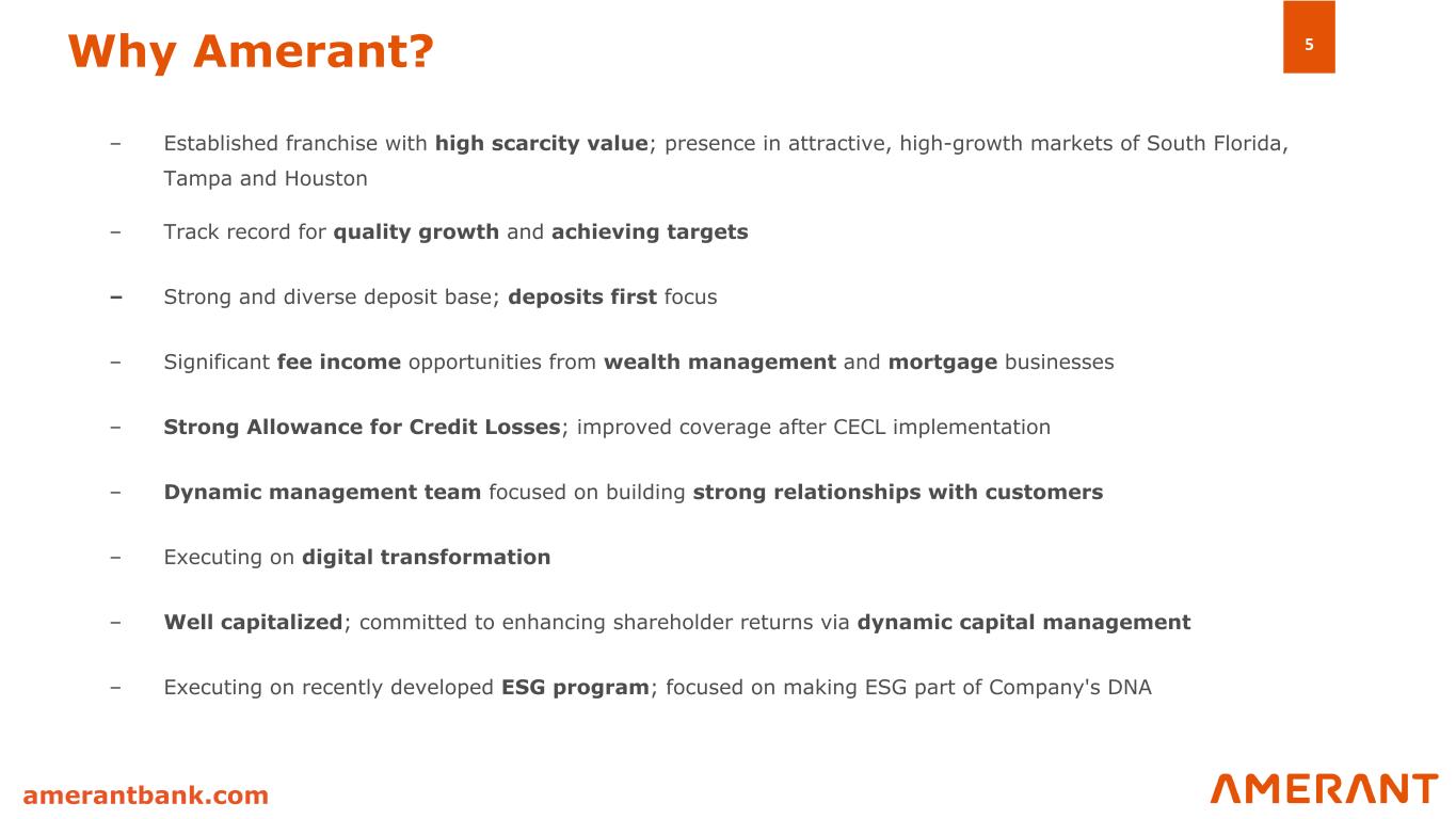 4 amerantbank.com Looking Ahead - 2023 – Remain Deposits First focused throughout the year – Opening new banking centers: ▪ Key Biscayne, FL location expected to open in 2Q23 ▪ Downtown Miami and Ft. Lauderdale, FL locations expected to open in 3Q23 ▪ Tampa - awaiting OCC approval for a single location – Moving into highly efficient operation center in Miramar, FL by 1Q23 – Completing core system conversion to FIS in May 2023 – Launching new Amerant website in February 2023 – $25 million Class A common stock share repurchase program in place – Positioning the bank to cross $10 billion in total assets – Continuing to add key business development personnel in C&I, Private Banking, Wealth and Treasury management teams in all three markets we serve – Expect to appoint new Head of Commercial Banking by no later than June 30, 2023 to complete senior leadership build-out
