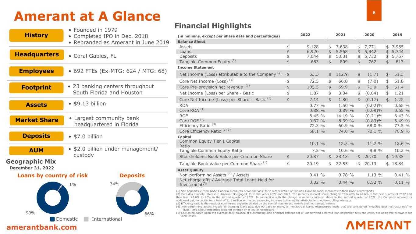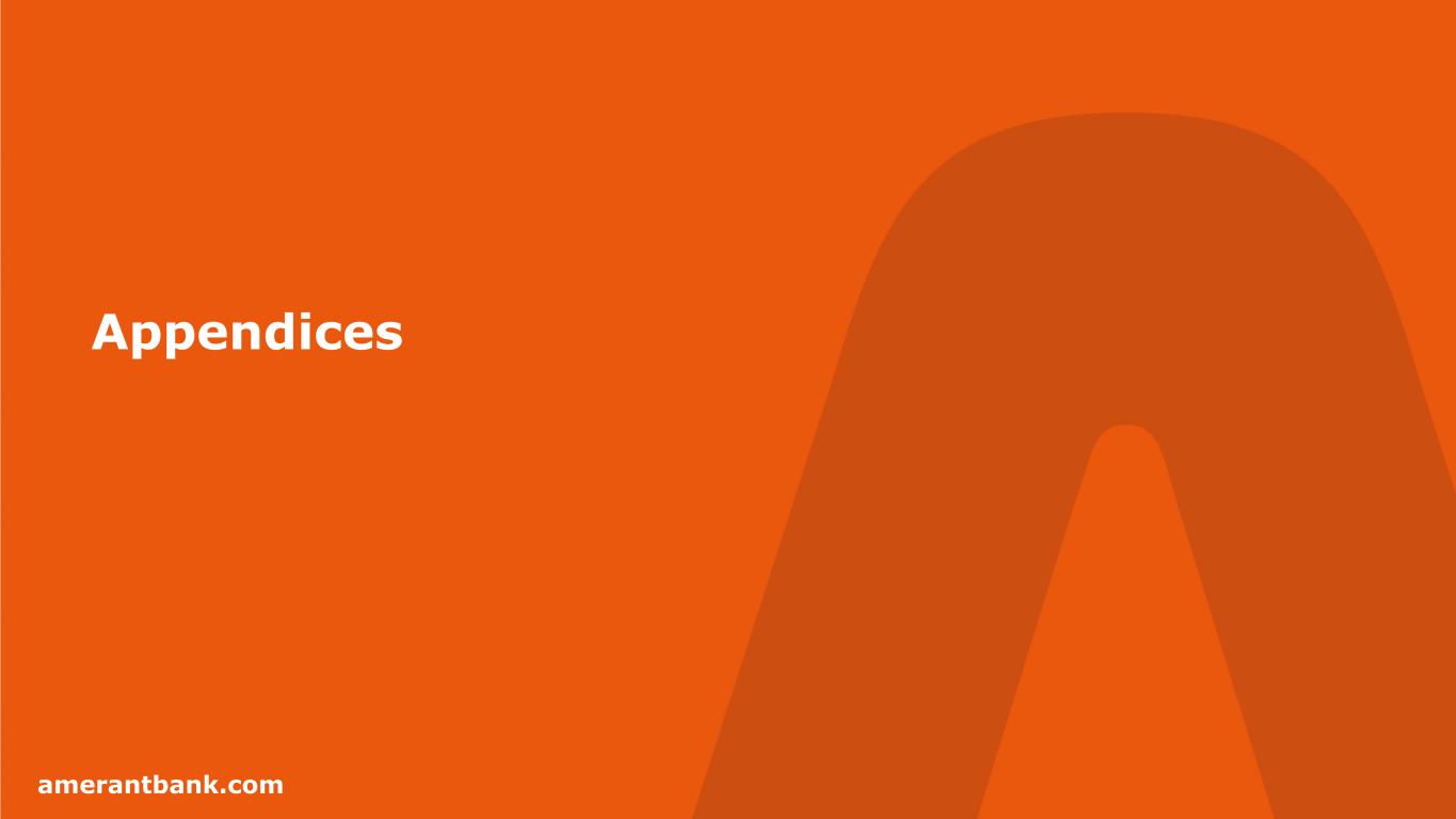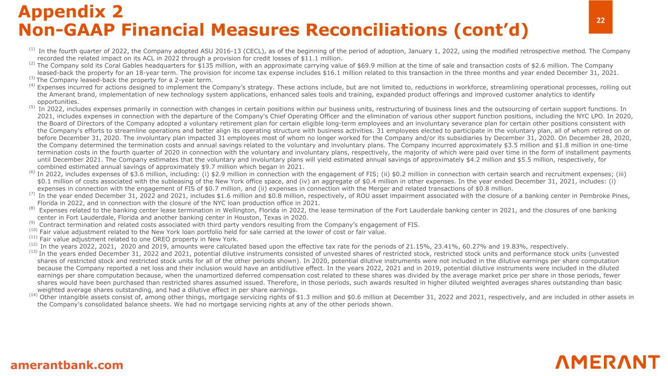 22 amerantbank.com Appendix 2 Non-GAAP Financial Measures Reconciliations (cont’d) (1) In the fourth quarter of 2022, the Company adopted ASU 2016-13 (CECL), as of the beginning of the period of adoption, January 1, 2022, using the modified retrospective method. The Company recorded the related impact on its ACL in 2022 through a provision for credit losses of $11.1 million. (2) The Company sold its Coral Gables headquarters for $135 million, with an approximate carrying value of $69.9 million at the time of sale and transaction costs of $2.6 million. The Company leased-back the property for an 18-year term. The provision for income tax expense includes $16.1 million related to this transaction in the three months and year ended December 31, 2021. (3) The Company leased-back the property for a 2-year term. (4) Expenses incurred for actions designed to implement the Company’s strategy. These actions include, but are not limited to, reductions in workforce, streamlining operational processes, rolling out the Amerant brand, implementation of new technology system applications, enhanced sales tools and training, expanded product offerings and improved customer analytics to identify opportunities. (5) In 2022, includes expenses primarily in connection with changes in certain positions within our business units, restructuring of business lines and the outsourcing of certain support functions. In 2021, includes expenses in connection with the departure of the Company's Chief Operating Officer and the elimination of various other support function positions, including the NYC LPO. In 2020, the Board of Directors of the Company adopted a voluntary retirement plan for certain eligible long-term employees and an involuntary severance plan for certain other positions consistent with the Company's efforts to streamline operations and better align its operating structure with business activities. 31 employees elected to participate in the voluntary plan, all of whom retired on or before December 31, 2020. The involuntary plan impacted 31 employees most of whom no longer worked for the Company and/or its subsidiaries by December 31, 2020. On December 28, 2020, the Company determined the termination costs and annual savings related to the voluntary and involuntary plans. The Company incurred approximately $3.5 million and $1.8 million in one-time termination costs in the fourth quarter of 2020 in connection with the voluntary and involuntary plans, respectively, the majority of which were paid over time in the form of installment payments until December 2021. The Company estimates that the voluntary and involuntary plans will yield estimated annual savings of approximately $4.2 million and $5.5 million, respectively, for combined estimated annual savings of approximately $9.7 million which began in 2021. (6) In 2022, includes expenses of $3.6 million, including: (i) $2.9 million in connection with the engagement of FIS; (ii) $0.2 million in connection with certain search and recruitment expenses; (iii) $0.1 million of costs associated with the subleasing of the New York office space, and (iv) an aggregate of $0.4 million in other expenses. In the year ended December 31, 2021, includes: (i) expenses in connection with the engagement of FIS of $0.7 million, and (ii) expenses in connection with the Merger and related transactions of $0.8 million. (7) In the year ended December 31, 2022 and 2021, includes $1.6 million and $0.8 million, respectively, of ROU asset impairment associated with the closure of a banking center in Pembroke Pines, Florida in 2022, and in connection with the closure of the NYC loan production office in 2021. (8) Expenses related to the banking center lease termination in Wellington, Florida in 2022, the lease termination of the Fort Lauderdale banking center in 2021, and the closures of one banking center in Fort Lauderdale, Florida and another banking center in Houston, Texas in 2020. (9) Contract termination and related costs associated with third party vendors resulting from the Company’s engagement of FIS. (10) Fair value adjustment related to the New York loan portfolio held for sale carried at the lower of cost or fair value. (11) Fair value adjustment related to one OREO property in New York. (12) In the years 2022, 2021, 2020 and 2019, amounts were calculated based upon the effective tax rate for the periods of 21.15%, 23.41%, 60.27% and 19.83%, respectively. (13) In the years ended December 31, 2022 and 2021, potential dilutive instruments consisted of unvested shares of restricted stock, restricted stock units and performance stock units (unvested shares of restricted stock and restricted stock units for all of the other periods shown). In 2020, potential dilutive instruments were not included in the dilutive earnings per share computation because the Company reported a net loss and their inclusion would have an antidilutive effect. In the years 2022, 2021 and in 2019, potential dilutive instruments were included in the diluted earnings per share computation because, when the unamortized deferred compensation cost related to these shares was divided by the average market price per share in those periods, fewer shares would have been purchased than restricted shares assumed issued. Therefore, in those periods, such awards resulted in higher diluted weighted averages shares outstanding than basic weighted average shares outstanding, and had a dilutive effect in per share earnings. (14) Other intangible assets consist of, among other things, mortgage servicing rights of $1.3 million and $0.6 million at December 31, 2022 and 2021, respectively, and are included in other assets in the Company's consolidated balance sheets. We had no mortgage servicing rights at any of the other periods shown.