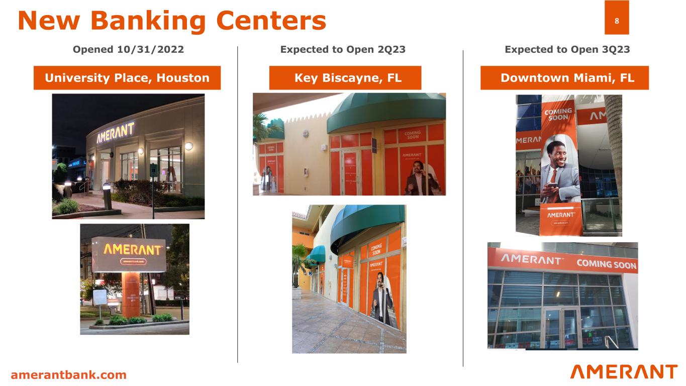 7 amerantbank.com 4.0% 6.0% 3.2% Miami Houston U.S. Te xa s 10.7% 18.7% 6.8% Miami Houston U.S. June 30, 2022 Growing and Attractive Markets (1) The Company closed its Wellington banking center on October 15, 2021 and its Pembroke Pines banking center on October 17, 2022 (2) Deposit Market Share data as of June 30, 2022. (3) Includes brokered deposits of $365.8 million as of June 30, 2022 (4) Includes the Katy, TX banking center. The city of Katy is in Harris, Fort Bend, and Waller Counties and the new facility serves nearby areas of these counties (5) Our Sugar Land, TX banking center also serves Fort Bend County and our Katy, TX banking center lies adjacent to this market (6) Community banks include those with less than $10 billion in assets Sources: Deposit data from FDIC as of June 30, 2022 (Bank-level). Market demographics, and county data and market share from S&P Global. Market Intelligence as of June 30, 2022 Amerant is the largest community bank in the Miami-Dade MSA (6) Deposit Market Share (2) Market Demographics Market Deposits ($mm) % of AMTB Market Share % Miami-Dade, FL (3) 5,195 82.8 2.6 Broward, FL $367 5.8 0.5 Palm Beach, FL $105 1.7 0.1 Florida $ 5,666 90.3 % 3.2 % Market Deposits ($mm) % of AMTB Market Share % Harris, TX (4)(5) 608 9.7 0.6 Texas $ 608 9.7 % 0.6% Banking Center Footprint (1) Fl or id a 2012 – 2022 Population Change 2022 – 2027 Est. Population Change7 banking centers 16 banking centers December 31, 2022