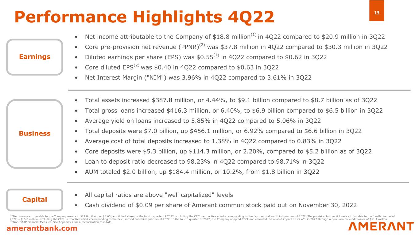 12 amerantbank.com 65.36% 58.42% 3Q22 4Q22 20.0% 19.4% 3Q22 4Q22 11.34% 10.89% 3Q22 4Q22 3.61% 3.96% 3Q22 4Q22 Focused on Key Performance Metrics NIB Deposits/ Total Deposits Tier 1 Capital Ratio Higher Operating Profitability Rationalizing Cost Structure (1) Calculated based upon the average daily balance of total assets (2) Calculated based upon the average daily balance of stockholders' equity (3) Excludes loans held for sale (4) Non-GAAP Financial Measure. See Appendix 1 for a reconciliation to GAAP. 0.83% 1.22% 3Q22 4Q22 ACL / Total Loans Held for Investment (3) 1.00% 0.83% 3Q22 4Q22 ROA (1) 11.28% 10.33% 3Q22 4Q22 NIB Deposits/ Total Deposits Tier 1 Capital Ratio Net Interest Margin Efficiency Ratio ALL / Total Loans held for investment (3) ROA (1) ROE (2) Excluding one-time items ($2.4 million in non-routine expenses and $9.1 million in non-routine noninterest income items in 4Q22), the core metrics were as follow during 4Q22: • Core Efficiency Ratio(4) was 61.34% compared to 64.14% in 3Q22 • Core ROA(4) was 0.60% compared to 1.01% in 3Q22 • Core ROE(4) was 7.49% compared to 11.47% in 3Q22 ROE (2)