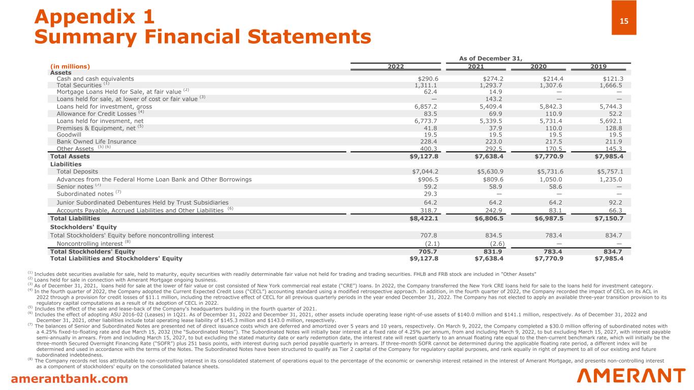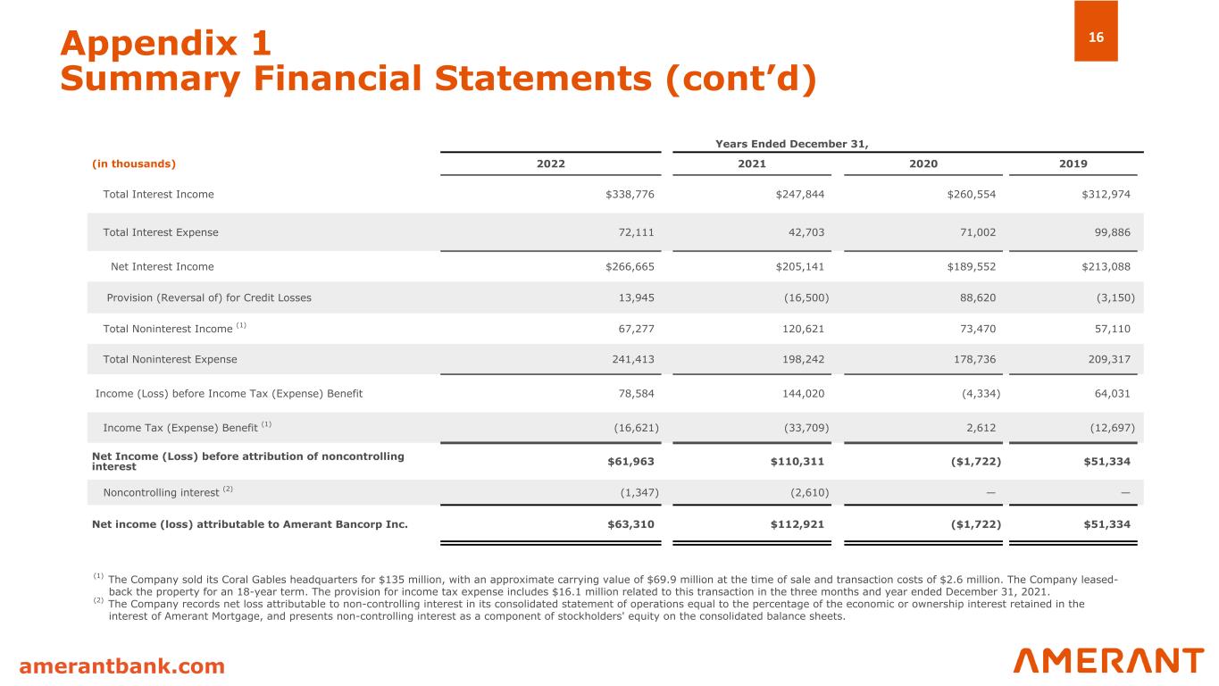 15 amerantbank.com Appendix 1 Summary Financial Statements (1) Includes debt securities available for sale, held to maturity, equity securities with readily determinable fair value not held for trading and trading securities. FHLB and FRB stock are included in "Other Assets" (2) Loans held for sale in connection with Amerant Mortgage ongoing business. (3) As of December 31, 2021, loans held for sale at the lower of fair value or cost consisted of New York commercial real estate (“CRE”) loans. In 2022, the Company transferred the New York CRE loans held for sale to the loans held for investment category. (4) In the fourth quarter of 2022, the Company adopted the Current Expected Credit Loss (“CECL”) accounting standard using a modified retrospective approach. In addition, in the fourth quarter of 2022, the Company recorded the impact of CECL on its ACL in 2022 through a provision for credit losses of $11.1 million, including the retroactive effect of CECL for all previous quarterly periods in the year ended December 31, 2022. The Company has not elected to apply an available three-year transition provision to its regulatory capital computations as a result of its adoption of CECL in 2022. (5) Includes the effect of the sale and lease-back of the Company's headquarters building in the fourth quarter of 2021. (6) Includes the effect of adopting ASU 2016-02 (Leases) in 1Q21. As of December 31, 2022 and December 31, 2021, other assets include operating lease right-of-use assets of $140.0 million and $141.1 million, respectively. As of December 31, 2022 and December 31, 2021, other liabilities include total operating lease liability of $145.3 million and $143.0 million, respectively. (7) The balances of Senior and Subordinated Notes are presented net of direct issuance costs which are deferred and amortized over 5 years and 10 years, respectively. On March 9, 2022, the Company completed a $30.0 million offering of subordinated notes with a 4.25% fixed-to-floating rate and due March 15, 2032 (the “Subordinated Notes”). The Subordinated Notes will initially bear interest at a fixed rate of 4.25% per annum, from and including March 9, 2022, to but excluding March 15, 2027, with interest payable semi-annually in arrears. From and including March 15, 2027, to but excluding the stated maturity date or early redemption date, the interest rate will reset quarterly to an annual floating rate equal to the then-current benchmark rate, which will initially be the three-month Secured Overnight Financing Rate (“SOFR”) plus 251 basis points, with interest during such period payable quarterly in arrears. If three-month SOFR cannot be determined during the applicable floating rate period, a different index will be determined and used in accordance with the terms of the Notes. The Subordinated Notes have been structured to qualify as Tier 2 capital of the Company for regulatory capital purposes, and rank equally in right of payment to all of our existing and future subordinated indebtedness. (8) The Company records net loss attributable to non-controlling interest in its consolidated statement of operations equal to the percentage of the economic or ownership interest retained in the interest of Amerant Mortgage, and presents non-controlling interest as a component of stockholders' equity on the consolidated balance sheets. As of December 31, (in millions) 2022 2021 2020 2019 Assets Cash and cash equivalents $290.6 $274.2 $214.4 $121.3 Total Securities (1) 1,311.1 1,293.7 1,307.6 1,666.5 Mortgage Loans Held for Sale, at fair value (2) 62.4 14.9 — — Loans held for sale, at lower of cost or fair value (3) — 143.2 — — Loans held for investment, gross 6,857.2 5,409.4 5,842.3 5,744.3 Allowance for Credit Losses (4) 83.5 69.9 110.9 52.2 Loans held for invesment, net 6,773.7 5,339.5 5,731.4 5,692.1 Premises & Equipment, net (5) 41.8 37.9 110.0 128.8 Goodwill 19.5 19.5 19.5 19.5 Bank Owned Life Insurance 228.4 223.0 217.5 211.9 Other Assets (5) (6) 400.3 292.5 170.5 145.3 Total Assets $9,127.8 $7,638.4 $7,770.9 $7,985.4 Liabilities Total Deposits $7,044.2 $5,630.9 $5,731.6 $5,757.1 Advances from the Federal Home Loan Bank and Other Borrowings $906.5 $809.6 1,050.0 1,235.0 Senior notes (7) 59.2 58.9 58.6 — Subordinated notes (7) 29.3 — — — Junior Subordinated Debentures Held by Trust Subsidiaries 64.2 64.2 64.2 92.2 Accounts Payable, Accrued Liabilities and Other Liabilities (6) 318.7 242.9 83.1 66.3 Total Liabilities $8,422.1 $6,806.5 $6,987.5 $7,150.7 Stockholders' Equity Total Stockholders' Equity before noncontrolling interest 707.8 834.5 783.4 834.7 Noncontrolling interest (8) (2.1) (2.6) — — Total Stockholders' Equity 705.7 831.9 783.4 834.7 Total Liabilities and Stockholders' Equity $9,127.8 $7,638.4 $7,770.9 $7,985.4