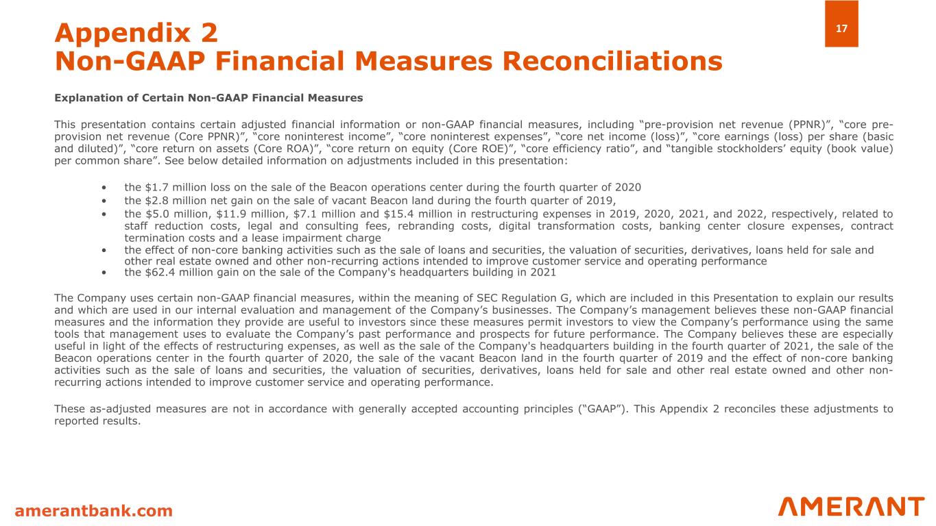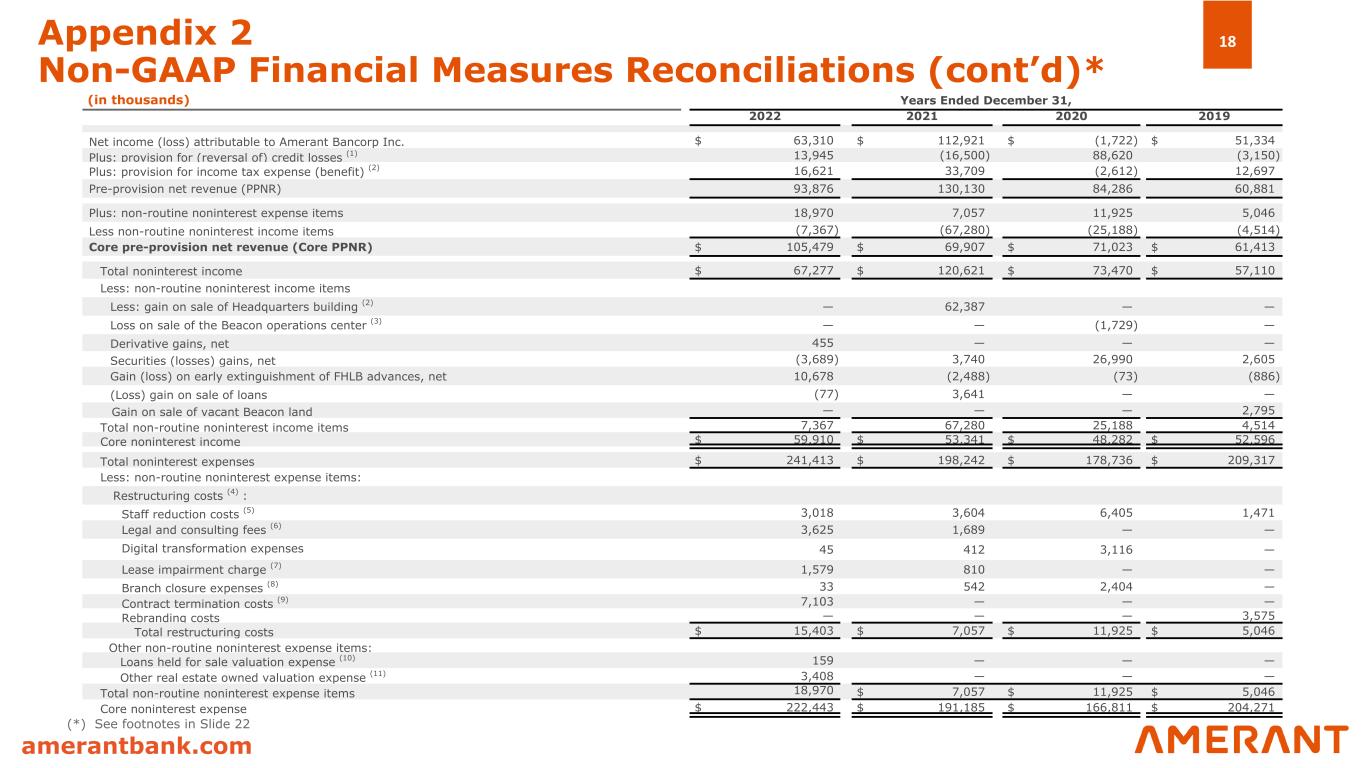 17 amerantbank.com Explanation of Certain Non-GAAP Financial Measures This presentation contains certain adjusted financial information or non-GAAP financial measures, including “pre-provision net revenue (PPNR)”, “core pre- provision net revenue (Core PPNR)”, “core noninterest income”, “core noninterest expenses”, “core net income (loss)”, “core earnings (loss) per share (basic and diluted)”, “core return on assets (Core ROA)”, “core return on equity (Core ROE)”, “core efficiency ratio”, and “tangible stockholders’ equity (book value) per common share”. See below detailed information on adjustments included in this presentation: • the $1.7 million loss on the sale of the Beacon operations center during the fourth quarter of 2020 • the $2.8 million net gain on the sale of vacant Beacon land during the fourth quarter of 2019, • the $5.0 million, $11.9 million, $7.1 million and $15.4 million in restructuring expenses in 2019, 2020, 2021, and 2022, respectively, related to staff reduction costs, legal and consulting fees, rebranding costs, digital transformation costs, banking center closure expenses, contract termination costs and a lease impairment charge • the effect of non-core banking activities such as the sale of loans and securities, the valuation of securities, derivatives, loans held for sale and other real estate owned and other non-recurring actions intended to improve customer service and operating performance • the $62.4 million gain on the sale of the Company's headquarters building in 2021 The Company uses certain non-GAAP financial measures, within the meaning of SEC Regulation G, which are included in this Presentation to explain our results and which are used in our internal evaluation and management of the Company’s businesses. The Company’s management believes these non-GAAP financial measures and the information they provide are useful to investors since these measures permit investors to view the Company’s performance using the same tools that management uses to evaluate the Company’s past performance and prospects for future performance. The Company believes these are especially useful in light of the effects of restructuring expenses, as well as the sale of the Company's headquarters building in the fourth quarter of 2021, the sale of the Beacon operations center in the fourth quarter of 2020, the sale of the vacant Beacon land in the fourth quarter of 2019 and the effect of non-core banking activities such as the sale of loans and securities, the valuation of securities, derivatives, loans held for sale and other real estate owned and other non- recurring actions intended to improve customer service and operating performance. These as-adjusted measures are not in accordance with generally accepted accounting principles (“GAAP”). This Appendix 2 reconciles these adjustments to reported results. Appendix 2 Non-GAAP Financial Measures Reconciliations