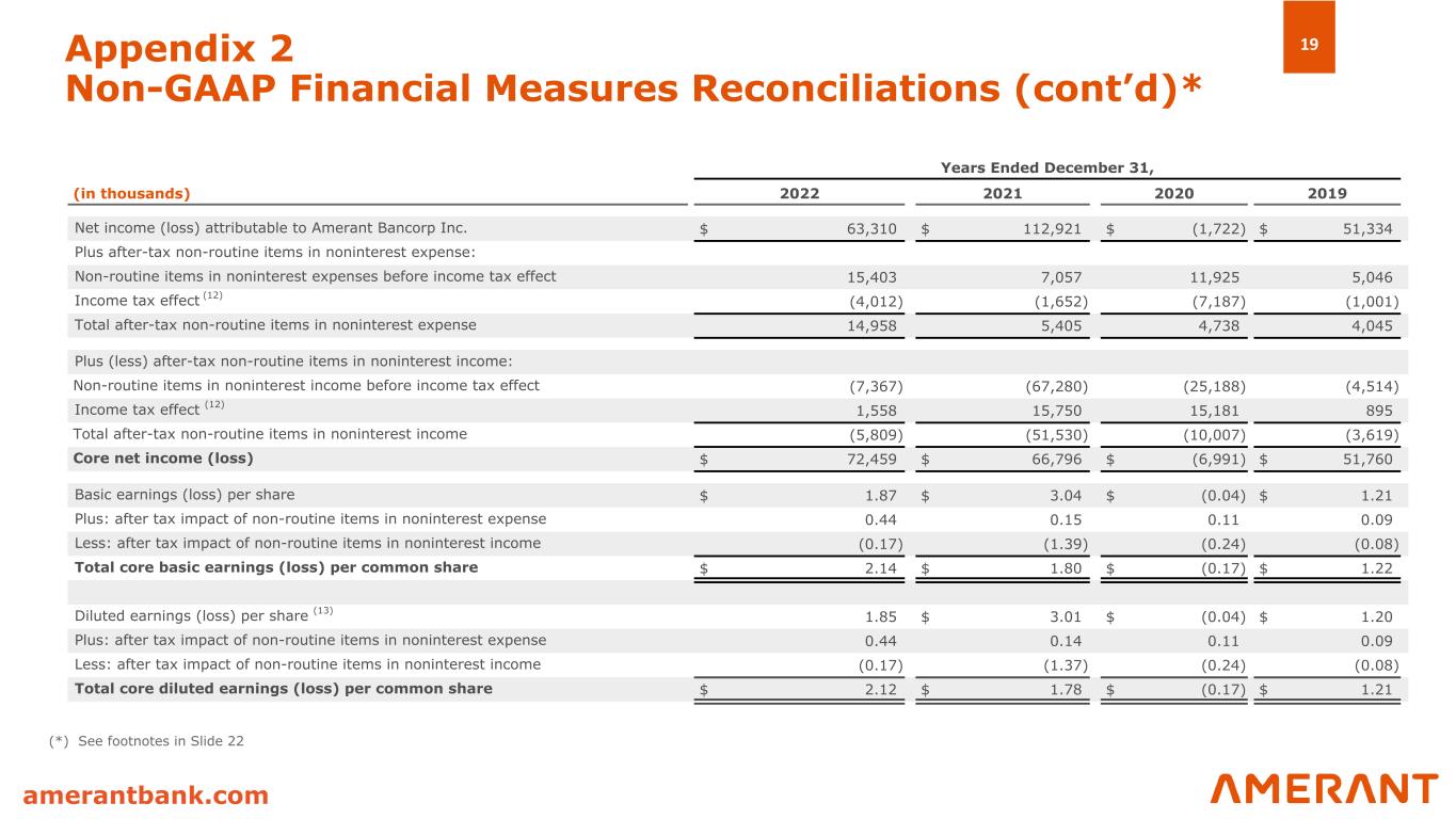 18 amerantbank.com (in thousands) Years Ended December 31, 2022 2021 2020 2019 Net income (loss) attributable to Amerant Bancorp Inc. $ 63,310 $ 112,921 $ (1,722) $ 51,334 Plus: provision for (reversal of) credit losses (1) 13,945 (16,500) 88,620 (3,150) Plus: provision for income tax expense (benefit) (2) 16,621 33,709 (2,612) 12,697 Pre-provision net revenue (PPNR) 93,876 130,130 84,286 60,881 Plus: non-routine noninterest expense items 18,970 7,057 11,925 5,046 Less non-routine noninterest income items (7,367) (67,280) (25,188) (4,514) Core pre-provision net revenue (Core PPNR) $ 105,479 $ 69,907 $ 71,023 $ 61,413 Total noninterest income $ 67,277 $ 120,621 $ 73,470 $ 57,110 Less: non-routine noninterest income items Less: gain on sale of Headquarters building (2) — 62,387 — — Loss on sale of the Beacon operations center (3) — — (1,729) — Derivative gains, net 455 — — — Securities (losses) gains, net (3,689) 3,740 26,990 2,605 Gain (loss) on early extinguishment of FHLB advances, net 10,678 (2,488) (73) (886) (Loss) gain on sale of loans (77) 3,641 — — Gain on sale of vacant Beacon land — — — 2,795 Total non-routine noninterest income items 7,367 67,280 25,188 4,514 Core noninterest income $ 59,910 $ 53,341 $ 48,282 $ 52,596 Total noninterest expenses $ 241,413 $ 198,242 $ 178,736 $ 209,317 Less: non-routine noninterest expense items: Restructuring costs (4) : Staff reduction costs (5) 3,018 3,604 6,405 1,471 Legal and consulting fees (6) 3,625 1,689 — — Digital transformation expenses 45 412 3,116 — Lease impairment charge (7) 1,579 810 — — Branch closure expenses (8) 33 542 2,404 — Contract termination costs (9) 7,103 — — — Rebranding costs — — — 3,575 Total restructuring costs $ 15,403 $ 7,057 $ 11,925 $ 5,046 Other non-routine noninterest expense items: Loans held for sale valuation expense (10) 159 — — — Other real estate owned valuation expense (11) 3,408 — — — Total non-routine noninterest expense items 18,970 $ 7,057 $ 11,925 $ 5,046 Core noninterest expense $ 222,443 $ 191,185 $ 166,811 $ 204,271 Appendix 2 Non-GAAP Financial Measures Reconciliations (cont’d)* (*) See footnotes in Slide 22