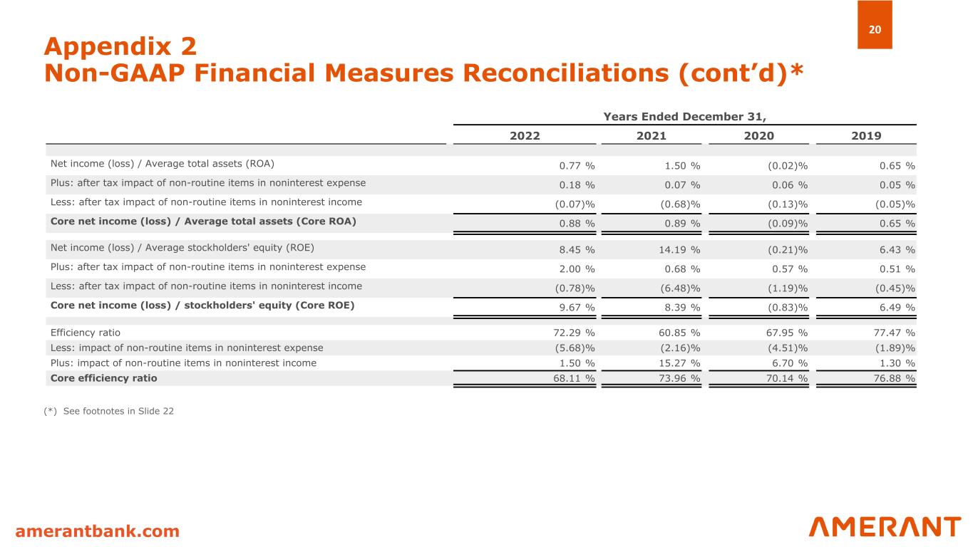 19 amerantbank.com Years Ended December 31, (in thousands) 2022 2021 2020 2019 Net income (loss) attributable to Amerant Bancorp Inc. $ 63,310 $ 112,921 $ (1,722) $ 51,334 Plus after-tax non-routine items in noninterest expense: Non-routine items in noninterest expenses before income tax effect 15,403 7,057 11,925 5,046 Income tax effect (12) (4,012) (1,652) (7,187) (1,001) Total after-tax non-routine items in noninterest expense 14,958 5,405 4,738 4,045 Plus (less) after-tax non-routine items in noninterest income: Non-routine items in noninterest income before income tax effect (7,367) (67,280) (25,188) (4,514) Income tax effect (12) 1,558 15,750 15,181 895 Total after-tax non-routine items in noninterest income (5,809) (51,530) (10,007) (3,619) Core net income (loss) $ 72,459 $ 66,796 $ (6,991) $ 51,760 Basic earnings (loss) per share $ 1.87 $ 3.04 $ (0.04) $ 1.21 Plus: after tax impact of non-routine items in noninterest expense 0.44 0.15 0.11 0.09 Less: after tax impact of non-routine items in noninterest income (0.17) (1.39) (0.24) (0.08) Total core basic earnings (loss) per common share $ 2.14 $ 1.80 $ (0.17) $ 1.22 Diluted earnings (loss) per share (13) 1.85 $ 3.01 $ (0.04) $ 1.20 Plus: after tax impact of non-routine items in noninterest expense 0.44 0.14 0.11 0.09 Less: after tax impact of non-routine items in noninterest income (0.17) (1.37) (0.24) (0.08) Total core diluted earnings (loss) per common share $ 2.12 $ 1.78 $ (0.17) $ 1.21 Appendix 2 Non-GAAP Financial Measures Reconciliations (cont’d)* (*) See footnotes in Slide 22