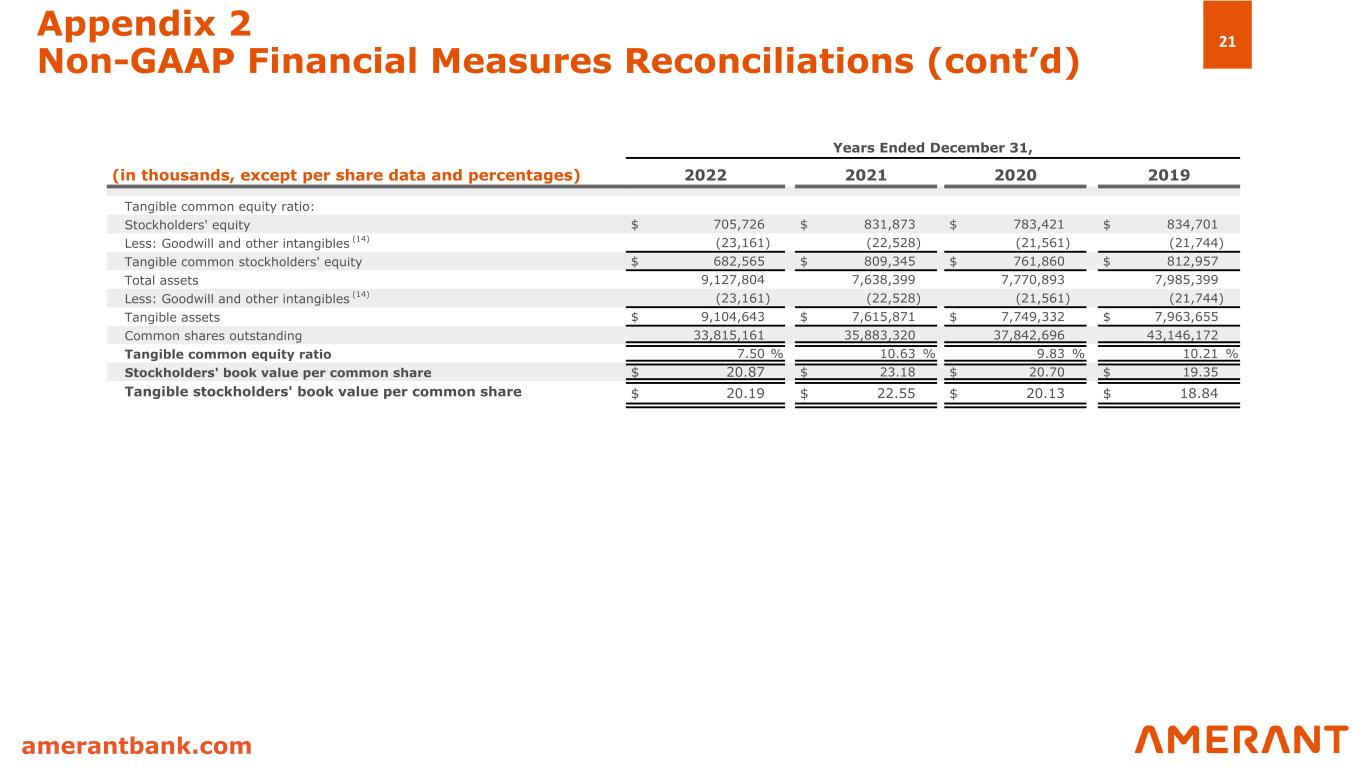 21 amerantbank.com Appendix 2 Non-GAAP Financial Measures Reconciliations (cont’d) Years Ended December 31, (in thousands, except per share data and percentages) 2022 2021 2020 2019 Tangible common equity ratio: Stockholders' equity $ 705,726 $ 831,873 $ 783,421 $ 834,701 Less: Goodwill and other intangibles (14) (23,161) (22,528) (21,561) (21,744) Tangible common stockholders' equity $ 682,565 $ 809,345 $ 761,860 $ 812,957 Total assets 9,127,804 7,638,399 7,770,893 7,985,399 Less: Goodwill and other intangibles (14) (23,161) (22,528) (21,561) (21,744) Tangible assets $ 9,104,643 $ 7,615,871 $ 7,749,332 $ 7,963,655 Common shares outstanding 33,815,161 35,883,320 37,842,696 43,146,172 Tangible common equity ratio 7.50 % 10.63 % 9.83 % 10.21 % Stockholders' book value per common share $ 20.87 $ 23.18 $ 20.70 $ 19.35 Tangible stockholders' book value per common share $ 20.19 $ 22.55 $ 20.13 $ 18.84