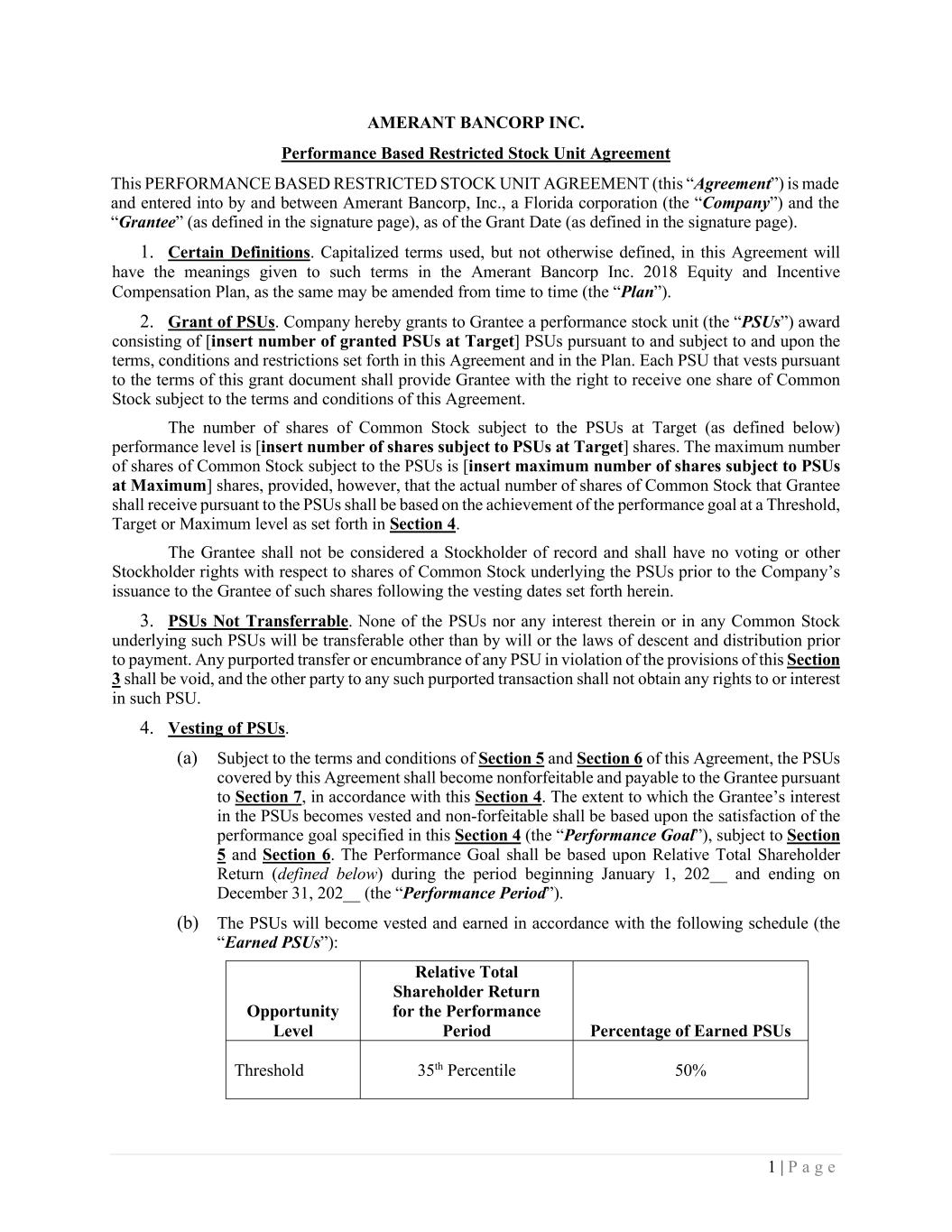 1 | P a g e AMERANT BANCORP INC. Performance Based Restricted Stock Unit Agreement This PERFORMANCE BASED RESTRICTED STOCK UNIT AGREEMENT (this “Agreement”) is made and entered into by and between Amerant Bancorp, Inc., a Florida corporation (the “Company”) and the “Grantee” (as defined in the signature page), as of the Grant Date (as defined in the signature page). 1. Certain Definitions. Capitalized terms used, but not otherwise defined, in this Agreement will have the meanings given to such terms in the Amerant Bancorp Inc. 2018 Equity and Incentive Compensation Plan, as the same may be amended from time to time (the “Plan”). 2. Grant of PSUs. Company hereby grants to Grantee a performance stock unit (the “PSUs”) award consisting of [insert number of granted PSUs at Target] PSUs pursuant to and subject to and upon the terms, conditions and restrictions set forth in this Agreement and in the Plan. Each PSU that vests pursuant to the terms of this grant document shall provide Grantee with the right to receive one share of Common Stock subject to the terms and conditions of this Agreement. The number of shares of Common Stock subject to the PSUs at Target (as defined below) performance level is [insert number of shares subject to PSUs at Target] shares. The maximum number of shares of Common Stock subject to the PSUs is [insert maximum number of shares subject to PSUs at Maximum] shares, provided, however, that the actual number of shares of Common Stock that Grantee shall receive pursuant to the PSUs shall be based on the achievement of the performance goal at a Threshold, Target or Maximum level as set forth in Section 4. The Grantee shall not be considered a Stockholder of record and shall have no voting or other Stockholder rights with respect to shares of Common Stock underlying the PSUs prior to the Company’s issuance to the Grantee of such shares following the vesting dates set forth herein. 3. PSUs Not Transferrable. None of the PSUs nor any interest therein or in any Common Stock underlying such PSUs will be transferable other than by will or the laws of descent and distribution prior to payment. Any purported transfer or encumbrance of any PSU in violation of the provisions of this Section 3 shall be void, and the other party to any such purported transaction shall not obtain any rights to or interest in such PSU. 4. Vesting of PSUs. (a) Subject to the terms and conditions of Section 5 and Section 6 of this Agreement, the PSUs covered by this Agreement shall become nonforfeitable and payable to the Grantee pursuant to Section 7, in accordance with this Section 4. The extent to which the Grantee’s interest in the PSUs becomes vested and non-forfeitable shall be based upon the satisfaction of the performance goal specified in this Section 4 (the “Performance Goal”), subject to Section 5 and Section 6. The Performance Goal shall be based upon Relative Total Shareholder Return (defined below) during the period beginning January 1, 202__ and ending on December 31, 202__ (the “Performance Period”). (b) The PSUs will become vested and earned in accordance with the following schedule (the “Earned PSUs”): Opportunity Level Relative Total Shareholder Return for the Performance Period Percentage of Earned PSUs Threshold 35th Percentile 50%