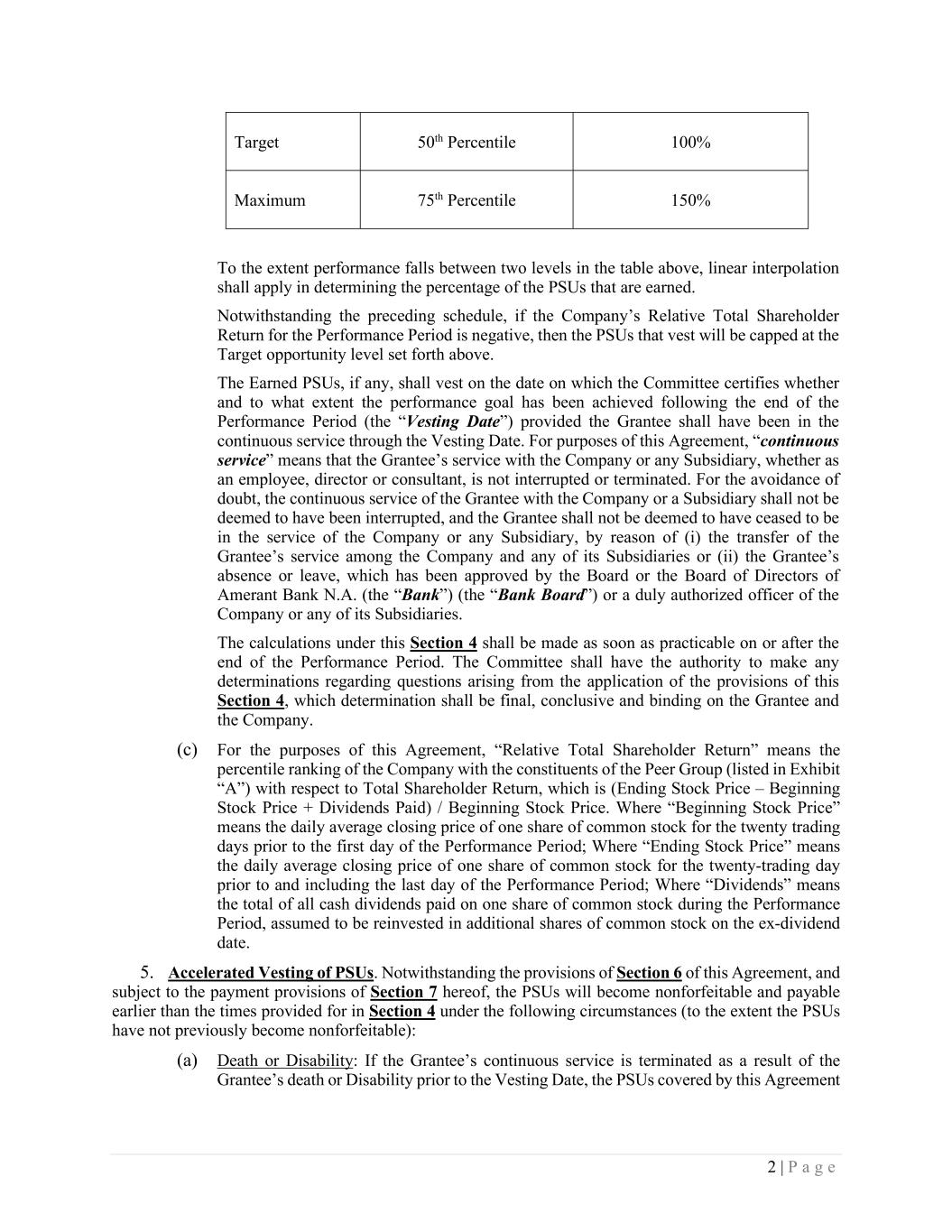 2 | P a g e Target 50th Percentile 100% Maximum 75th Percentile 150% To the extent performance falls between two levels in the table above, linear interpolation shall apply in determining the percentage of the PSUs that are earned. Notwithstanding the preceding schedule, if the Company’s Relative Total Shareholder Return for the Performance Period is negative, then the PSUs that vest will be capped at the Target opportunity level set forth above. The Earned PSUs, if any, shall vest on the date on which the Committee certifies whether and to what extent the performance goal has been achieved following the end of the Performance Period (the “Vesting Date”) provided the Grantee shall have been in the continuous service through the Vesting Date. For purposes of this Agreement, “continuous service” means that the Grantee’s service with the Company or any Subsidiary, whether as an employee, director or consultant, is not interrupted or terminated. For the avoidance of doubt, the continuous service of the Grantee with the Company or a Subsidiary shall not be deemed to have been interrupted, and the Grantee shall not be deemed to have ceased to be in the service of the Company or any Subsidiary, by reason of (i) the transfer of the Grantee’s service among the Company and any of its Subsidiaries or (ii) the Grantee’s absence or leave, which has been approved by the Board or the Board of Directors of Amerant Bank N.A. (the “Bank”) (the “Bank Board”) or a duly authorized officer of the Company or any of its Subsidiaries. The calculations under this Section 4 shall be made as soon as practicable on or after the end of the Performance Period. The Committee shall have the authority to make any determinations regarding questions arising from the application of the provisions of this Section 4, which determination shall be final, conclusive and binding on the Grantee and the Company. (c) For the purposes of this Agreement, “Relative Total Shareholder Return” means the percentile ranking of the Company with the constituents of the Peer Group (listed in Exhibit “A”) with respect to Total Shareholder Return, which is (Ending Stock Price – Beginning Stock Price + Dividends Paid) / Beginning Stock Price. Where “Beginning Stock Price” means the daily average closing price of one share of common stock for the twenty trading days prior to the first day of the Performance Period; Where “Ending Stock Price” means the daily average closing price of one share of common stock for the twenty-trading day prior to and including the last day of the Performance Period; Where “Dividends” means the total of all cash dividends paid on one share of common stock during the Performance Period, assumed to be reinvested in additional shares of common stock on the ex-dividend date. 5. Accelerated Vesting of PSUs. Notwithstanding the provisions of Section 6 of this Agreement, and subject to the payment provisions of Section 7 hereof, the PSUs will become nonforfeitable and payable earlier than the times provided for in Section 4 under the following circumstances (to the extent the PSUs have not previously become nonforfeitable): (a) Death or Disability: If the Grantee’s continuous service is terminated as a result of the Grantee’s death or Disability prior to the Vesting Date, the PSUs covered by this Agreement
