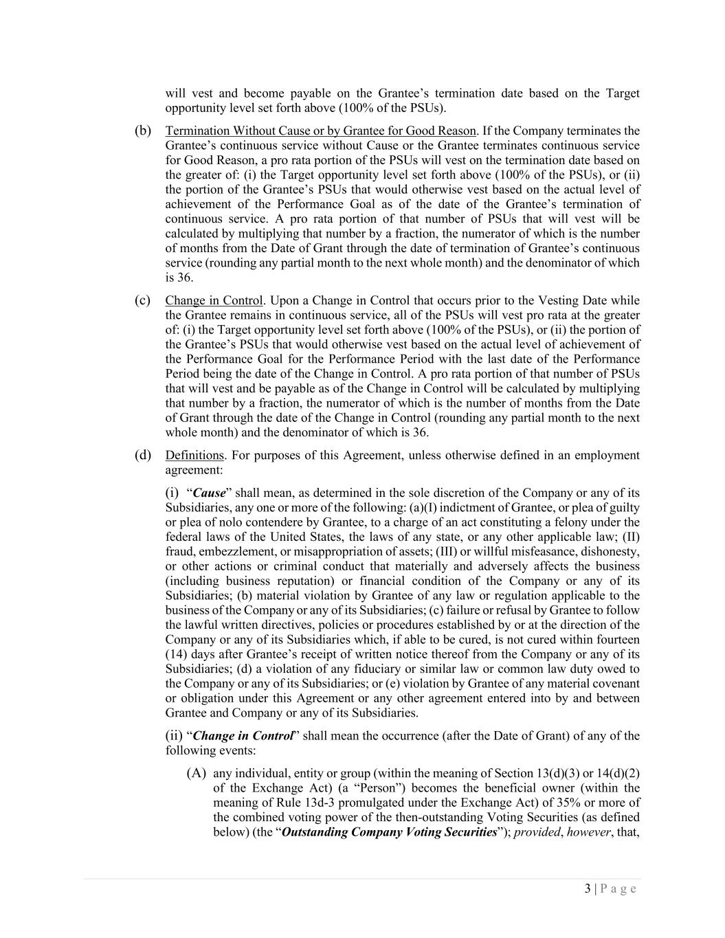 3 | P a g e will vest and become payable on the Grantee’s termination date based on the Target opportunity level set forth above (100% of the PSUs). (b) Termination Without Cause or by Grantee for Good Reason. If the Company terminates the Grantee’s continuous service without Cause or the Grantee terminates continuous service for Good Reason, a pro rata portion of the PSUs will vest on the termination date based on the greater of: (i) the Target opportunity level set forth above (100% of the PSUs), or (ii) the portion of the Grantee’s PSUs that would otherwise vest based on the actual level of achievement of the Performance Goal as of the date of the Grantee’s termination of continuous service. A pro rata portion of that number of PSUs that will vest will be calculated by multiplying that number by a fraction, the numerator of which is the number of months from the Date of Grant through the date of termination of Grantee’s continuous service (rounding any partial month to the next whole month) and the denominator of which is 36. (c) Change in Control. Upon a Change in Control that occurs prior to the Vesting Date while the Grantee remains in continuous service, all of the PSUs will vest pro rata at the greater of: (i) the Target opportunity level set forth above (100% of the PSUs), or (ii) the portion of the Grantee’s PSUs that would otherwise vest based on the actual level of achievement of the Performance Goal for the Performance Period with the last date of the Performance Period being the date of the Change in Control. A pro rata portion of that number of PSUs that will vest and be payable as of the Change in Control will be calculated by multiplying that number by a fraction, the numerator of which is the number of months from the Date of Grant through the date of the Change in Control (rounding any partial month to the next whole month) and the denominator of which is 36. (d) Definitions. For purposes of this Agreement, unless otherwise defined in an employment agreement: (i) “Cause” shall mean, as determined in the sole discretion of the Company or any of its Subsidiaries, any one or more of the following: (a)(I) indictment of Grantee, or plea of guilty or plea of nolo contendere by Grantee, to a charge of an act constituting a felony under the federal laws of the United States, the laws of any state, or any other applicable law; (II) fraud, embezzlement, or misappropriation of assets; (III) or willful misfeasance, dishonesty, or other actions or criminal conduct that materially and adversely affects the business (including business reputation) or financial condition of the Company or any of its Subsidiaries; (b) material violation by Grantee of any law or regulation applicable to the business of the Company or any of its Subsidiaries; (c) failure or refusal by Grantee to follow the lawful written directives, policies or procedures established by or at the direction of the Company or any of its Subsidiaries which, if able to be cured, is not cured within fourteen (14) days after Grantee’s receipt of written notice thereof from the Company or any of its Subsidiaries; (d) a violation of any fiduciary or similar law or common law duty owed to the Company or any of its Subsidiaries; or (e) violation by Grantee of any material covenant or obligation under this Agreement or any other agreement entered into by and between Grantee and Company or any of its Subsidiaries. (ii) “Change in Control” shall mean the occurrence (after the Date of Grant) of any of the following events: (A) any individual, entity or group (within the meaning of Section 13(d)(3) or 14(d)(2) of the Exchange Act) (a “Person”) becomes the beneficial owner (within the meaning of Rule 13d-3 promulgated under the Exchange Act) of 35% or more of the combined voting power of the then-outstanding Voting Securities (as defined below) (the “Outstanding Company Voting Securities”); provided, however, that,