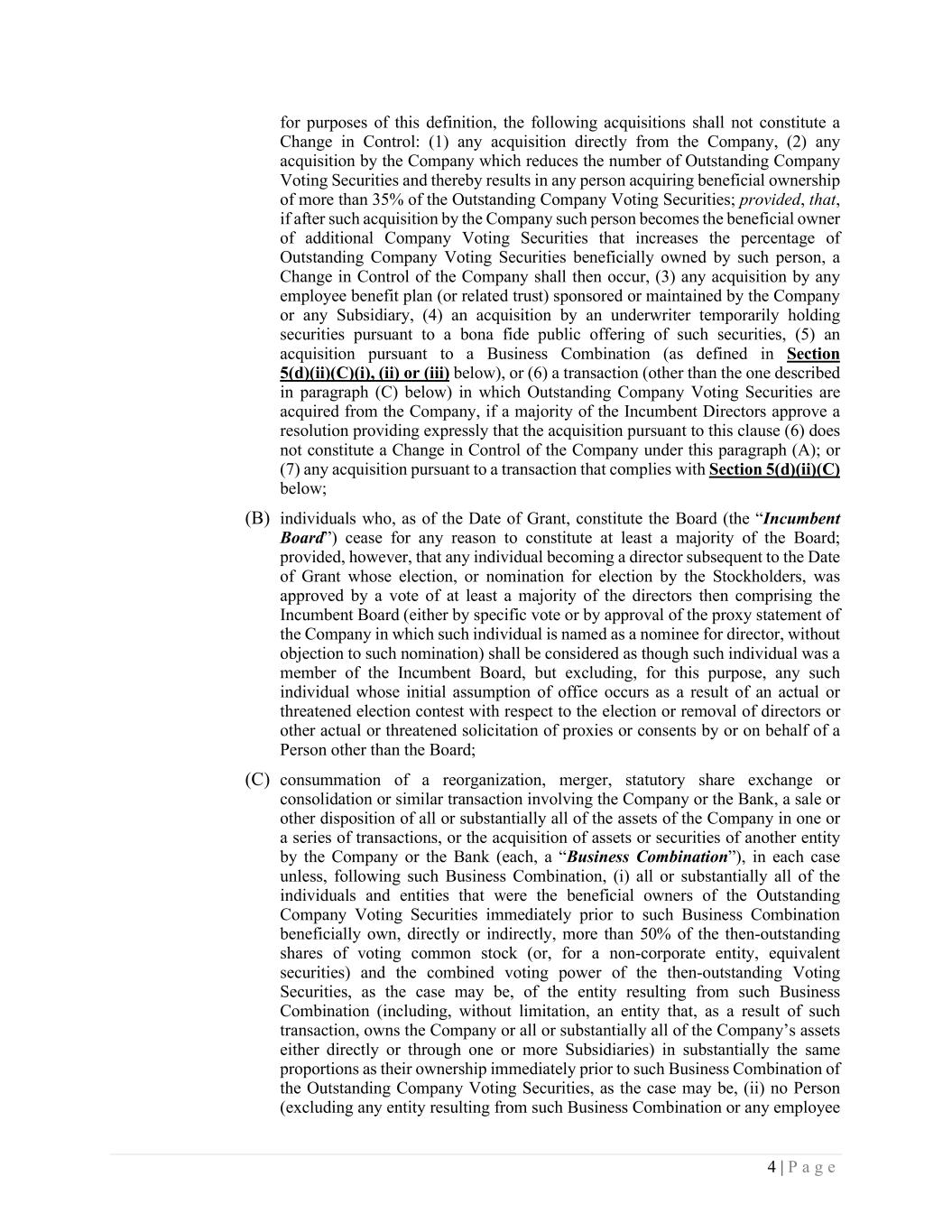 4 | P a g e for purposes of this definition, the following acquisitions shall not constitute a Change in Control: (1) any acquisition directly from the Company, (2) any acquisition by the Company which reduces the number of Outstanding Company Voting Securities and thereby results in any person acquiring beneficial ownership of more than 35% of the Outstanding Company Voting Securities; provided, that, if after such acquisition by the Company such person becomes the beneficial owner of additional Company Voting Securities that increases the percentage of Outstanding Company Voting Securities beneficially owned by such person, a Change in Control of the Company shall then occur, (3) any acquisition by any employee benefit plan (or related trust) sponsored or maintained by the Company or any Subsidiary, (4) an acquisition by an underwriter temporarily holding securities pursuant to a bona fide public offering of such securities, (5) an acquisition pursuant to a Business Combination (as defined in Section 5(d)(ii)(C)(i), (ii) or (iii) below), or (6) a transaction (other than the one described in paragraph (C) below) in which Outstanding Company Voting Securities are acquired from the Company, if a majority of the Incumbent Directors approve a resolution providing expressly that the acquisition pursuant to this clause (6) does not constitute a Change in Control of the Company under this paragraph (A); or (7) any acquisition pursuant to a transaction that complies with Section 5(d)(ii)(C) below; (B) individuals who, as of the Date of Grant, constitute the Board (the “Incumbent Board”) cease for any reason to constitute at least a majority of the Board; provided, however, that any individual becoming a director subsequent to the Date of Grant whose election, or nomination for election by the Stockholders, was approved by a vote of at least a majority of the directors then comprising the Incumbent Board (either by specific vote or by approval of the proxy statement of the Company in which such individual is named as a nominee for director, without objection to such nomination) shall be considered as though such individual was a member of the Incumbent Board, but excluding, for this purpose, any such individual whose initial assumption of office occurs as a result of an actual or threatened election contest with respect to the election or removal of directors or other actual or threatened solicitation of proxies or consents by or on behalf of a Person other than the Board; (C) consummation of a reorganization, merger, statutory share exchange or consolidation or similar transaction involving the Company or the Bank, a sale or other disposition of all or substantially all of the assets of the Company in one or a series of transactions, or the acquisition of assets or securities of another entity by the Company or the Bank (each, a “Business Combination”), in each case unless, following such Business Combination, (i) all or substantially all of the individuals and entities that were the beneficial owners of the Outstanding Company Voting Securities immediately prior to such Business Combination beneficially own, directly or indirectly, more than 50% of the then-outstanding shares of voting common stock (or, for a non-corporate entity, equivalent securities) and the combined voting power of the then-outstanding Voting Securities, as the case may be, of the entity resulting from such Business Combination (including, without limitation, an entity that, as a result of such transaction, owns the Company or all or substantially all of the Company’s assets either directly or through one or more Subsidiaries) in substantially the same proportions as their ownership immediately prior to such Business Combination of the Outstanding Company Voting Securities, as the case may be, (ii) no Person (excluding any entity resulting from such Business Combination or any employee