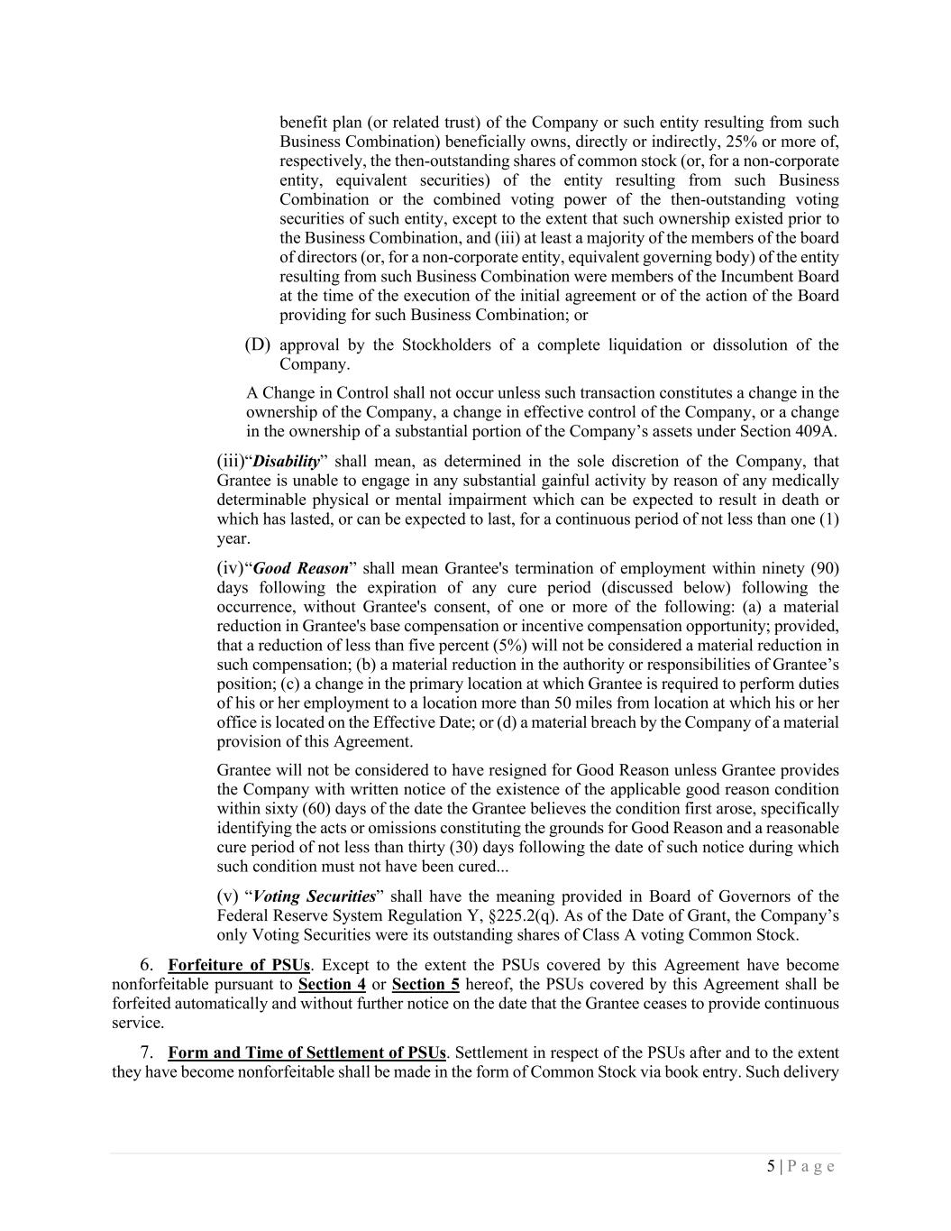 5 | P a g e benefit plan (or related trust) of the Company or such entity resulting from such Business Combination) beneficially owns, directly or indirectly, 25% or more of, respectively, the then-outstanding shares of common stock (or, for a non-corporate entity, equivalent securities) of the entity resulting from such Business Combination or the combined voting power of the then-outstanding voting securities of such entity, except to the extent that such ownership existed prior to the Business Combination, and (iii) at least a majority of the members of the board of directors (or, for a non-corporate entity, equivalent governing body) of the entity resulting from such Business Combination were members of the Incumbent Board at the time of the execution of the initial agreement or of the action of the Board providing for such Business Combination; or (D) approval by the Stockholders of a complete liquidation or dissolution of the Company. A Change in Control shall not occur unless such transaction constitutes a change in the ownership of the Company, a change in effective control of the Company, or a change in the ownership of a substantial portion of the Company’s assets under Section 409A. (iii)“Disability” shall mean, as determined in the sole discretion of the Company, that Grantee is unable to engage in any substantial gainful activity by reason of any medically determinable physical or mental impairment which can be expected to result in death or which has lasted, or can be expected to last, for a continuous period of not less than one (1) year. (iv) “Good Reason” shall mean Grantee's termination of employment within ninety (90) days following the expiration of any cure period (discussed below) following the occurrence, without Grantee's consent, of one or more of the following: (a) a material reduction in Grantee's base compensation or incentive compensation opportunity; provided, that a reduction of less than five percent (5%) will not be considered a material reduction in such compensation; (b) a material reduction in the authority or responsibilities of Grantee’s position; (c) a change in the primary location at which Grantee is required to perform duties of his or her employment to a location more than 50 miles from location at which his or her office is located on the Effective Date; or (d) a material breach by the Company of a material provision of this Agreement. Grantee will not be considered to have resigned for Good Reason unless Grantee provides the Company with written notice of the existence of the applicable good reason condition within sixty (60) days of the date the Grantee believes the condition first arose, specifically identifying the acts or omissions constituting the grounds for Good Reason and a reasonable cure period of not less than thirty (30) days following the date of such notice during which such condition must not have been cured... (v) “Voting Securities” shall have the meaning provided in Board of Governors of the Federal Reserve System Regulation Y, §225.2(q). As of the Date of Grant, the Company’s only Voting Securities were its outstanding shares of Class A voting Common Stock. 6. Forfeiture of PSUs. Except to the extent the PSUs covered by this Agreement have become nonforfeitable pursuant to Section 4 or Section 5 hereof, the PSUs covered by this Agreement shall be forfeited automatically and without further notice on the date that the Grantee ceases to provide continuous service. 7. Form and Time of Settlement of PSUs. Settlement in respect of the PSUs after and to the extent they have become nonforfeitable shall be made in the form of Common Stock via book entry. Such delivery